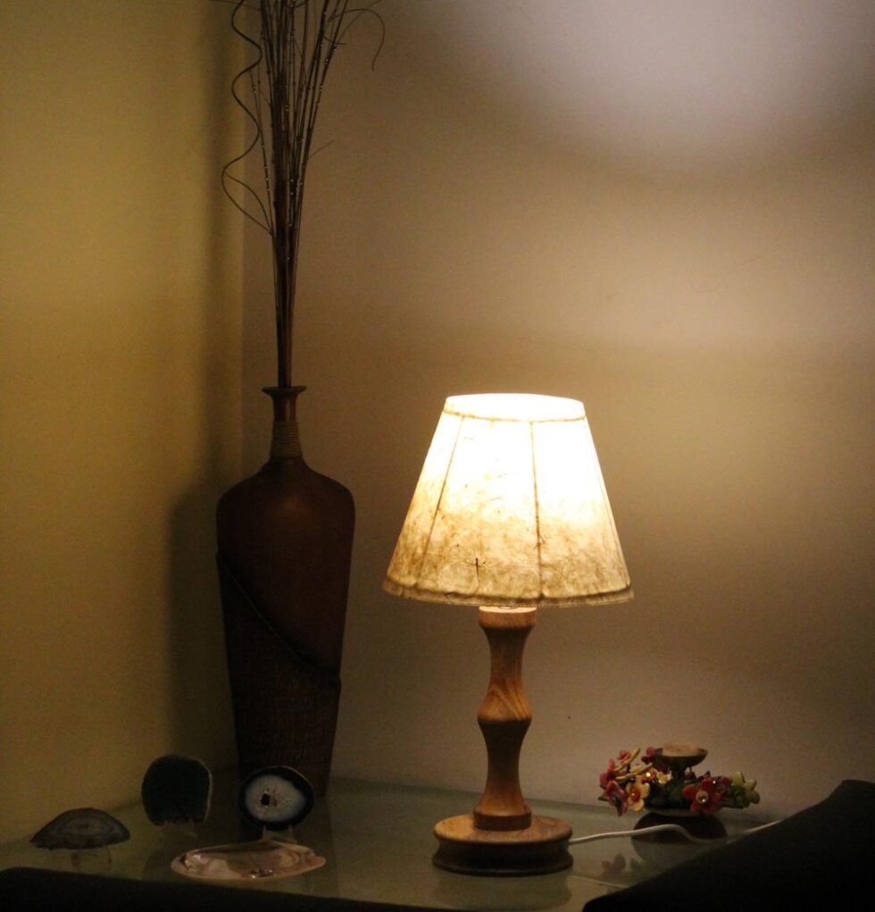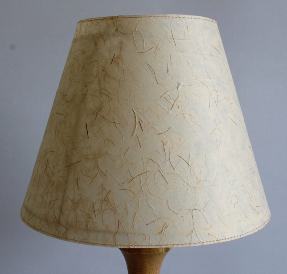 Lampshade from 100% banana fiber organic paper – purely recycled & handmade. A truly aesthetic décor catering to high class taste satisfying environmental concerns. Handcrafted by our premium artisans for the top quality international markets. A thin lining of acetate is given underneath the paper for the durability of the shade! The light shimmering out is so unique and carries a classy theme for any type of room / balcony / garden & bar. Tiny incursions of the dyed banana fiber and the colorful paper release spectacular light around. Shade supported by classy handcrafted wooden stand made of exclusive mango wood -further treated with better finish and carefully polished for the durability. A 2 meter long wire is given to its sturdy wooden base with on / off switch facility.