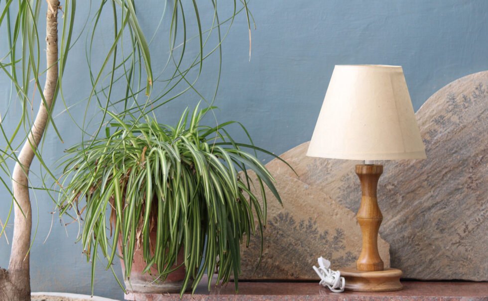 Lampshade from 100% banana fiber organic paper – purely recycled & handmade. A truly aesthetic décor catering to high class taste satisfying environmental concerns. Handcrafted by our premium artisans for the top quality international markets. A thin lining of acetate is given underneath the paper for the durability of the shade! The light shimmering out is so unique and carries a classy theme for any type of room / balcony / garden & bar. Tiny incursions of the dyed banana fiber and the colorful paper release spectacular light around. Shade supported by classy handcrafted wooden stand made of exclusive mango wood -further treated with better finish and carefully polished for the durability. A 2 meter long wire is given to its sturdy wooden base with on / off switch facility.