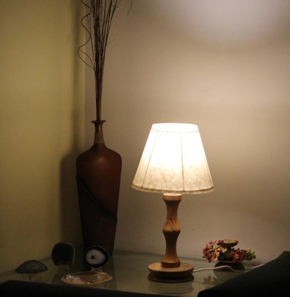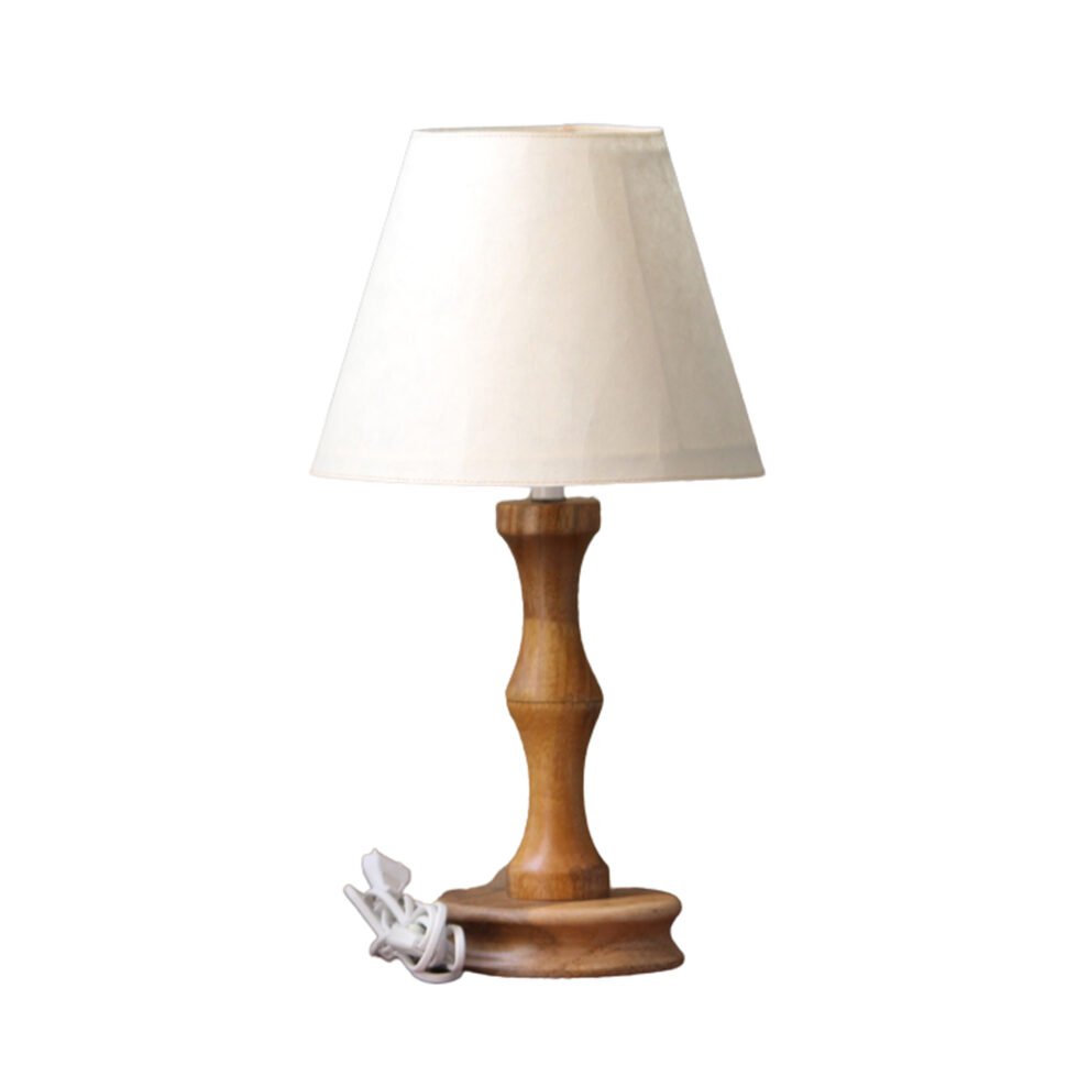 Lampshade from 100% banana fiber organic paper – purely recycled & handmade. A truly aesthetic décor catering to high class taste satisfying environmental concerns. Handcrafted by our premium artisans for the top quality international markets. A thin lining of acetate is given underneath the paper for the durability of the shade! The light shimmering out is so unique and carries a classy theme for any type of room / balcony / garden & bar. Tiny incursions of the dyed banana fiber and the colorful paper release spectacular light around. Shade supported by classy handcrafted wooden stand made of exclusive mango wood -further treated with better finish and carefully polished for the durability. A 2 meter long wire is given to its sturdy wooden base with on / off switch facility.