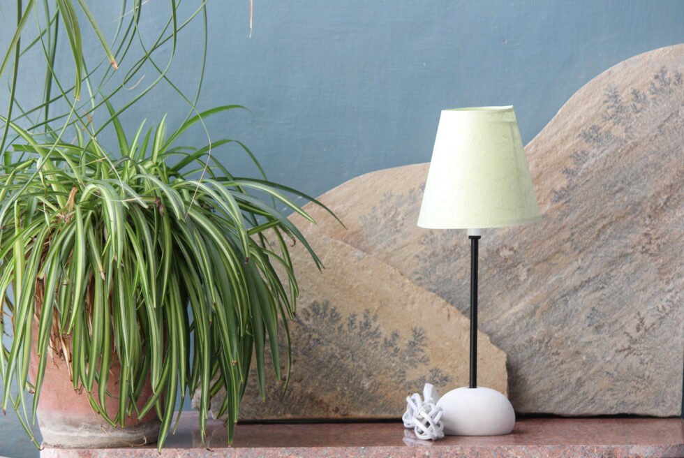 Lampshade from 100% banana fiber organic paper – purely recycled & handmade. A truly aesthetic décor catering to high class taste satisfying environmental concerns. Handcrafted by our premium artisans for the top quality international markets. A thin lining of acetate is given underneath the paper for the durability of the shade! The light shimmering out is so unique and carries a classy theme for any type of room / balcony / garden & bar. Tiny incursions of the dyed banana fiber and the colorful paper release spectacular light around. Shade supported by a thin wrought iron pipe as stand. On the top is the standard bulb holder while for the base there is sturdy white high quality marble 0.750 kg stone in oval shape! The lamp looks stunning yet simple – a wonderful handcrafted piece for elegant décor. A 2 meter long wire is given to its sturdy marble base with on / off switch facility.
