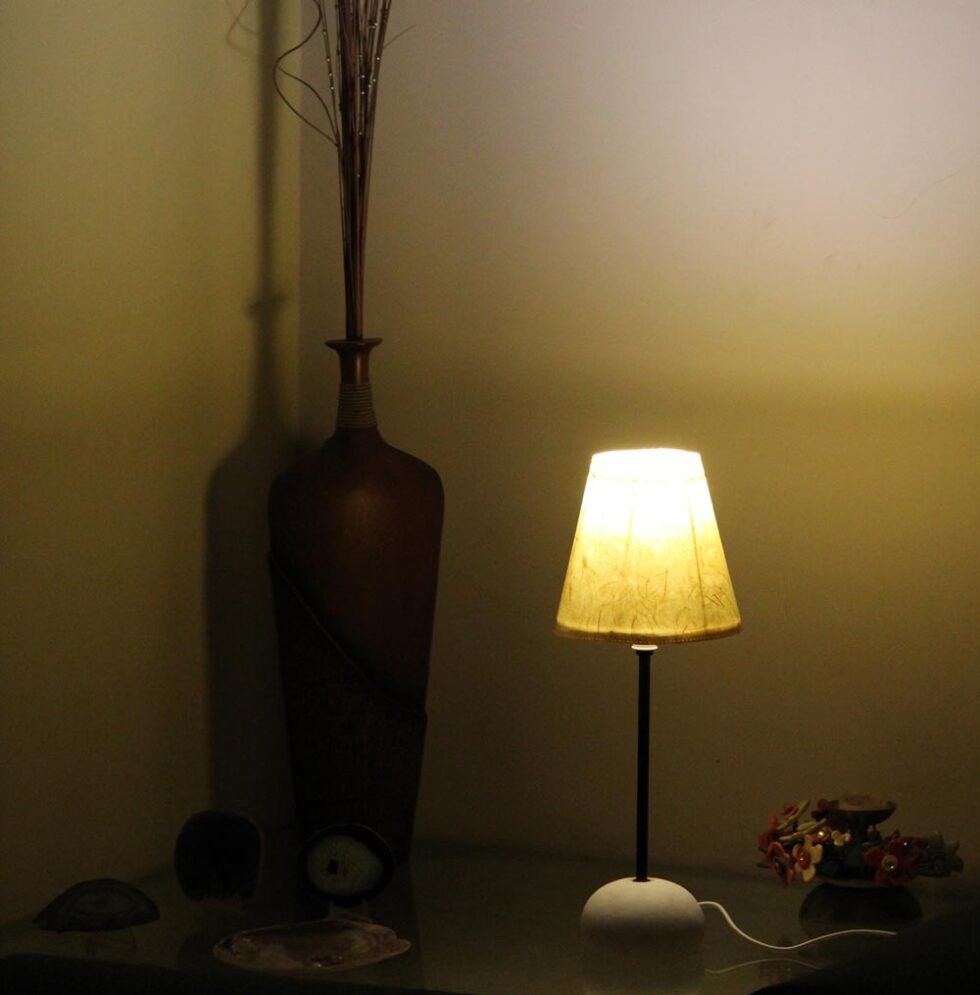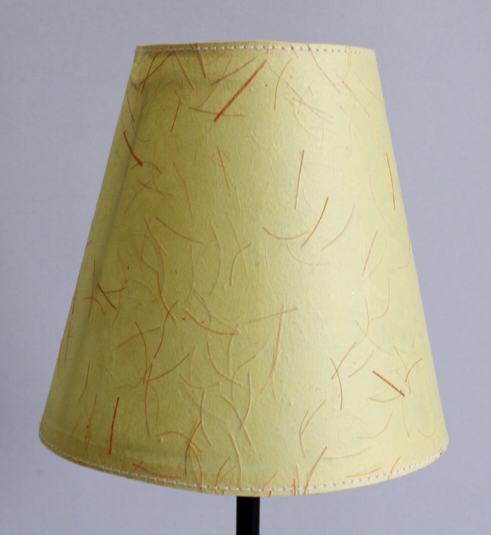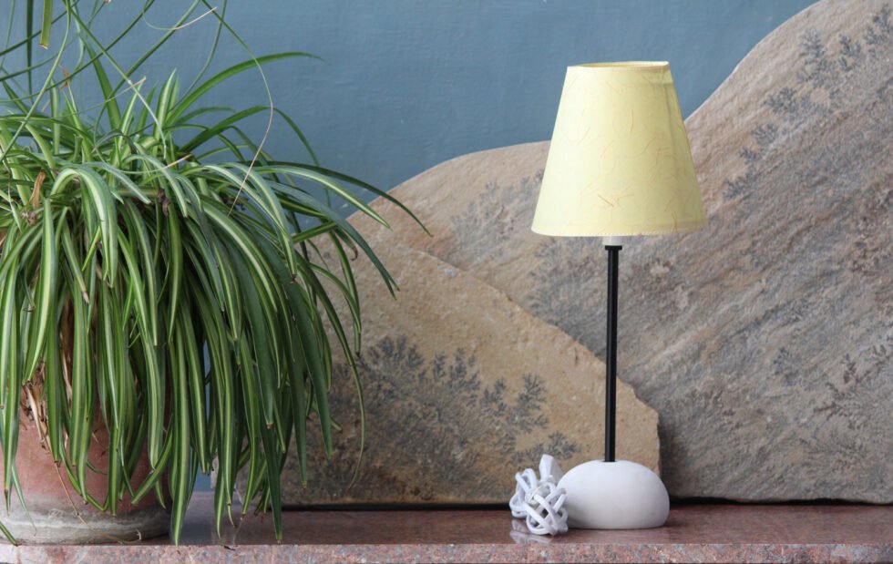 Lampshade from 100% banana fiber organic paper – purely recycled & handmade. A truly aesthetic décor catering to high class taste satisfying environmental concerns. Handcrafted by our premium artisans for the top quality international markets. A thin lining of acetate is given underneath the paper for the durability of the shade! The light shimmering out is so unique and carries a classy theme for any type of room / balcony / garden & bar. Tiny incursions of the dyed banana fiber and the colorful paper release spectacular light around. Shade supported by a thin wrought iron pipe as stand. On the top is the standard bulb holder while for the base there is sturdy white high quality marble 0.750 kg stone in oval shape! The lamp looks stunning yet simple – a wonderful handcrafted piece for elegant décor. A 2 meter long wire is given to its sturdy marble base with on / off switch facility.