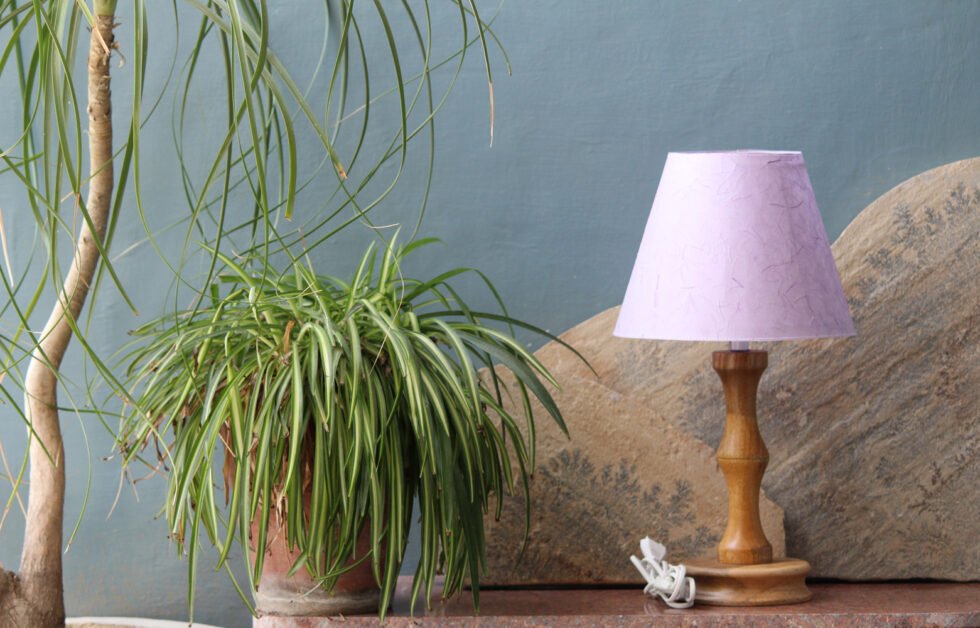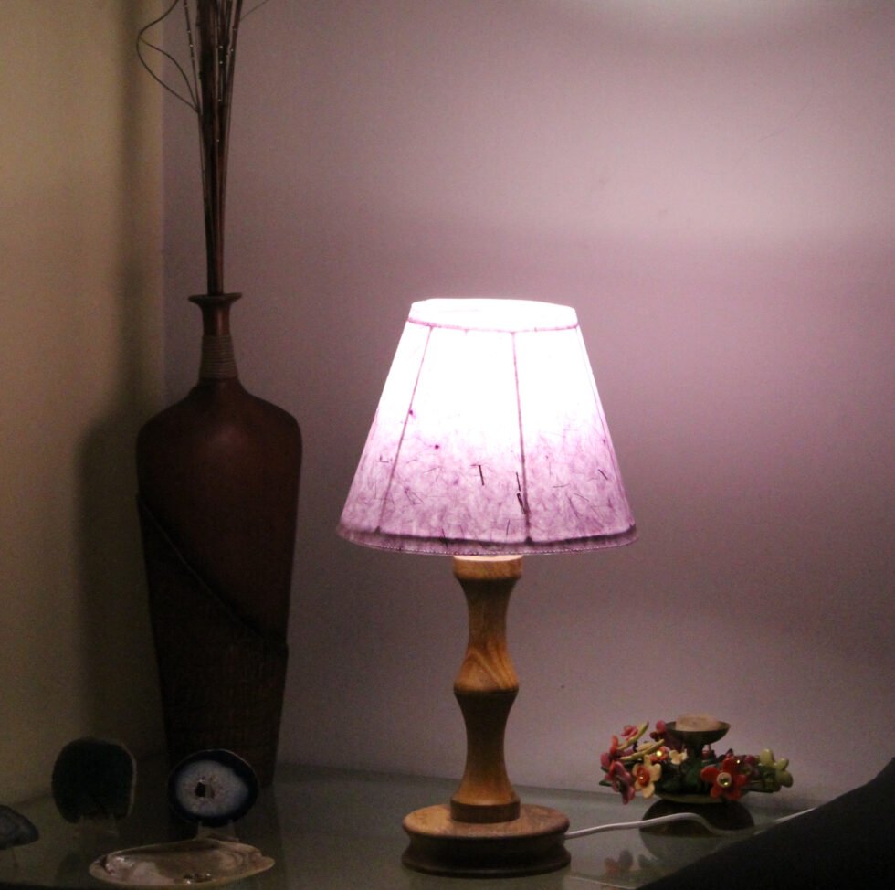 Lampshade from 100% banana fiber organic paper – purely recycled & handmade. A truly aesthetic décor catering to high class taste satisfying environmental concerns. Handcrafted by our premium artisans for the top quality international markets. A thin lining of acetate is given underneath the paper for the durability of the shade! The light shimmering out is so unique and carries a classy theme for any type of room / balcony / garden & bar. Tiny incursions of the dyed banana fiber and the colorful paper release spectacular light around. Shade supported by classy handcrafted wooden stand made of exclusive mango wood -further treated with better finish and carefully polished for the durability. A 2 meter long wire is given to its sturdy wooden base with on / off switch facility.