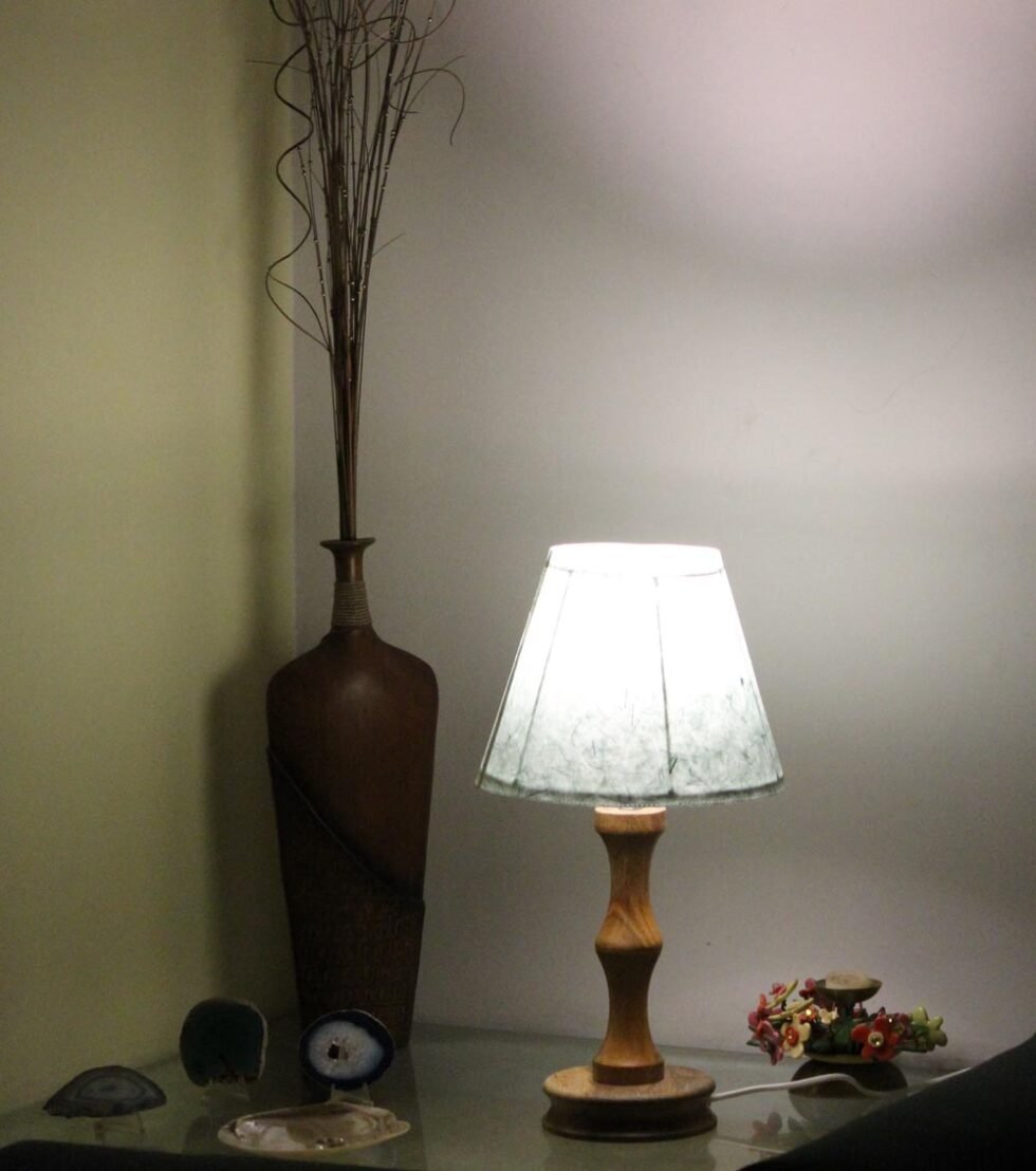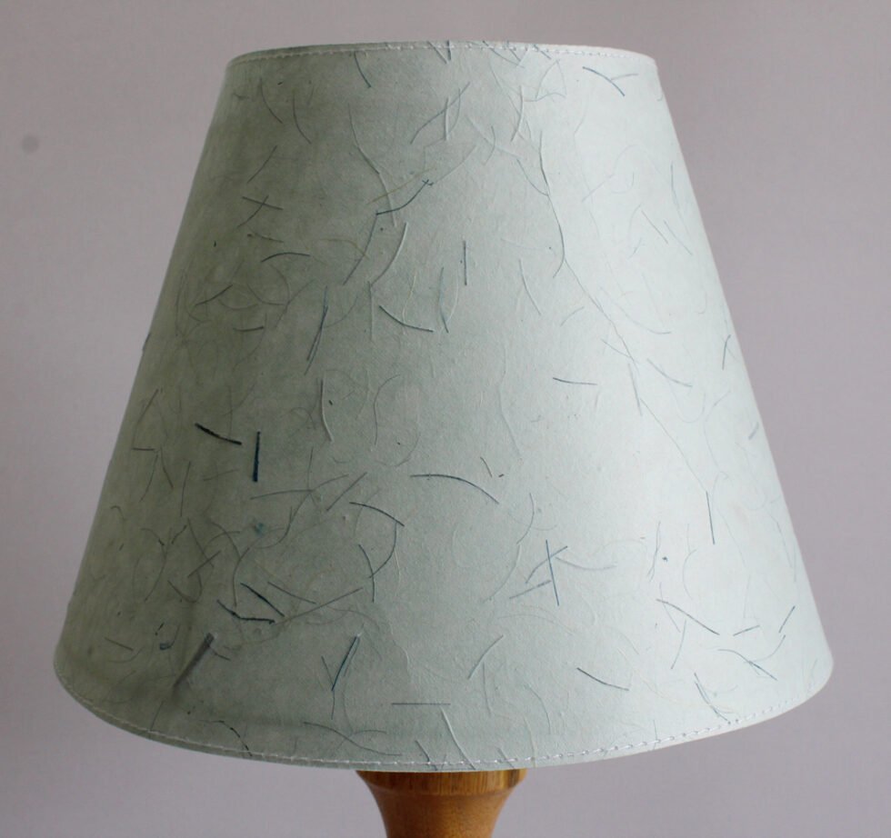 Lampshade from 100% banana fiber organic paper – purely recycled & handmade. A truly aesthetic décor catering to high class taste satisfying environmental concerns. Handcrafted by our premium artisans for the top quality international markets. A thin lining of acetate is given underneath the paper for the durability of the shade! The light shimmering out is so unique and carries a classy theme for any type of room / balcony / garden & bar. Tiny incursions of the dyed banana fiber and the colorful paper release spectacular light around. Shade supported by classy handcrafted wooden stand made of exclusive mango wood -further treated with better finish and carefully polished for the durability. A 2 meter long wire is given to its sturdy wooden base with on / off switch facility.