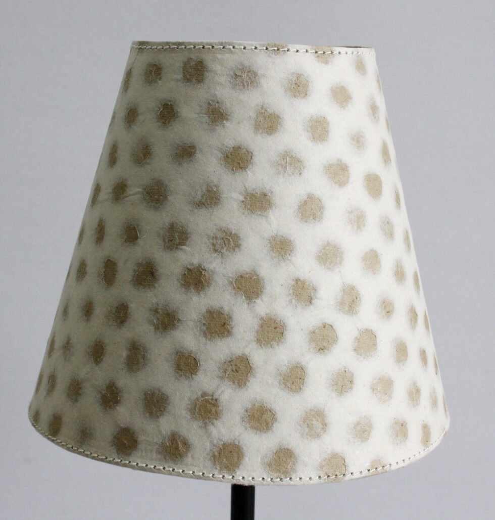 Lampshade from 100% Hemp fiber organic paper together with designed lace paper – purely recycled & handmade. A truly aesthetic décor catering to high class taste satisfying environmental concerns. Handcrafted by our premium artisans for the top quality international markets. A thin lining of acetate OR stiff cotton fabric is given underneath the paper for the durability of the shade! The light shimmering out is so unique and carries a classy theme for any type of room / balcony / garden & bar. Light filtering out from the design pattern of the lace paper release spectacular formation of rays around. ( Height – 15 cm / Lower Diemeter 15 cm / Upper Diemeter 10 cm.)
