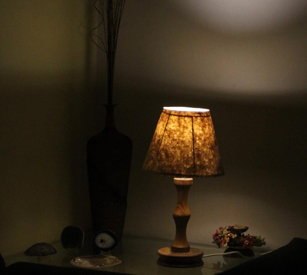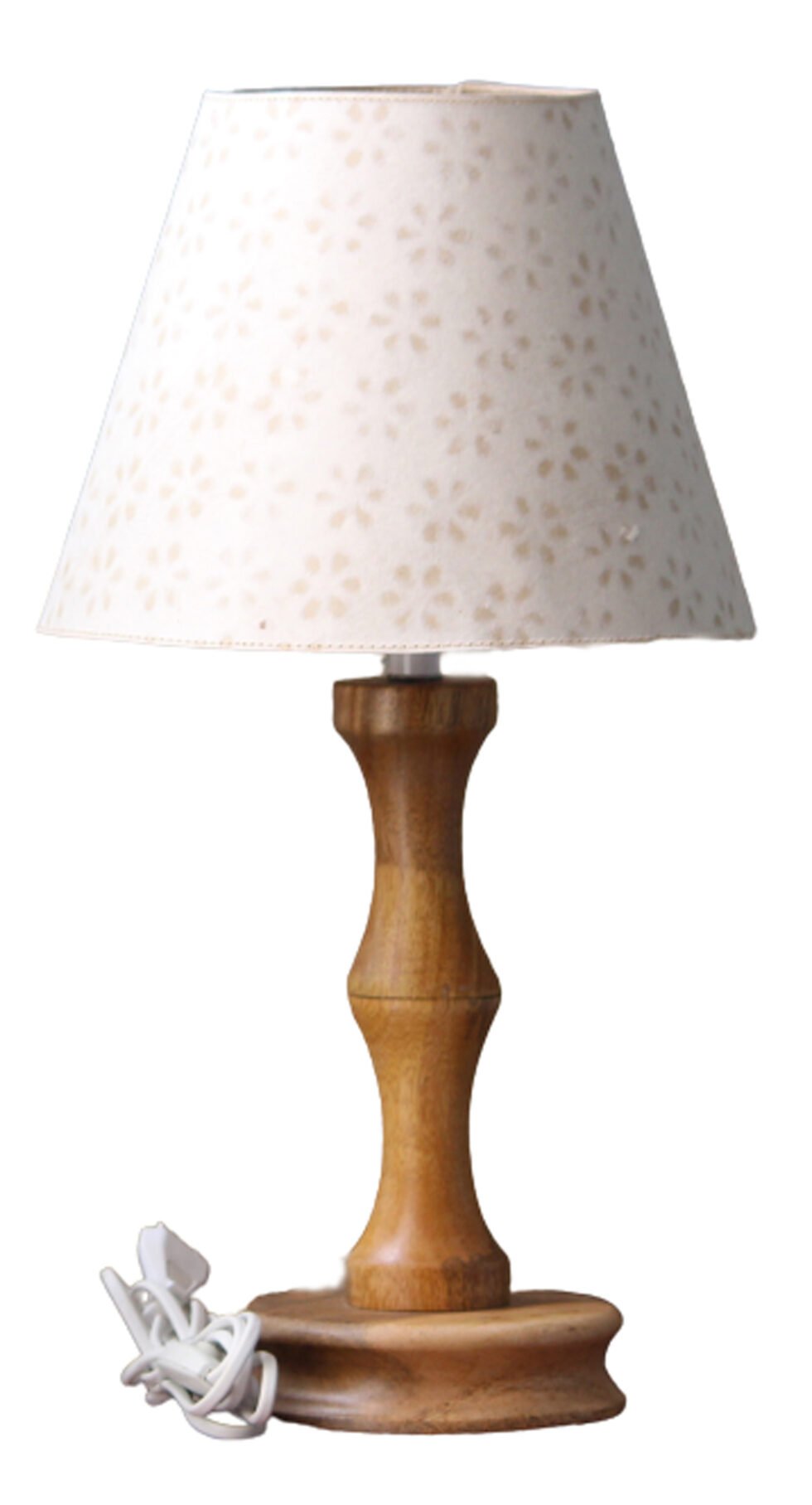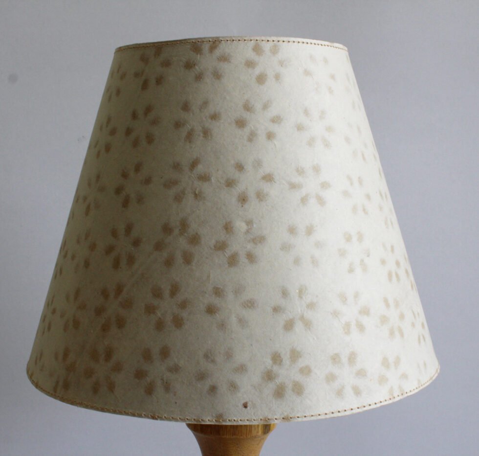 Lampshade from 100% Hemp fiber organic paper together with designed lace paper – purely recycled & handmade. A truly aesthetic décor catering to high class taste satisfying environmental concerns. Handcrafted by our premium artisans for the top quality international markets. A thin lining of acetate is given underneath the paper for the durability of the shade! The light shimmering out is so unique and carries a classy theme for any type of room / balcony / garden & bar. Light filtering out from the design pattern of the lace paper release spectacular formation of rays around. Shade supported by classy handcrafted wooden stand made of exclusive mango wood -further treated with better finish and carefully polished for the durability. A 2 meter long wire is given to its sturdy wooden base with on / off switch facility.