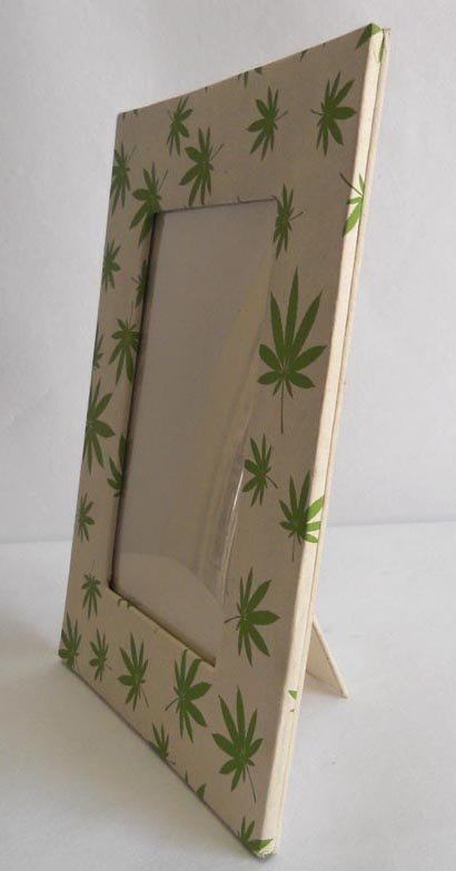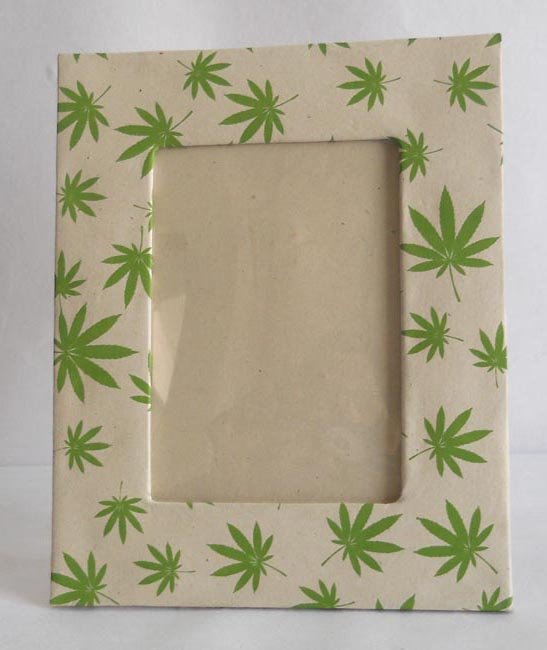 Photo frame made of solid cardboard and 100% hemp paper printed hemp leaves all over it. Any other color of the paper, any other design to be printed can be given. We do branding and can print given logos / details!