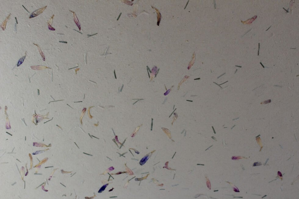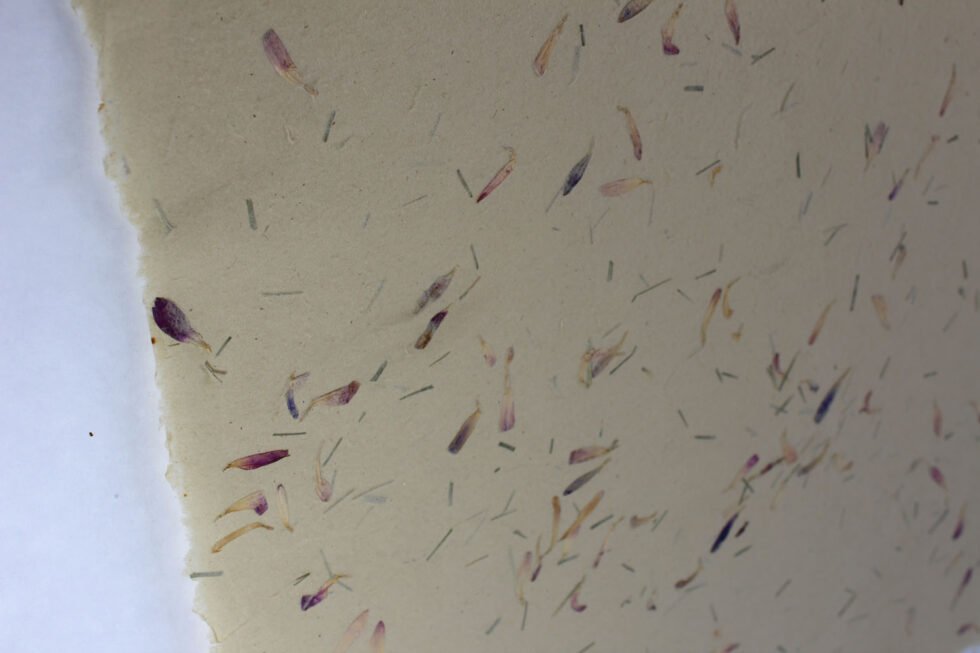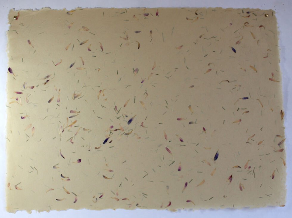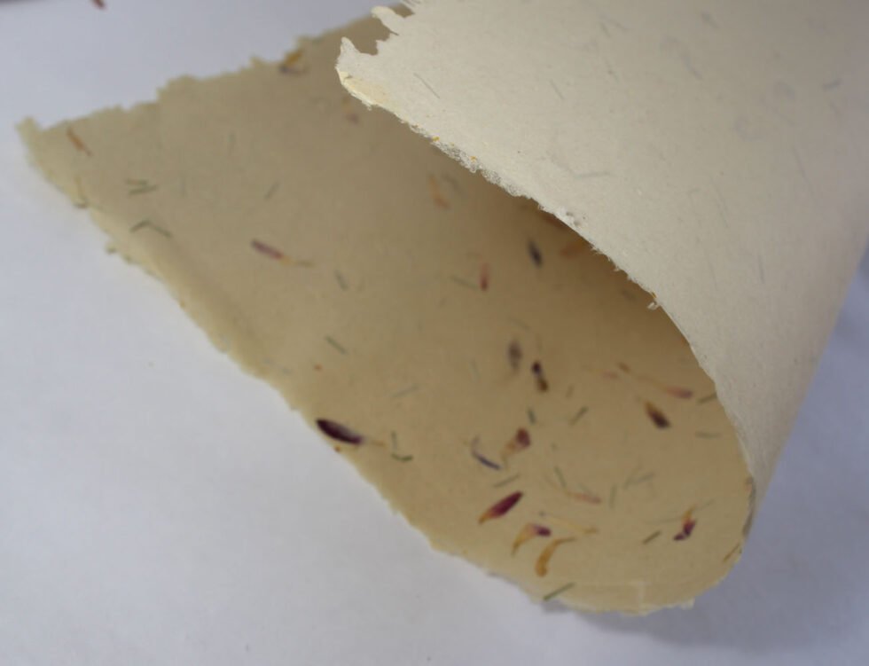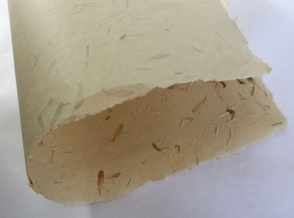 80 GSM Natural color ‘Garden Sheet’ from 100% Jute fiber. With uneven surface and waves all around on the one side of the sheet, paper looks exquisite and rich for multiple uses like gift wrap, art & craft, notebook & boxes covers and even premium shopping bag. Flower petals and fine chopped grass are mottled into the pulp before forming the Garden Sheet.