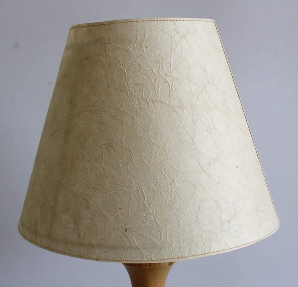 Lampshade from 100% Lokta fiber organic paper – purely recycled & handmade. A truly aesthetic décor catering to high class taste satisfying environmental concerns. Handcrafted by our premium artisans for the top quality international markets. A thin lining of acetate OR stiff cotton fabric is given underneath the paper for the durability of the shade! The light shimmering out is so unique and carries a classy theme for any type of room / balcony / garden or a bar. Tiny incursions of the dyed or natural Lokta fiber and its paper is having ancient Buddhist / Himalayan history and release spectacular light around. ( Height 21 cm / Lower Diemeter 25 cm / Upper Diemeter 15 cm )