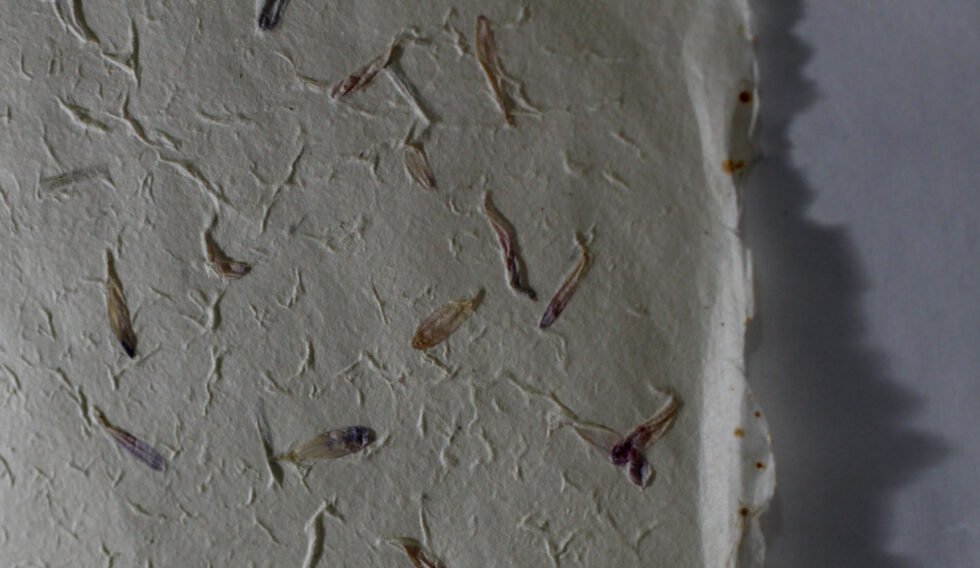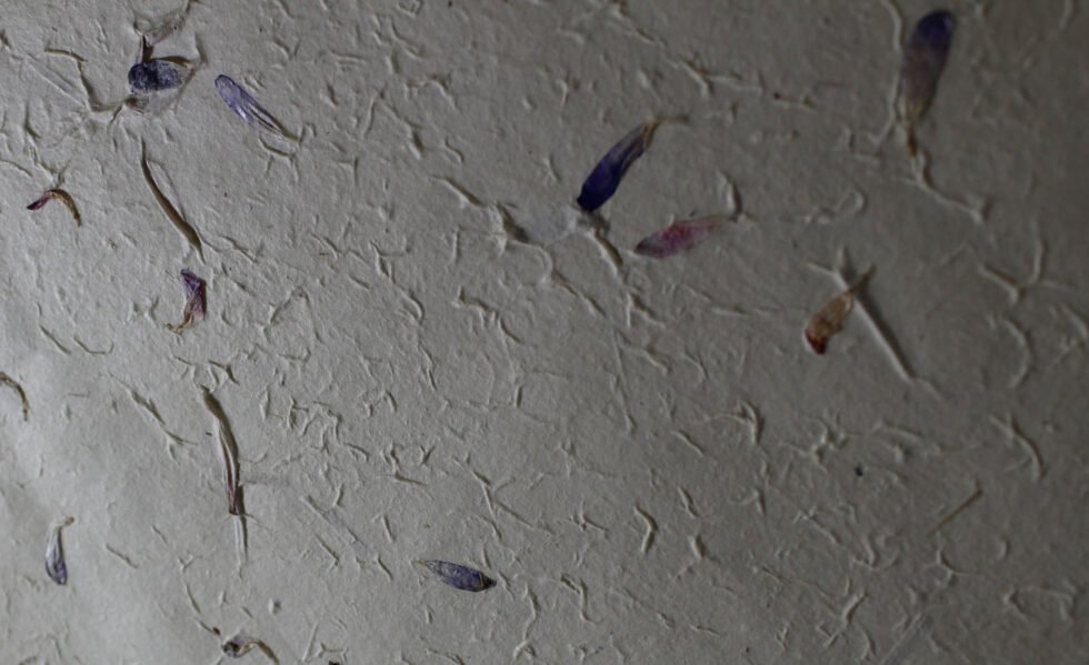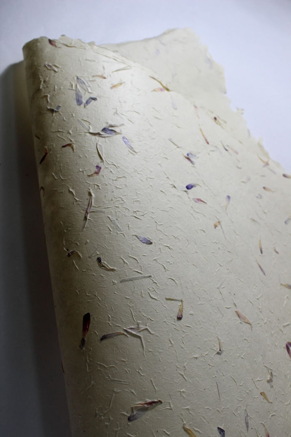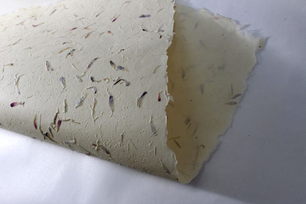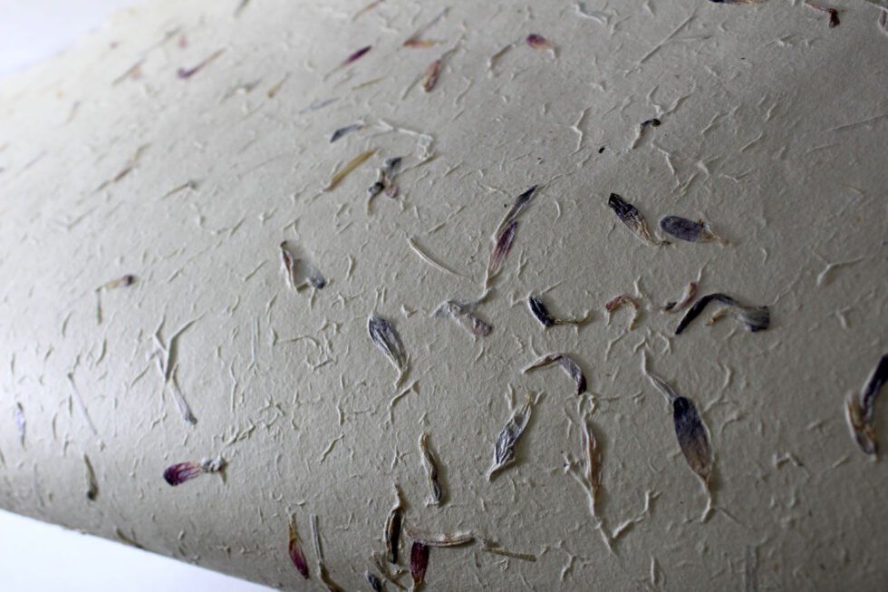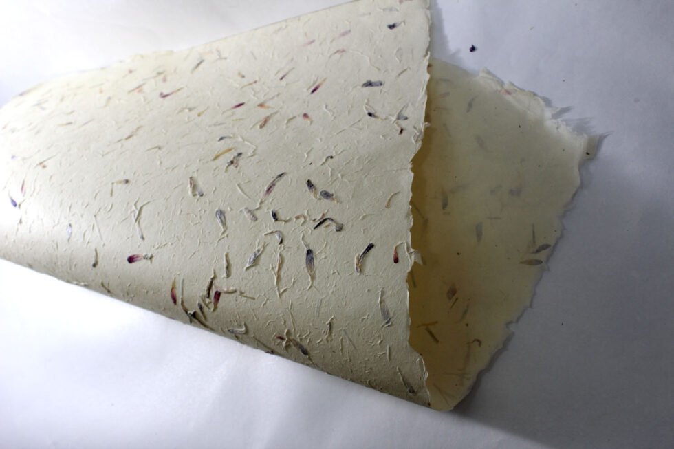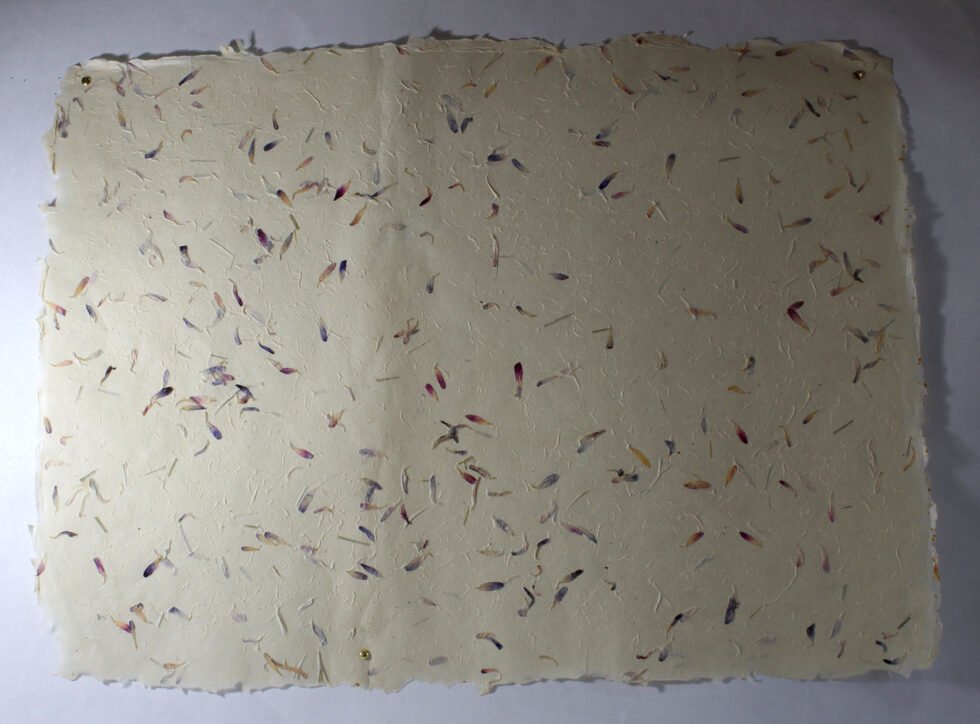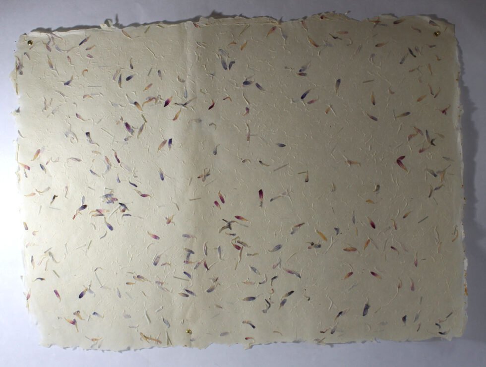 80 GSM Cream colour ‘Garden Sheet’ from 100% Lokta fiber. With uneven surface and waves all around on the one side of the sheet, paper looks exqusitie and rich for multiple uses like gift wrap, art & craft, notebook & boxes covers and even premium shopping bag. Flower petals and fine chopped grass are mottled into the pulp before forming the Garden Sheet.