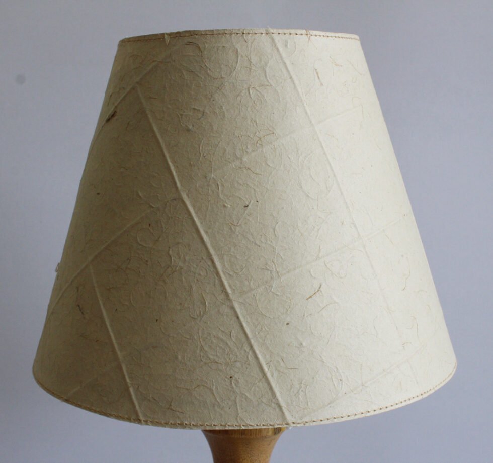 Lampshade from 100% Hemp fiber organic paper – purely recycled & handmade. A truly aesthetic décor catering to high class taste satisfying environmental concerns. Handcrafted by our premium artisans for the top quality international markets. A thin lining of acetate OR stiff cotton fabric is given underneath the paper for the durability of the shade! The light shimmering out is so unique and carries a classy theme for any type of room / balcony / garden & bar. Tiny incursions of the dyed or natural Hemp fiber along with sandwiched cotton thread in between paper sheets release spectacular light around. ( Height 21 cm / Lower Diemeter 25 cm / Upper Diemeter 15 cm. )