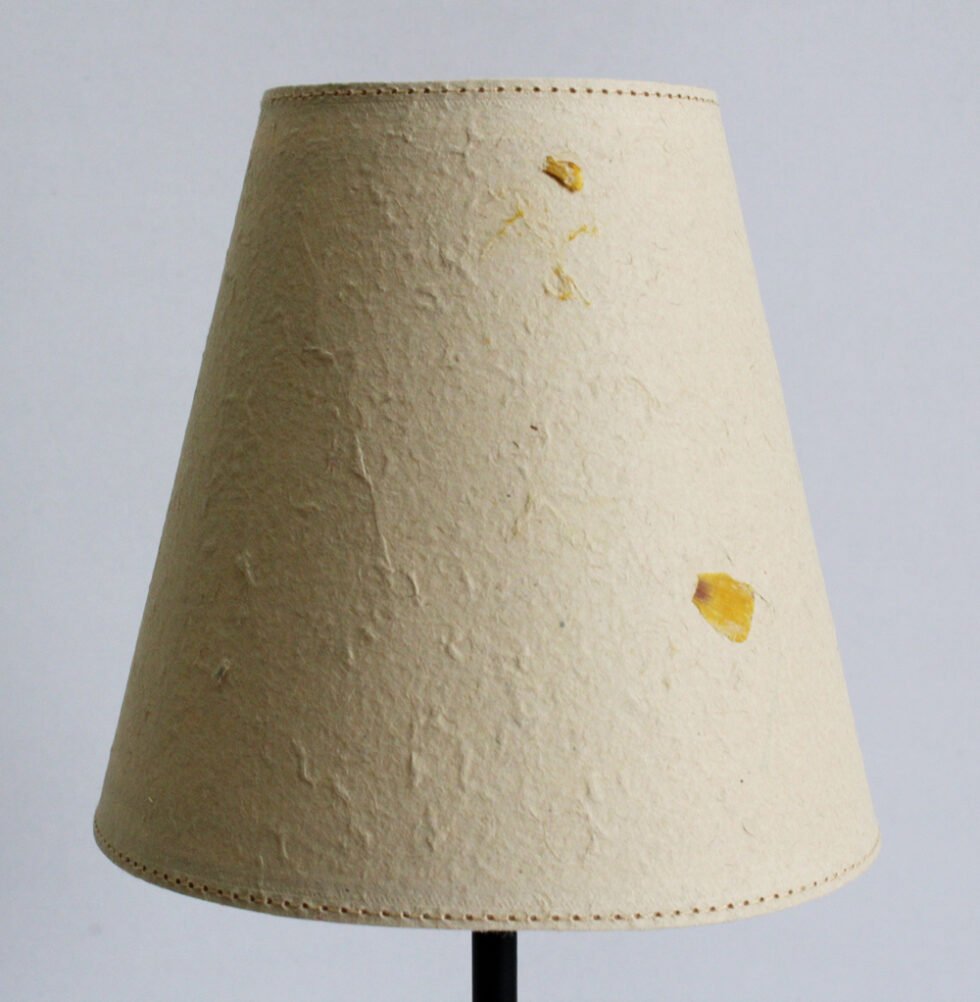 Lampshade from 100% Hemp fiber organic paper – purely recycled & handmade. A truly aesthetic décor catering to high class taste satisfying environmental concerns. Handcrafted by our premium artisans for the top quality international markets. A thin lining of acetate OR stiff cotton fabric is given underneath the paper for the durability of the shade! The light shimmering out is so unique and carries a classy theme for any type of room / balcony / garden & bar. Tiny incursions of the dyed or natural Hemp fiber along with the grass & flower petals release spectacular light around.