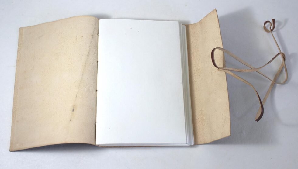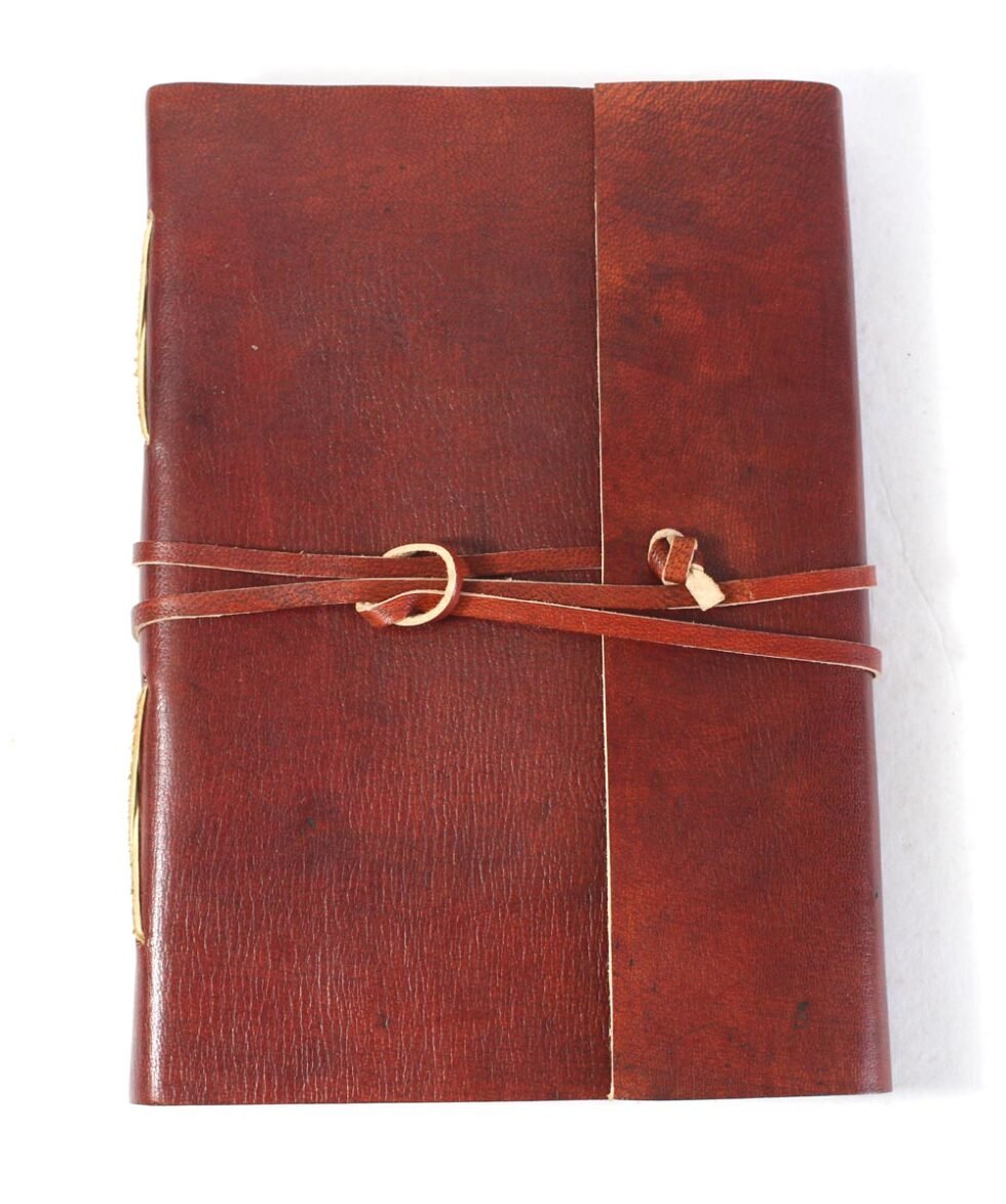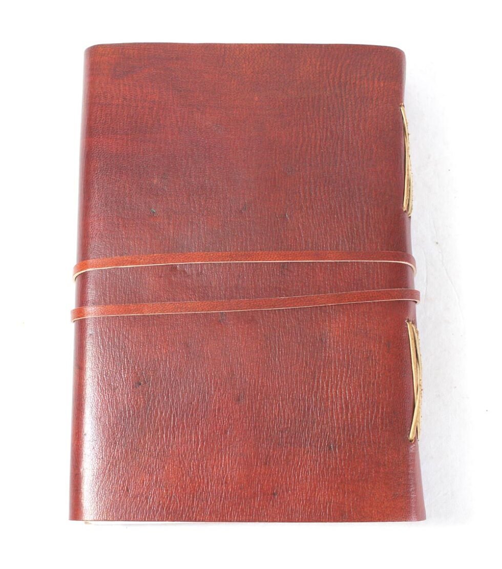 Ethnic style goat leather journal with 80 sheets / 160 pages of recycled cotton handmade paper. The gypsy looking journal matches with the travel theme and serves a good purpose while writing on a vacation or trip…capturing all your moods and feelings inside it. The paper is smooth, absolutely wood free, acid free and never bleeds even with ink pen.    Size Cm :15 x 22 Cm       Size Inch : 6″x 8 3/4″