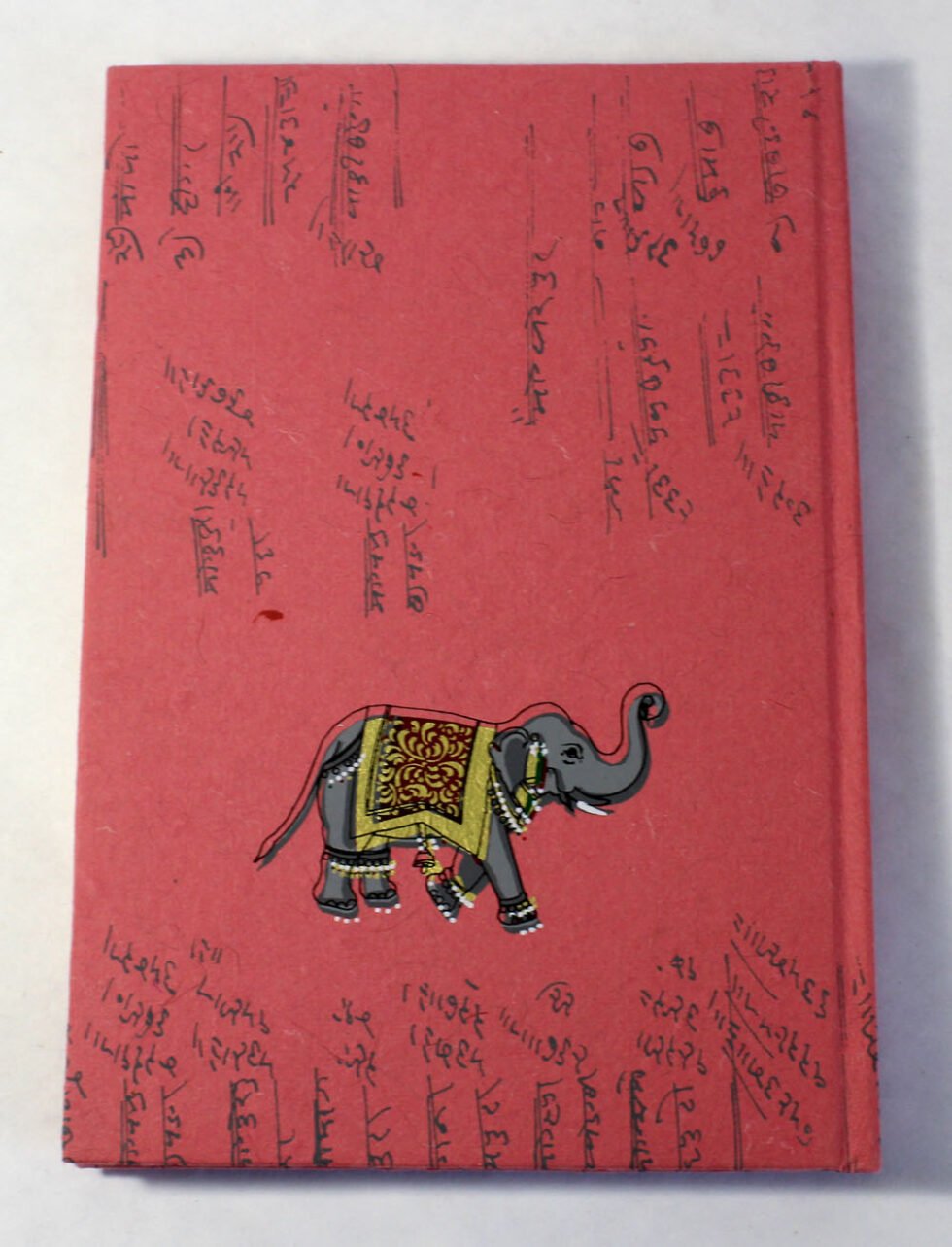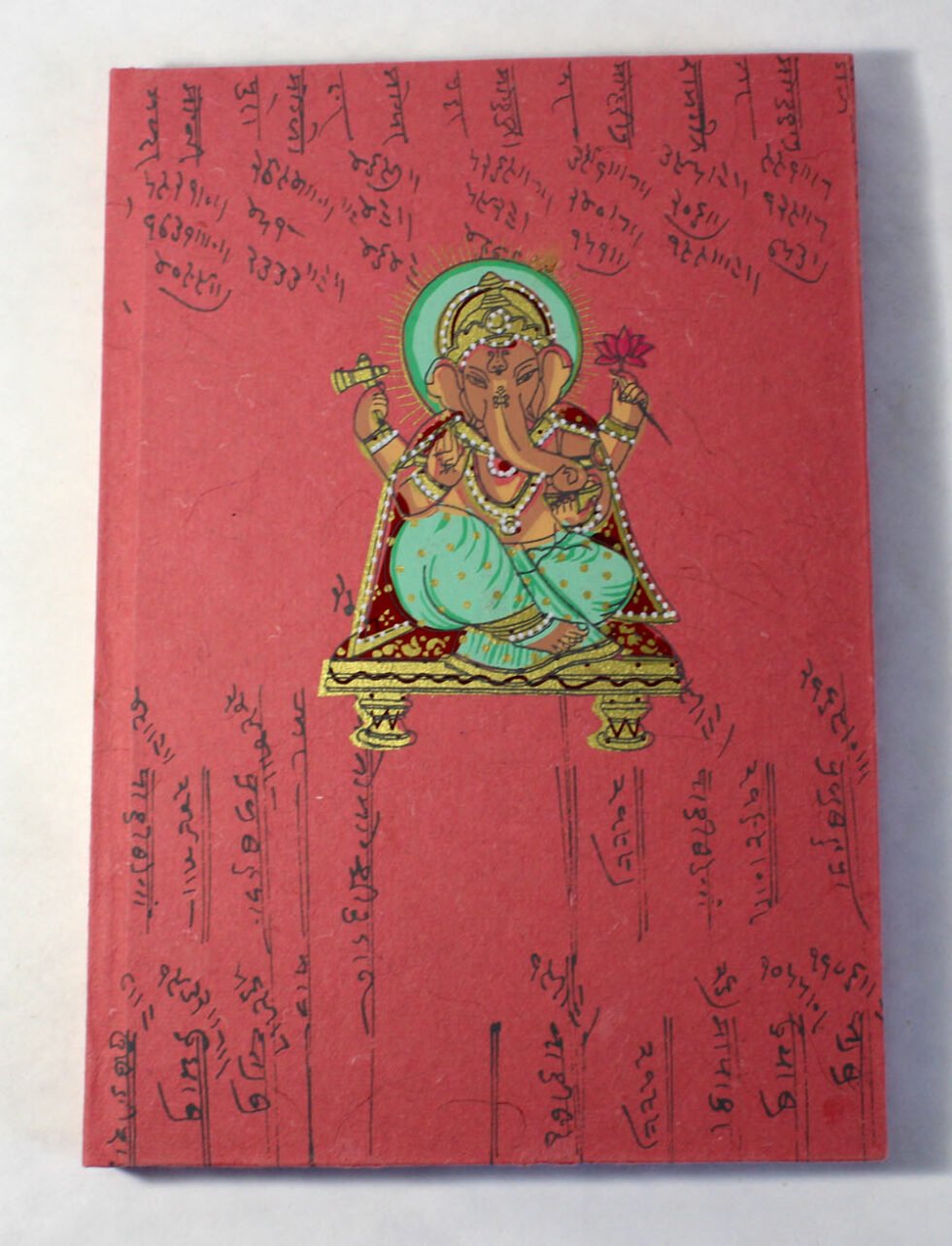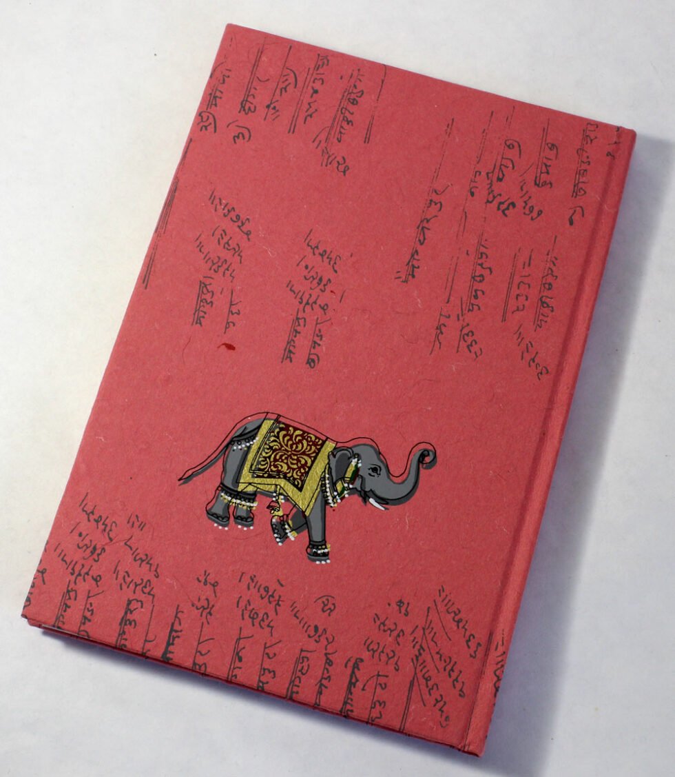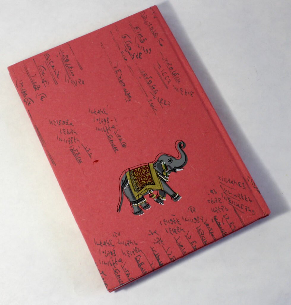 Antique looking A4 notebook with old ‘Bahi-Khata’ scripts running all over on recycled cotton handmade paper’s cover. On the front cover, Ganesh – Gord of Wealth & Wisdom is printed in multi-colour. It is silver screen hand print. At the back, auspicious elephant too is printed. A beautiful aesthetically made symbolic Dewali Present, and very auspicious too, for someone you wish very special! Just inside both the covers, front and back, there is another thick cream colour wood free / acid free paper sheet layer, holding the inside writing pages gracefully. In the middle, 48 sheets / 96 pages for smooth writing which never bleed with the ink or in calligraphy and can be a lovely travel book / art and craft book or a book – keeping domestic accounts and other valuable notes & details.