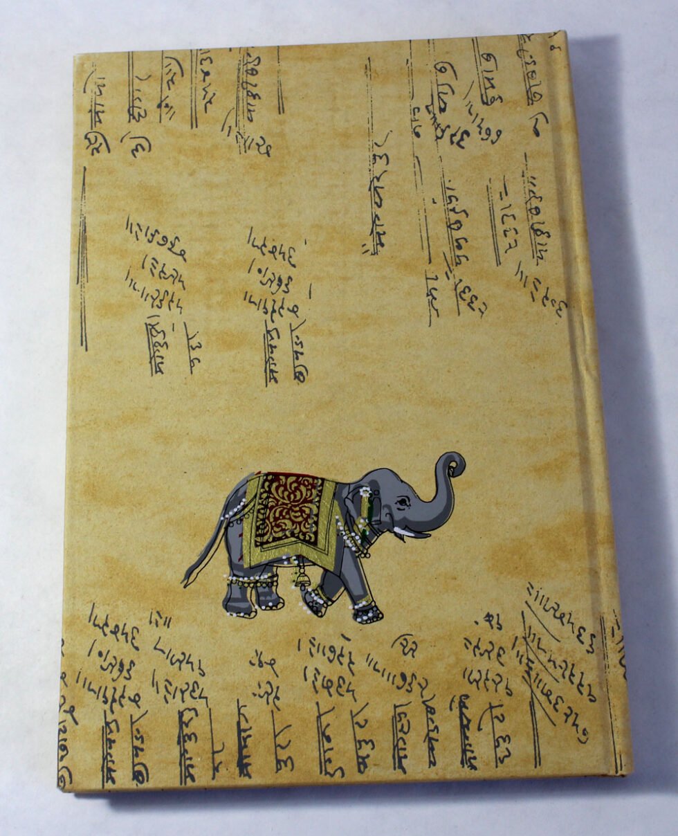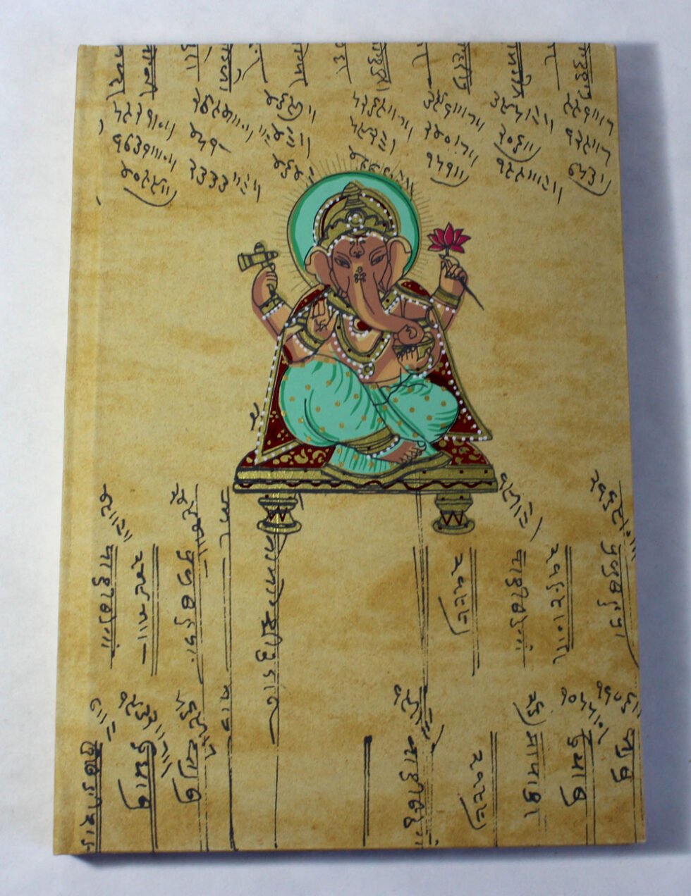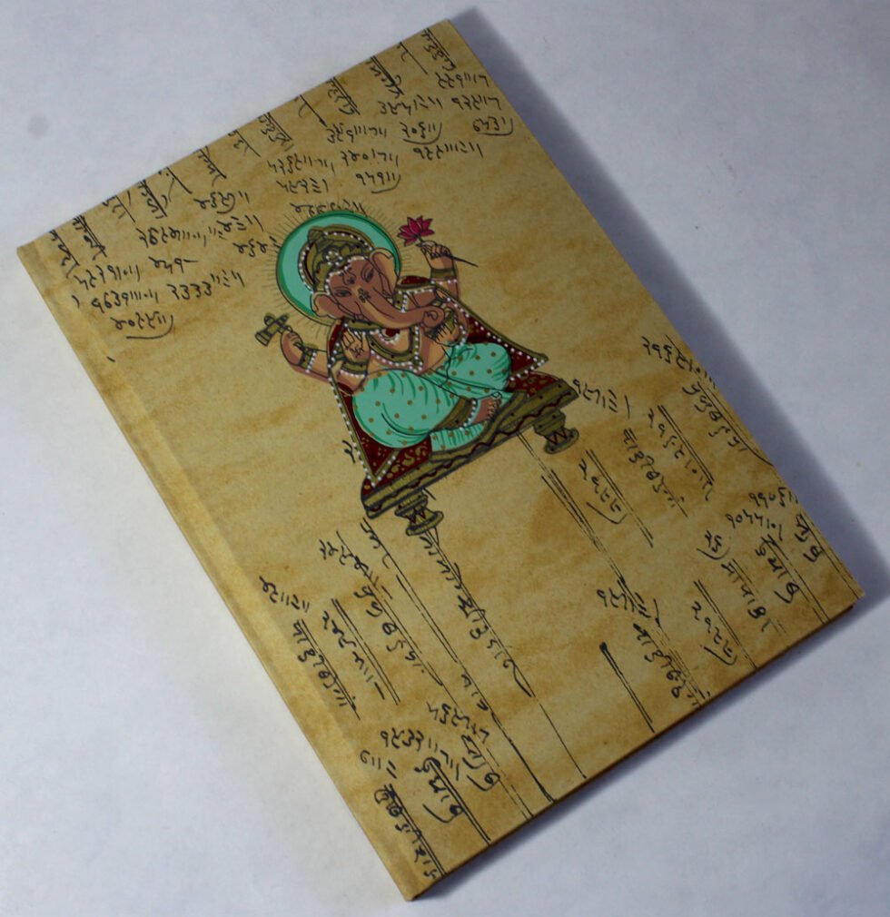 Antique looking A4 notebook with old ‘Bahi-Khata’ scripts running all over on recycled cotton handmade paper’s cover. On the front cover, Ganesha – Gord of Wealth & Wisdom is printed in multi-colour. It is silver screen hand print. At the back, auspicious elephant too is printed. A beautiful aesthetically made symbolic Dewali Present, and very auspicious too, for someone you wish very special! Just inside both the covers, front and back, there is another thick cream colour wood free / acid free paper sheet layer, holding the inside writing pages gracefully. In the middle, 48 sheets / 96 pages for smooth writing which never bleed with the ink or in calligraphy and can be a lovely travel book / art and craft book or a book – keeping domestic accounts and other valuable notes & details.