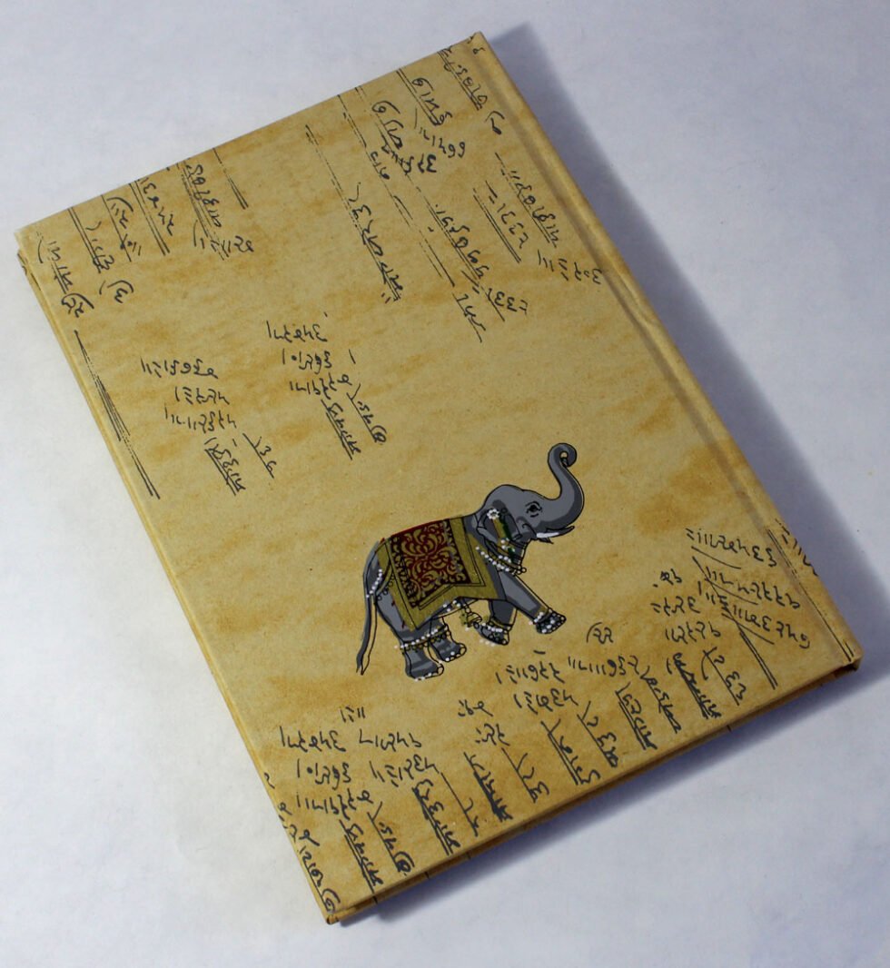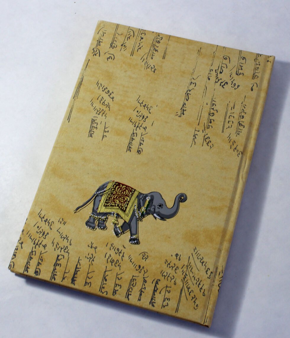 Antique-style A4 notebook with Bahi-Khata script, Lord Ganesha, and elephant prints — an auspicious Diwali gift with 96 pages of smooth, wood-free paper.