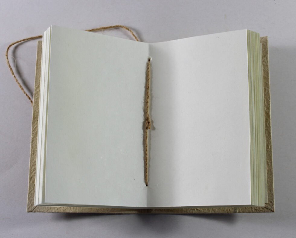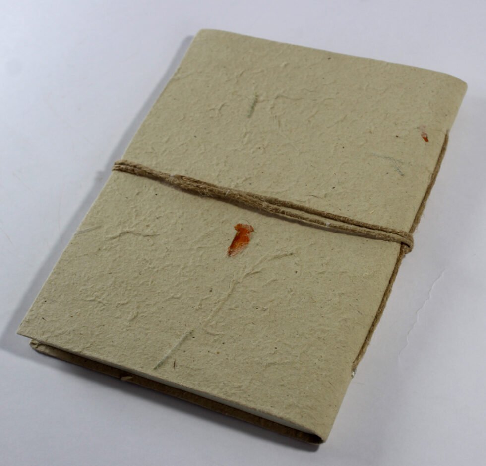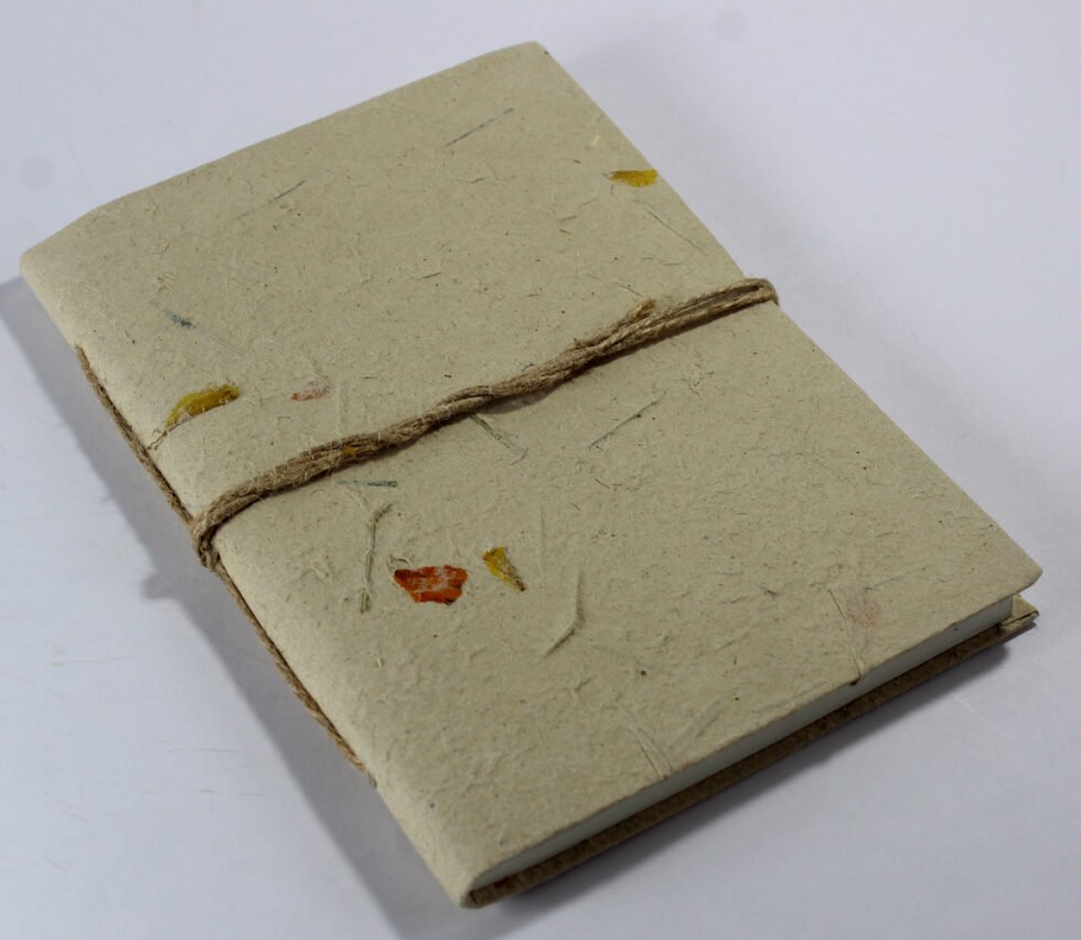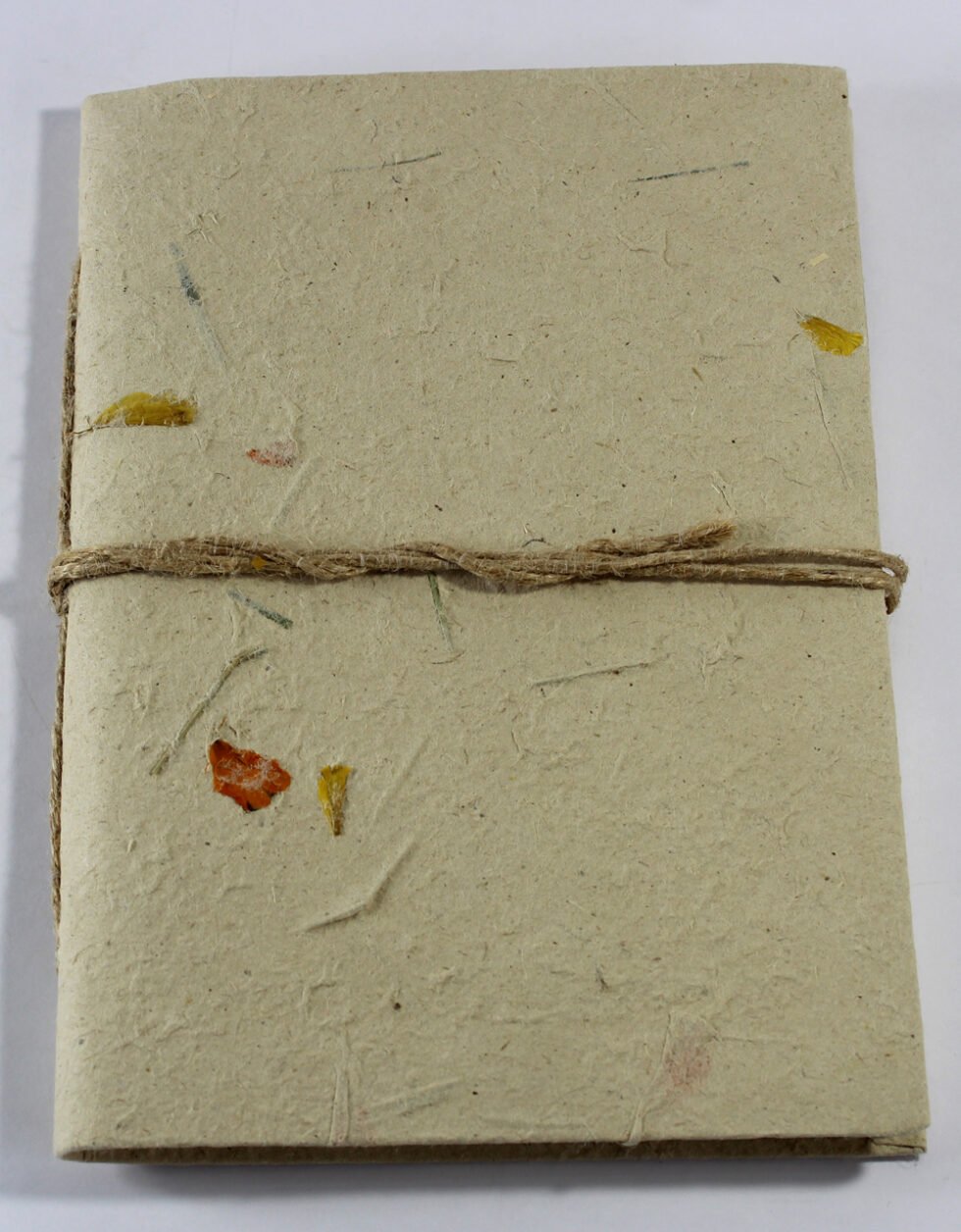 Soft cover handcrafted notebooks in antique ‘Bahi-Khata’ style with a jute string to wrap around as closure. Cover is made of hemp paper formed in a special way to give uneven surface known as ‘Garden Paper’ with the grass and petals imbibed. Inside are 48 premium leaves (96 pages) of handmade paper. Lovely paper to write upon, totally wood free, acid free and never bleeds even when written upon by an ink / fountain pen. A beautiful hand crafted notebook with multiple prints / job works on cover paper to make it a beautiful present for many occasions.