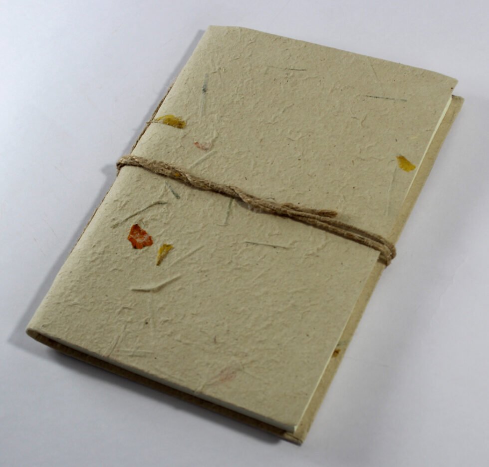 Softcover handcrafted in antique Bahi-Khata style with a jute string closure. The Garden Paper cover features embedded grass and petals. Inside are 48 leaves (96 pages) of handmade, wood-free, acid-free paper — smooth, ink-safe, and perfect for writing or drawing. A beautiful, artisanal notebook, ideal for gifting.