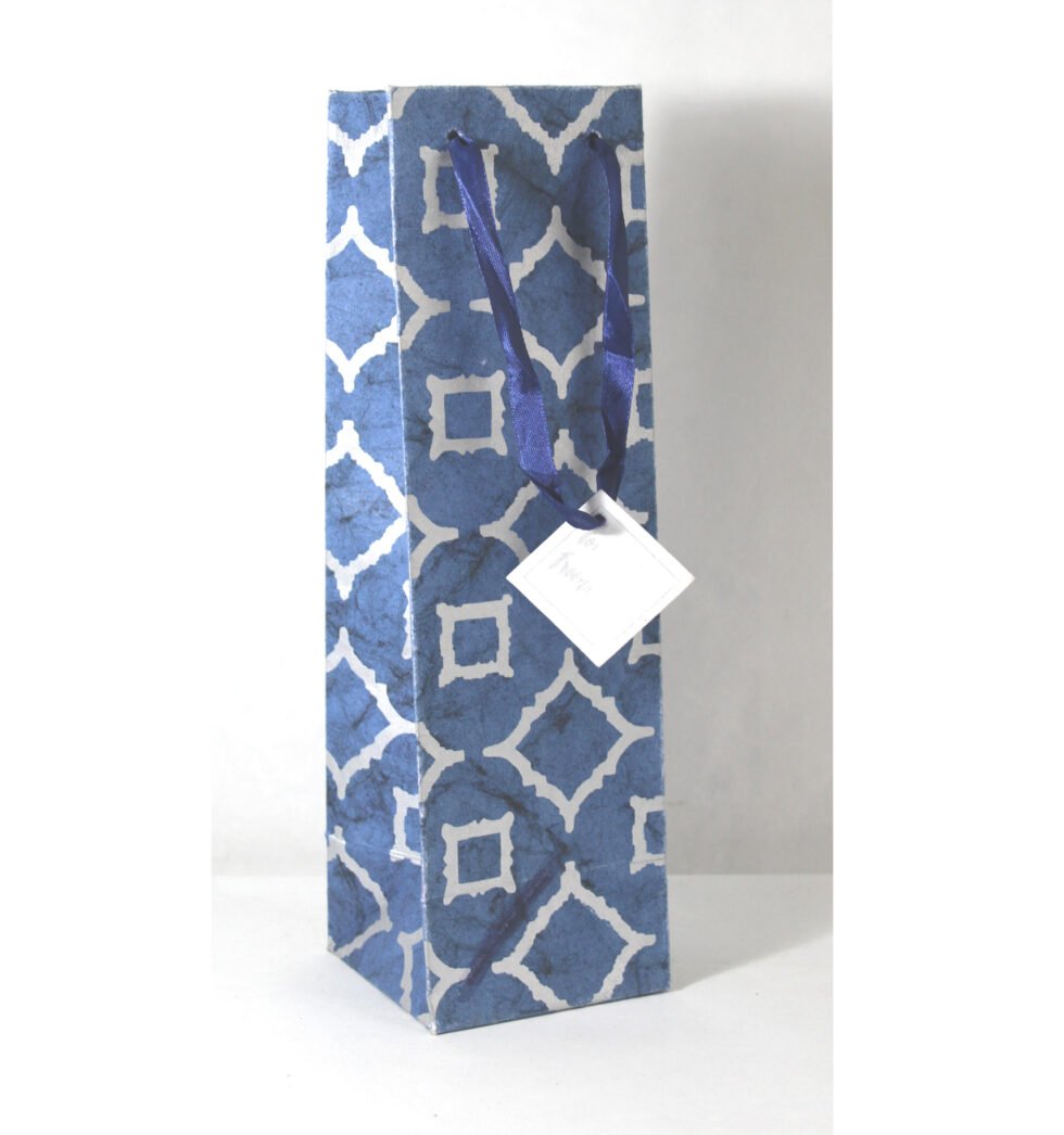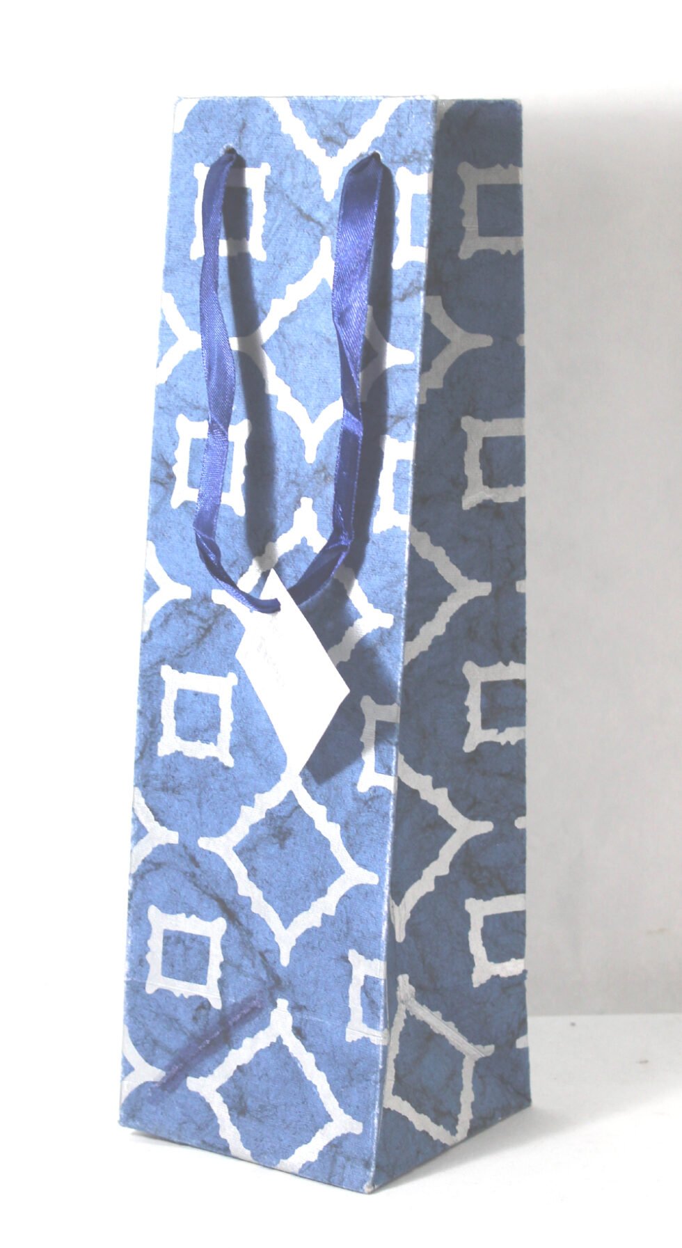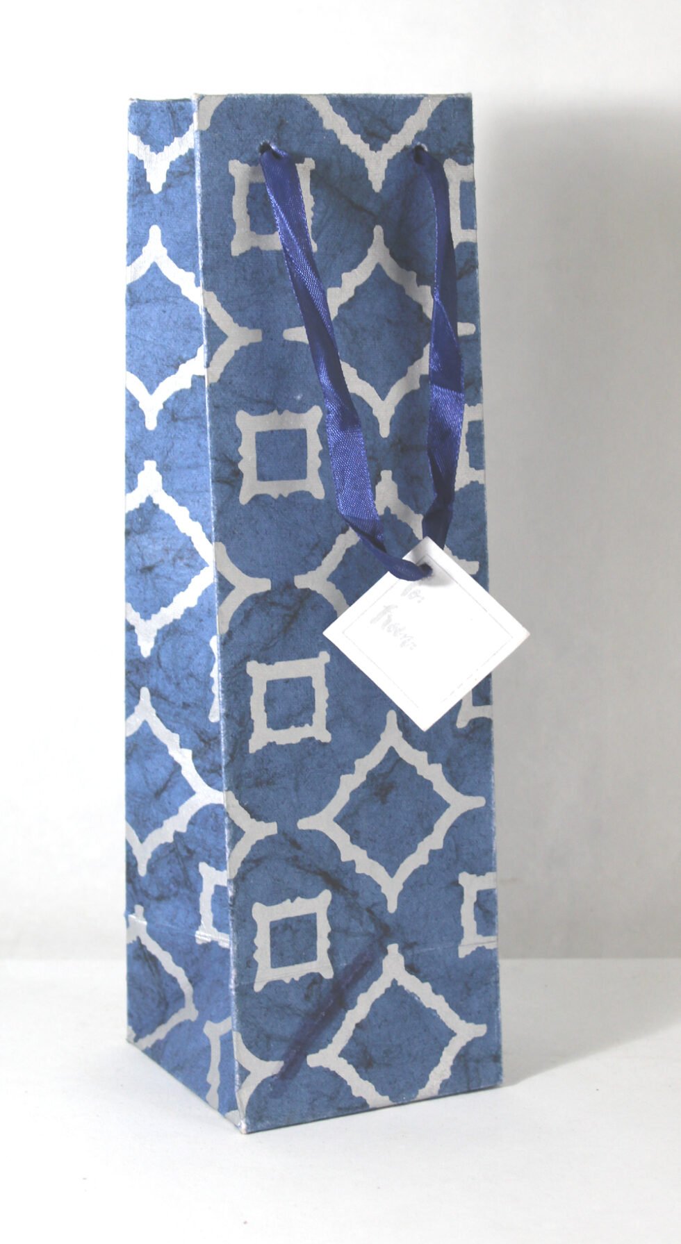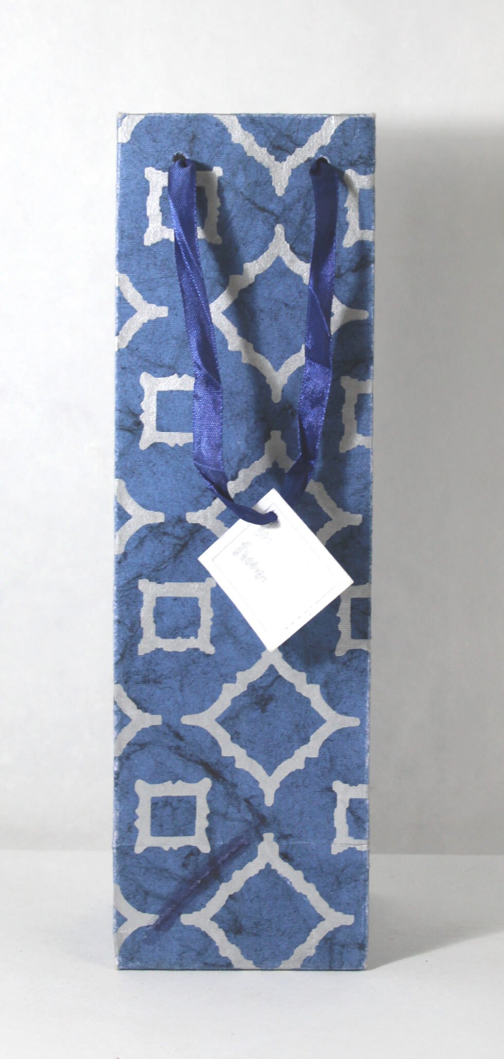 A lovely premium wine bag for exclusive use! Thick recycled cotton handmade batik printed paper with metallic silver print all around. Matching satin ribbon handles are given with matching gift tag. Further, bottom and collars of the bags are strengthened up by providing card sheets inside.