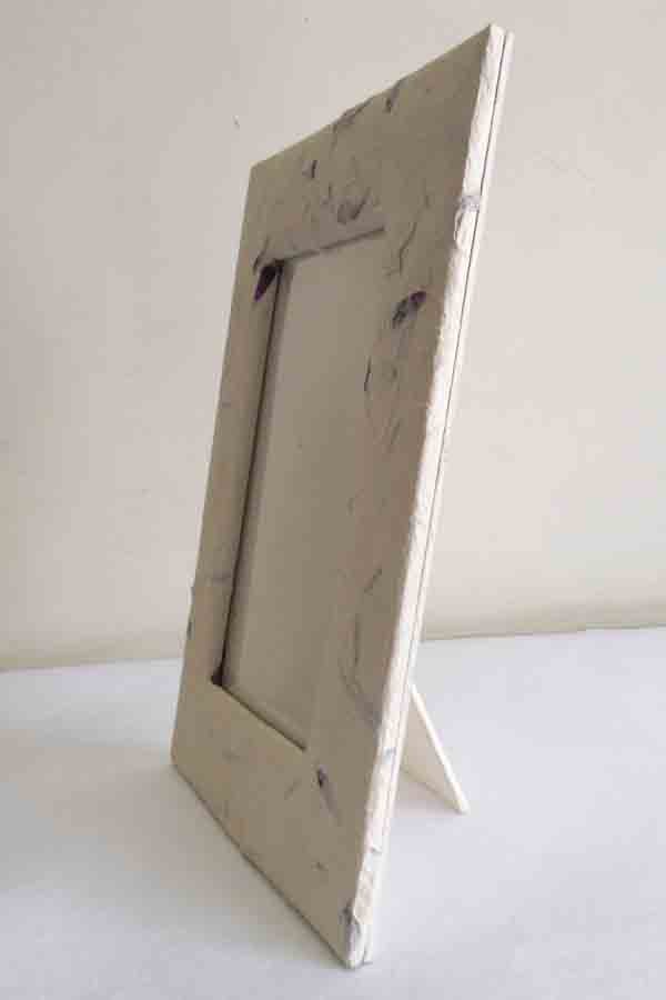Photo frame made of solid cardboard and a beautiful garden 100% hemp paper. The uneven surface of paper with grass & flower petals inside the paper makes it elegant! Any other color of the paper, any other design to be printed can be given. We do branding and can print given logos / details!