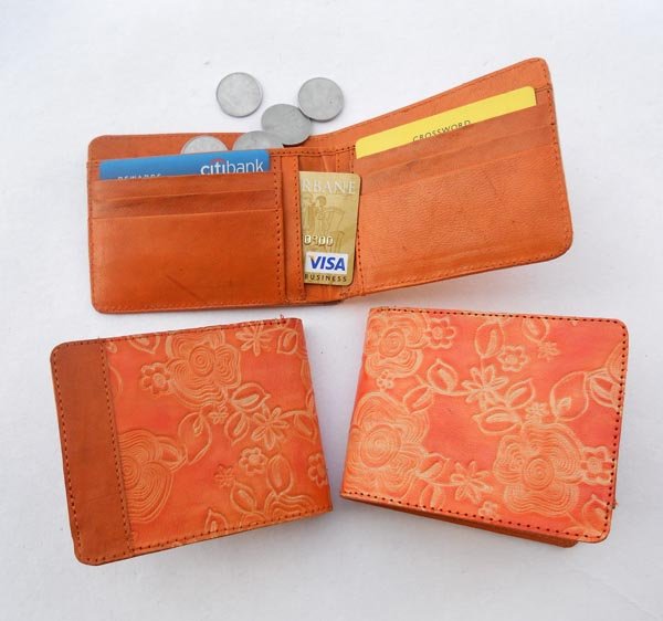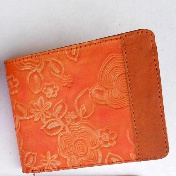 Beige faded carved leather with & light orange leather with multiple pockets inside for multiple uses.