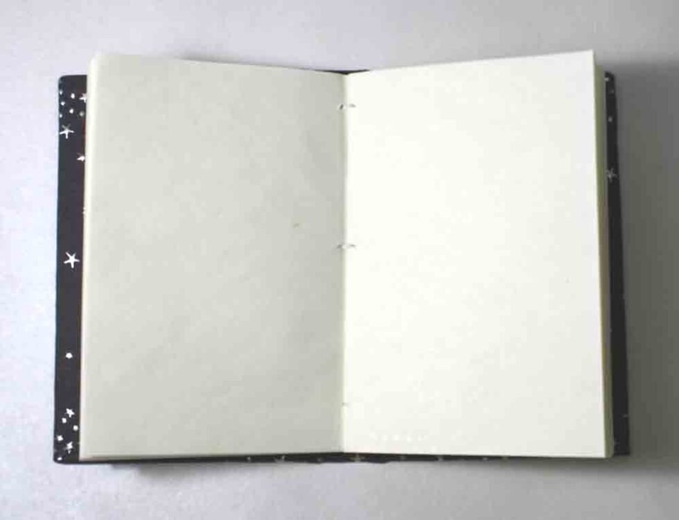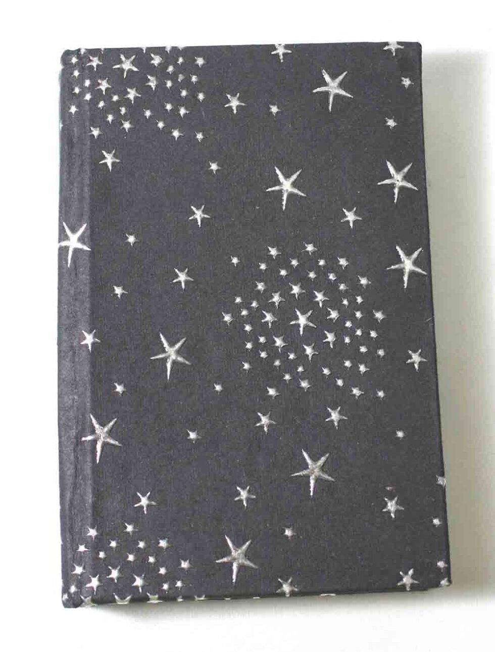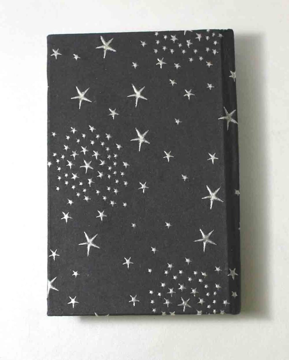 Black color sheet with silver design printed all over as cover. Hard cover notebook with 48 sheets / 96 pages of recycled handmade cotton paper. Hand bound with specialist artisans while the paper is wood free, acid free and never bleeds while using ink pen. Wonderful green lift style product – can be branded or customized and excellent teen for personal / corporate gift!         Size Cm : 10 x 15 Cm         Size inch : 4″x 6″