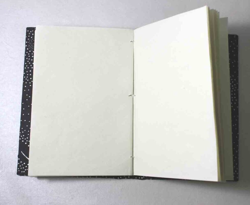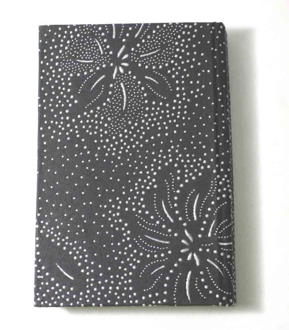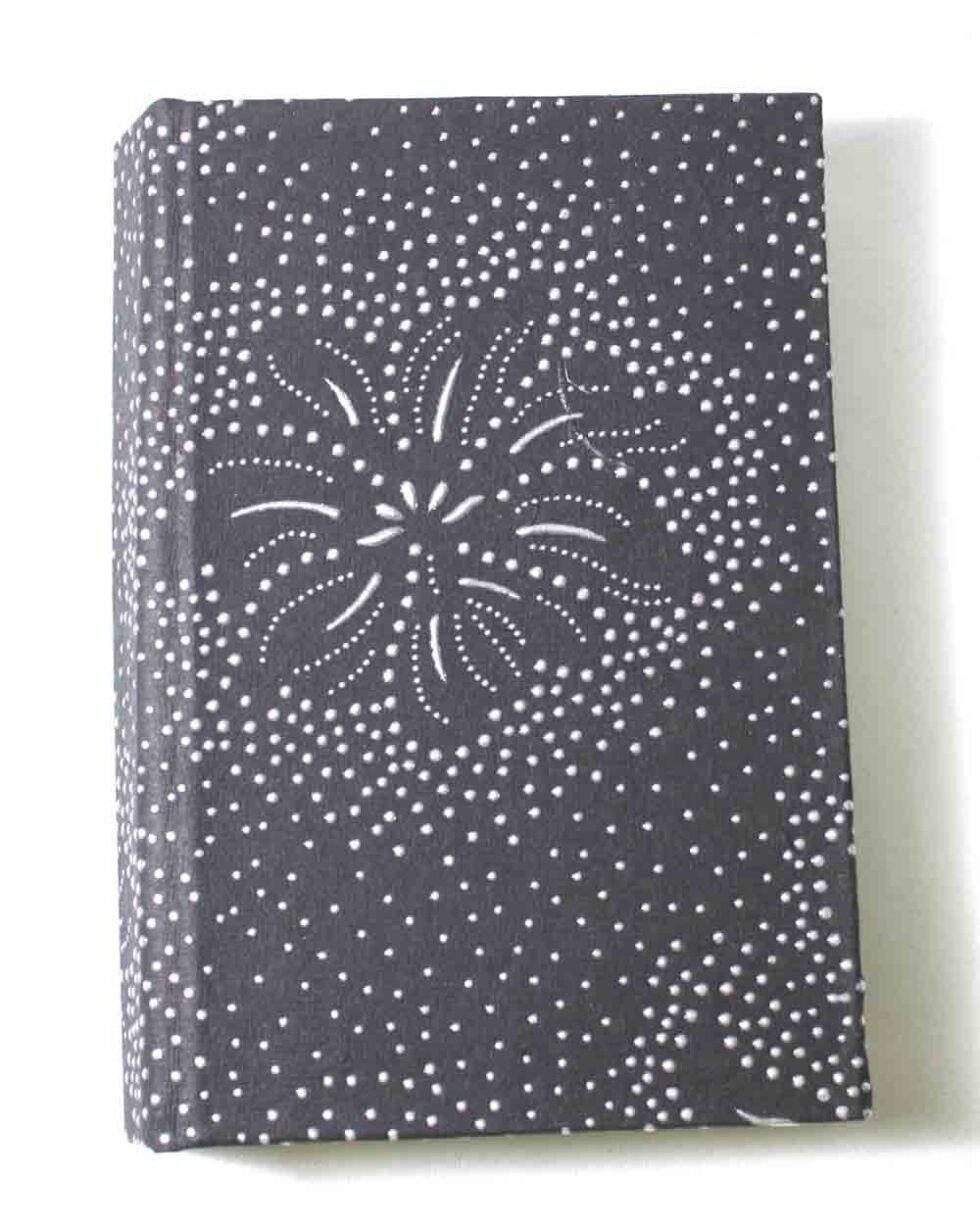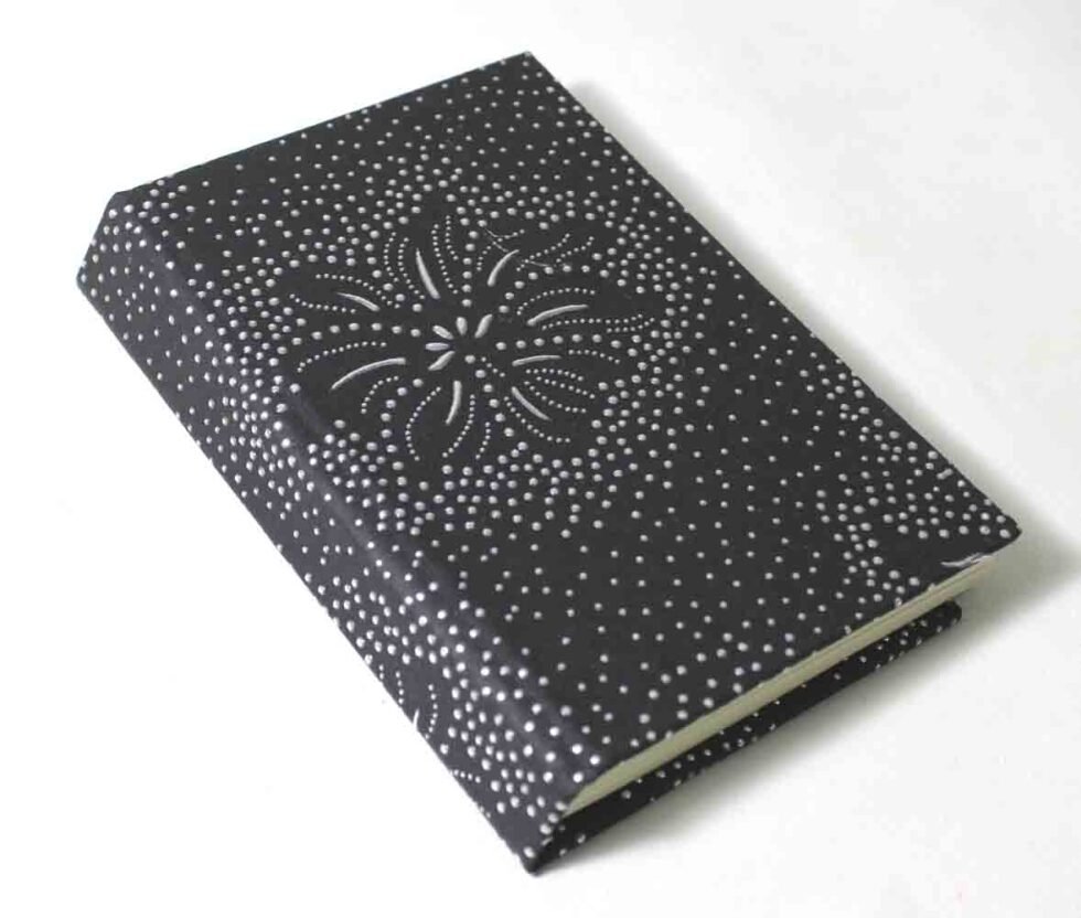 Black color sheet with silver design printed all over as cover. Hard cover notebook with 48 sheets / 96 pages of handmade recycled cotton paper. Hand bound with specialist artisans while the paper is wood free, acid free and never bleeds while using ink pen. Wonderful green life style product – can be branded or customized and excellent teen for personal / corporate gift!Â
