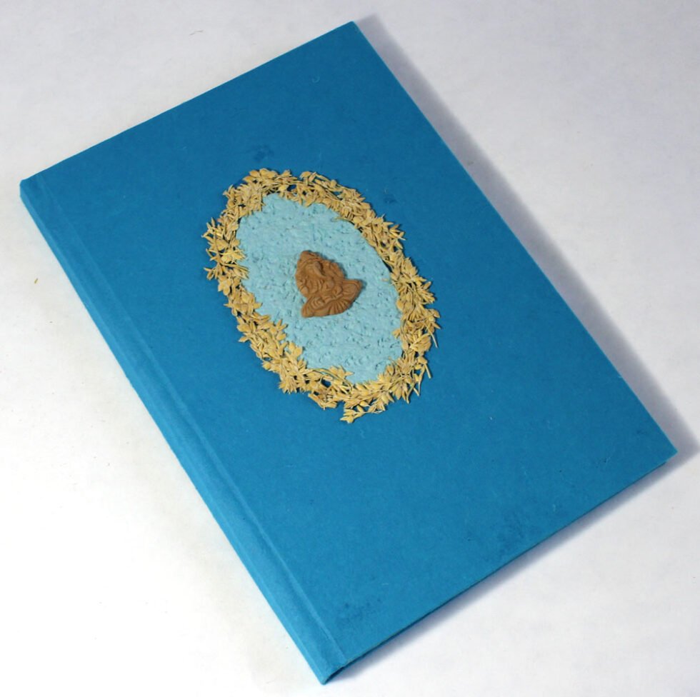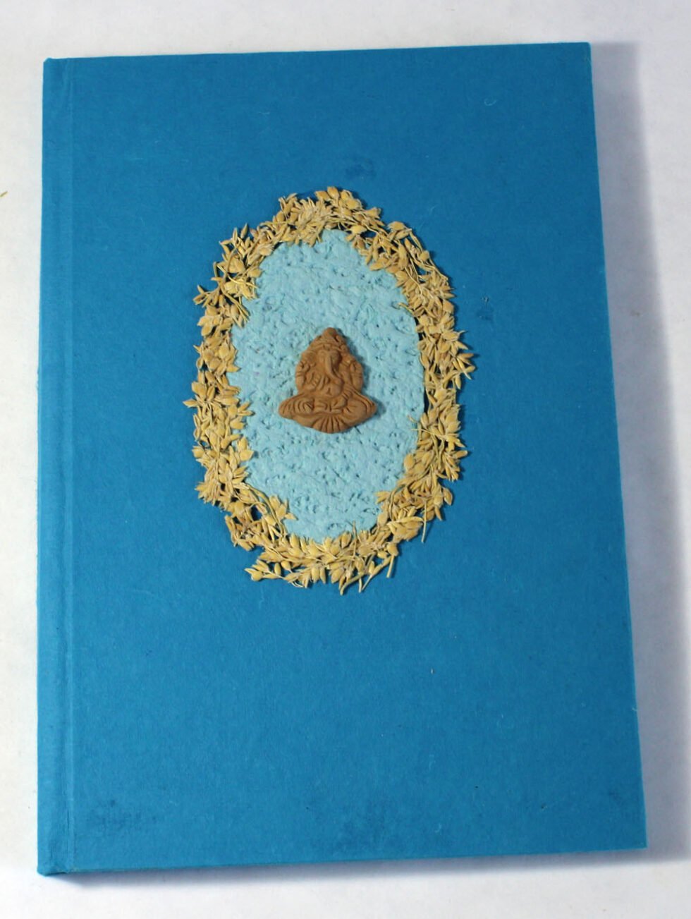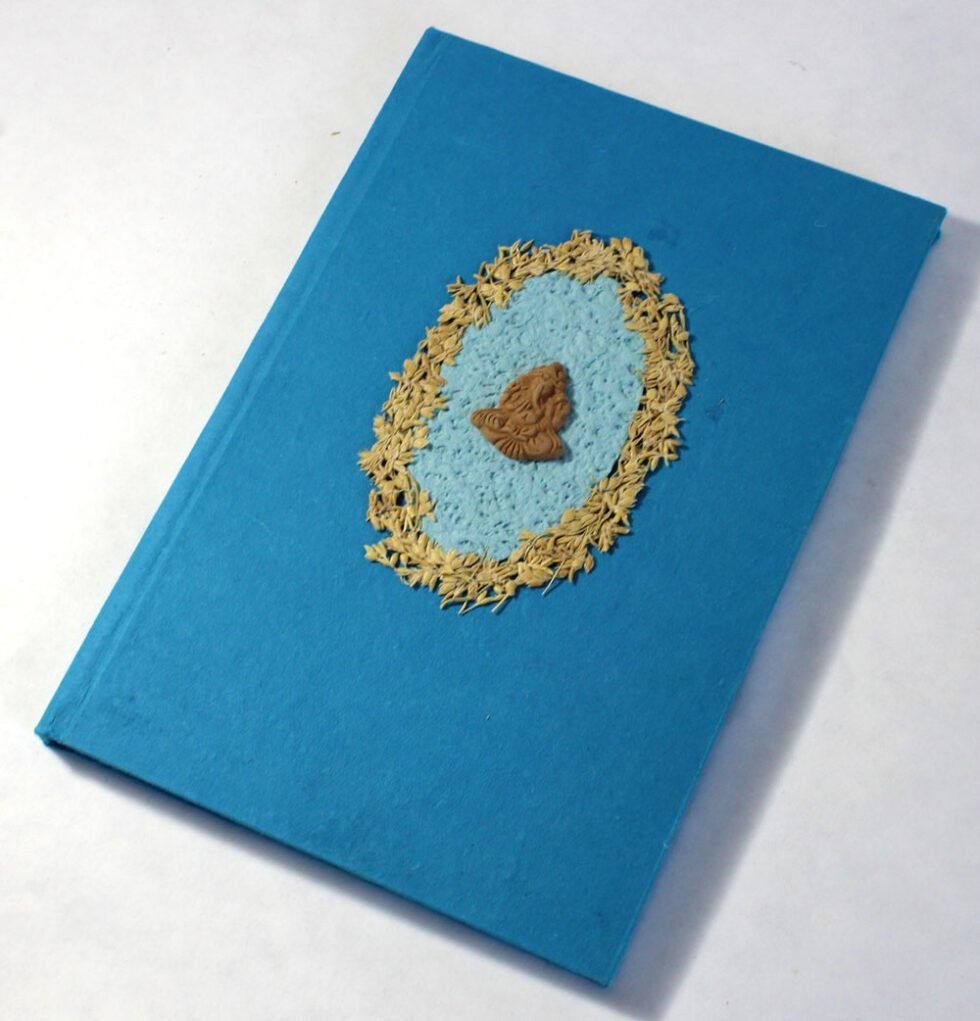 Beautiful collage design by gluing down a special paper in oval shape known as ‘Moon Rock’ on the front cover of the notebook. Further surrounded by the auspicious white grass around its border. In the centre, Lord Ganesh – The God of wisdom & Wealth, is placed, making it a very unique Diwali Present! A beautiful aesthetically made symbolic Diwali Present, and very auspicious too, for someone you wish very special! Just inside both the covers, front and back, there is another thick cream colour wood free / acid free paper sheet layer, holding the inside writing pages gracefully. In the middle, 48 sheets / 96 pages for smooth writing which never bleed with the ink or in calligraphy and can be a lovely travel book / art and craft book or a book – keeping domestic accounts and other valuable notes & details.