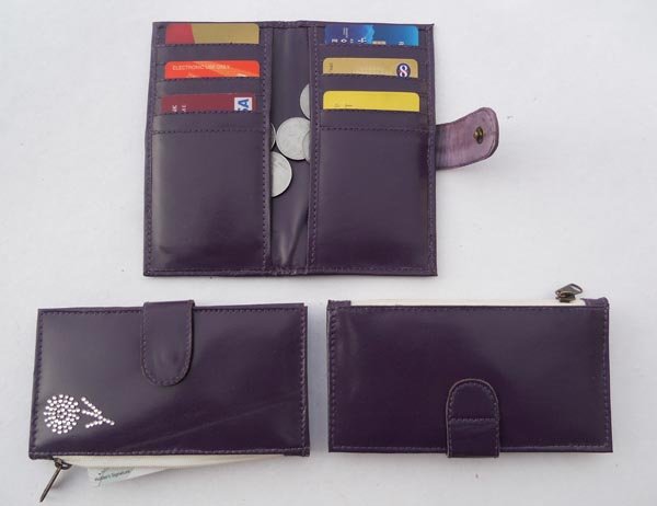 Blue leather with multiple pockets for credit cards & two large side pockets