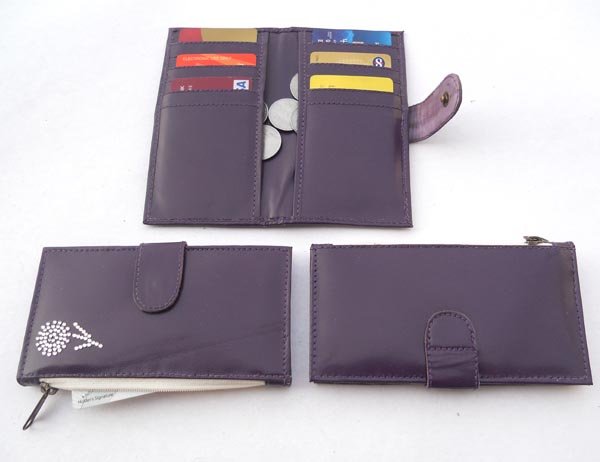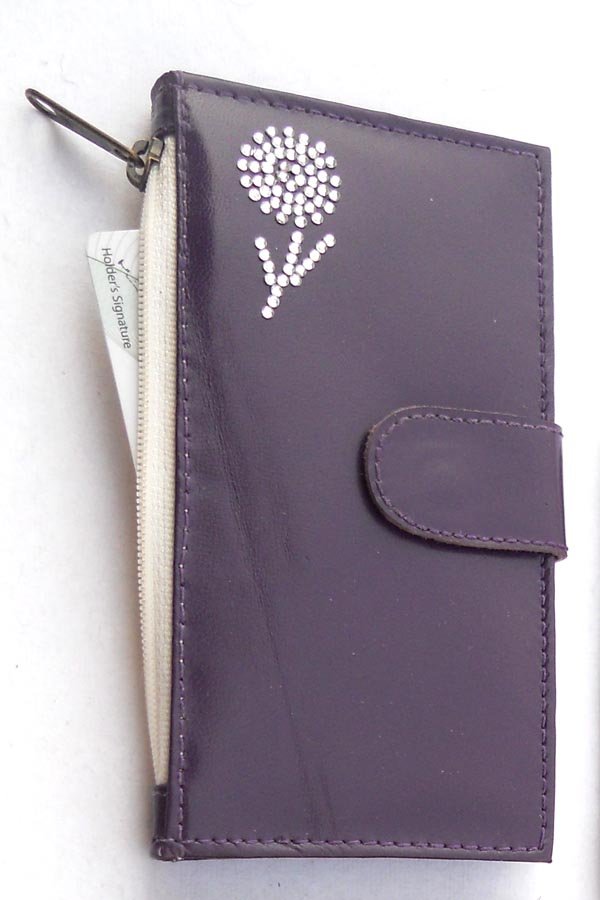 Blue leather with multiple pockets for credit cards & two large side pockets for coins / documents. Fine stones’ work forming a flower at the corner.