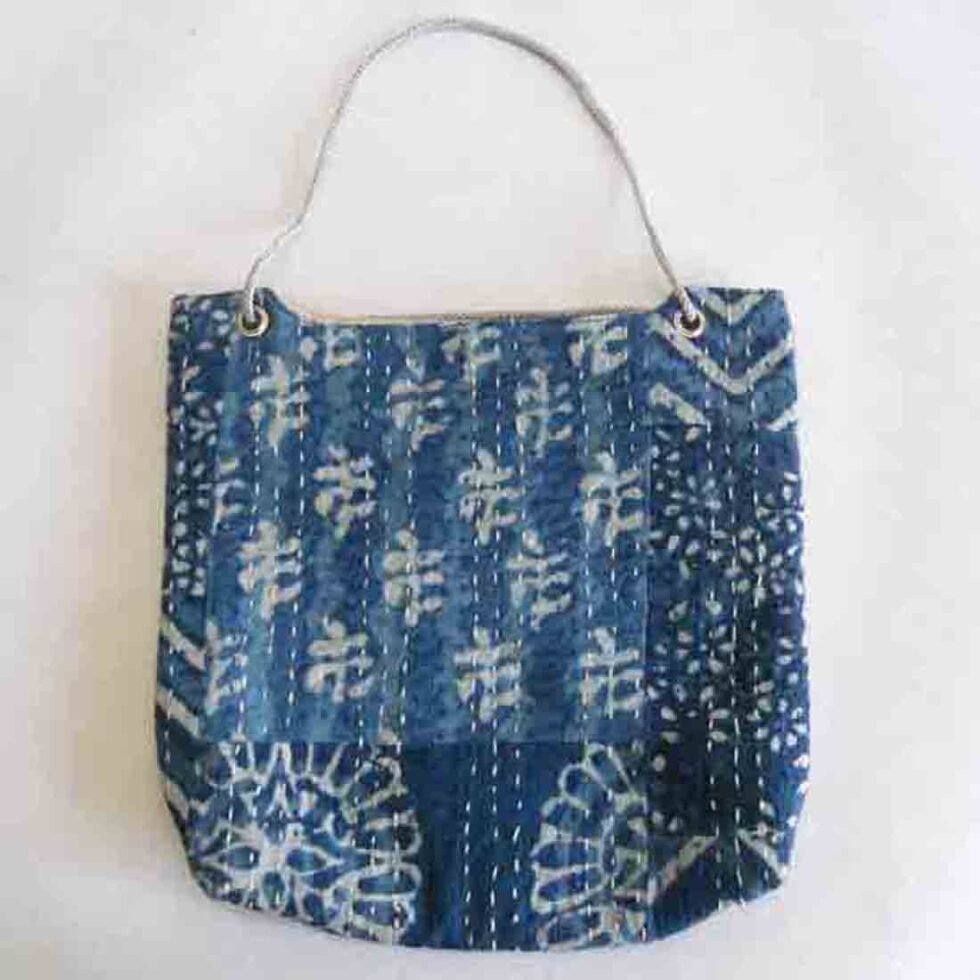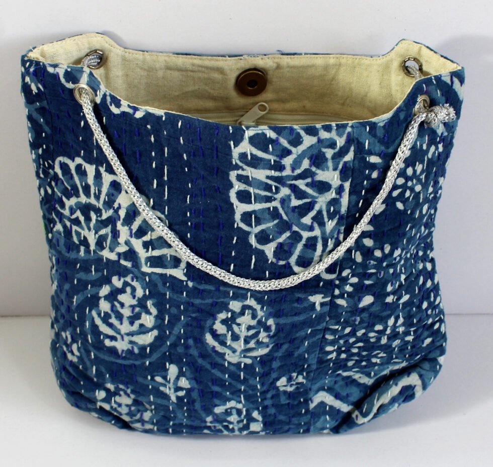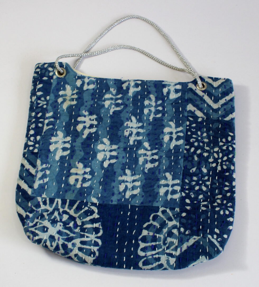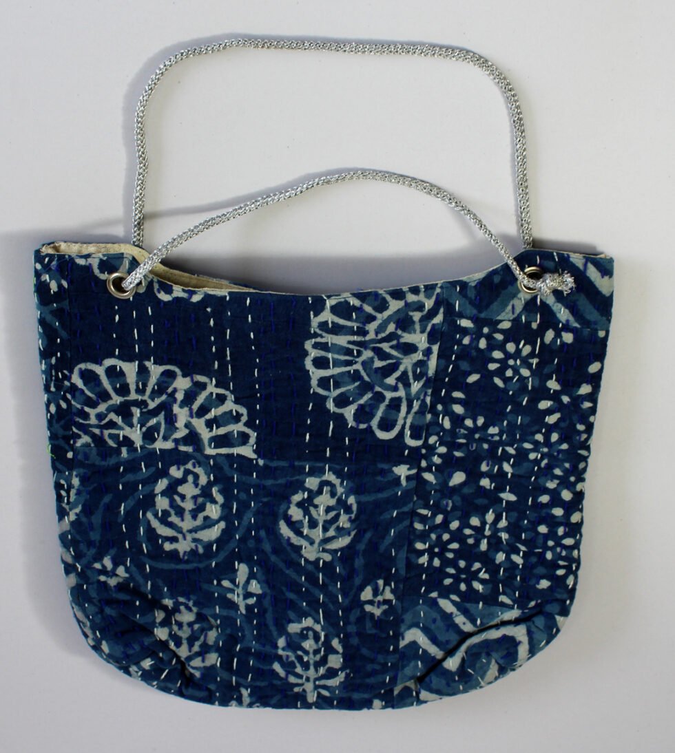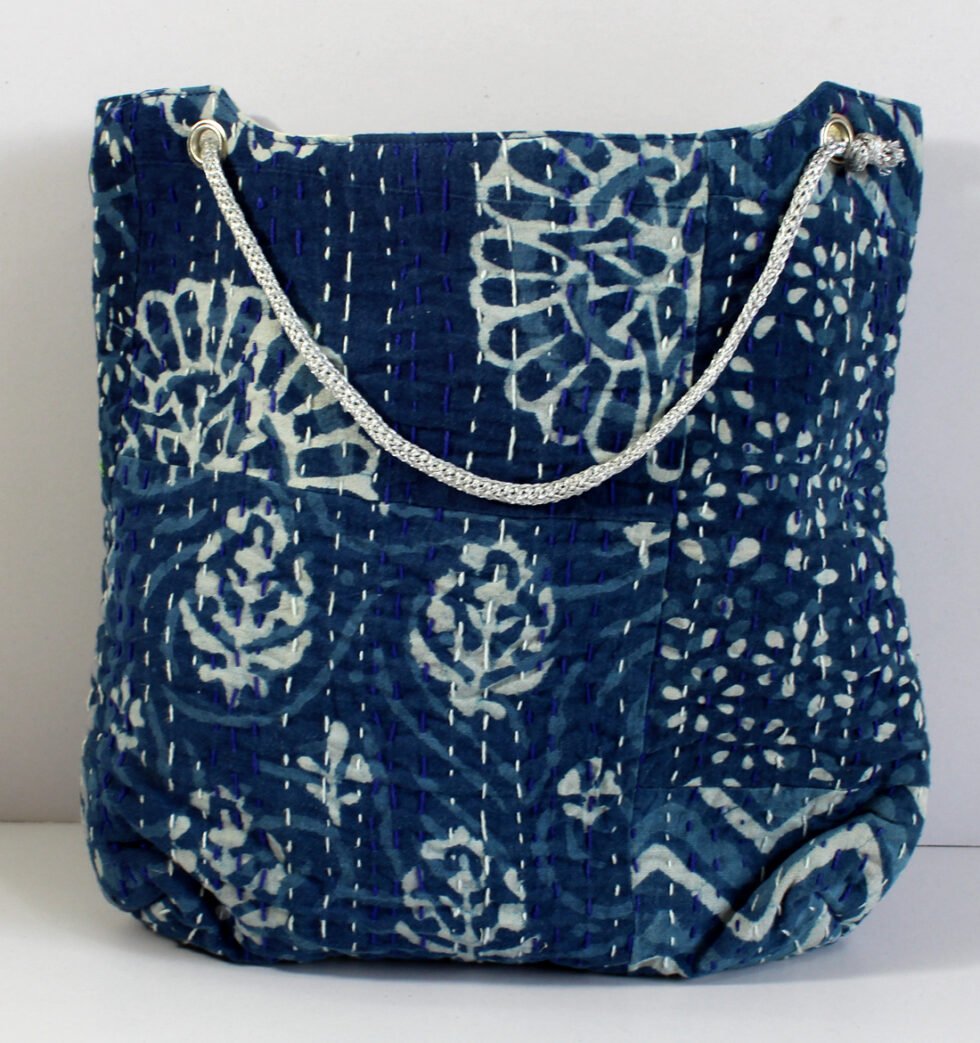 “Hand block printed quilted cotton bag with decorative stitching. Sturdy, stylish, and crafted by artisans of Rajasthan.”