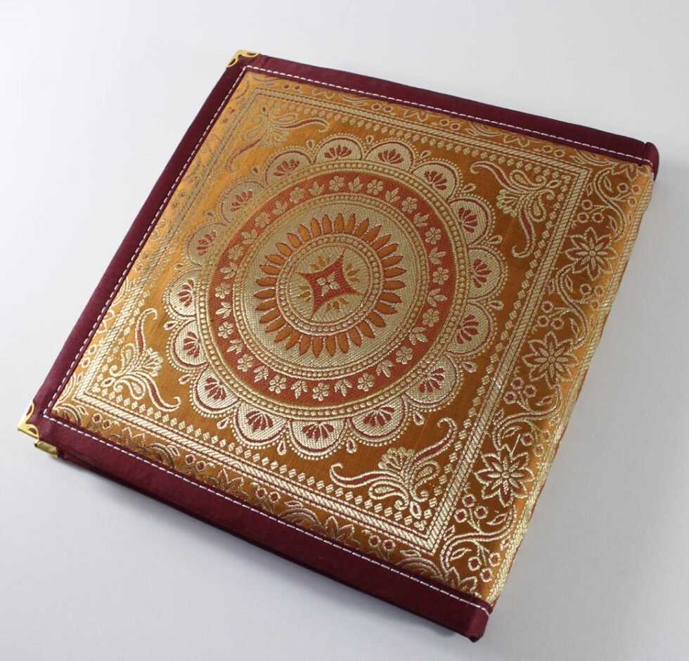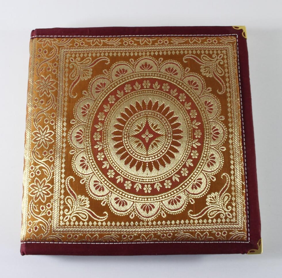 Notebook / journal cover with a class of richly decorative shuttle-woven fabric, made in coloured silks and with gold and silver threads. Corners of the journals reinforced with rich brass corners. Truly royal Indian piece of art as notebook for cereminial use or at weddings / functions / parties or as guest book. Inside is 72 sheets / 144 pages recycled cotton handmade cream colour paper. Never bleeds with ink pen or colours. Lovely gift or corporate present.