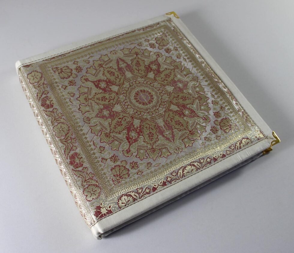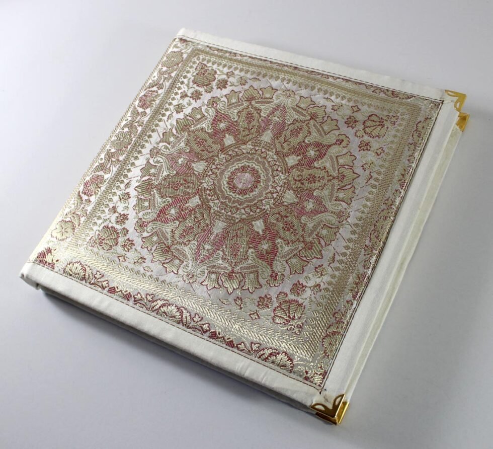 Notebook / journal cover with a class of richly decorative shuttle-woven fabric, made in coloured silks and with gold and silver threads. Corners of the journals reinforced with rich brass corners. Truly royal Indian piece of art as notebook for cereminial use or at weddings / functions / parties or as guest book. Inside is 72 sheets / 144 pages recycled cotton handmade cream colour paper. Never bleeds with ink pen or colours. Lovely gift or corporate present.