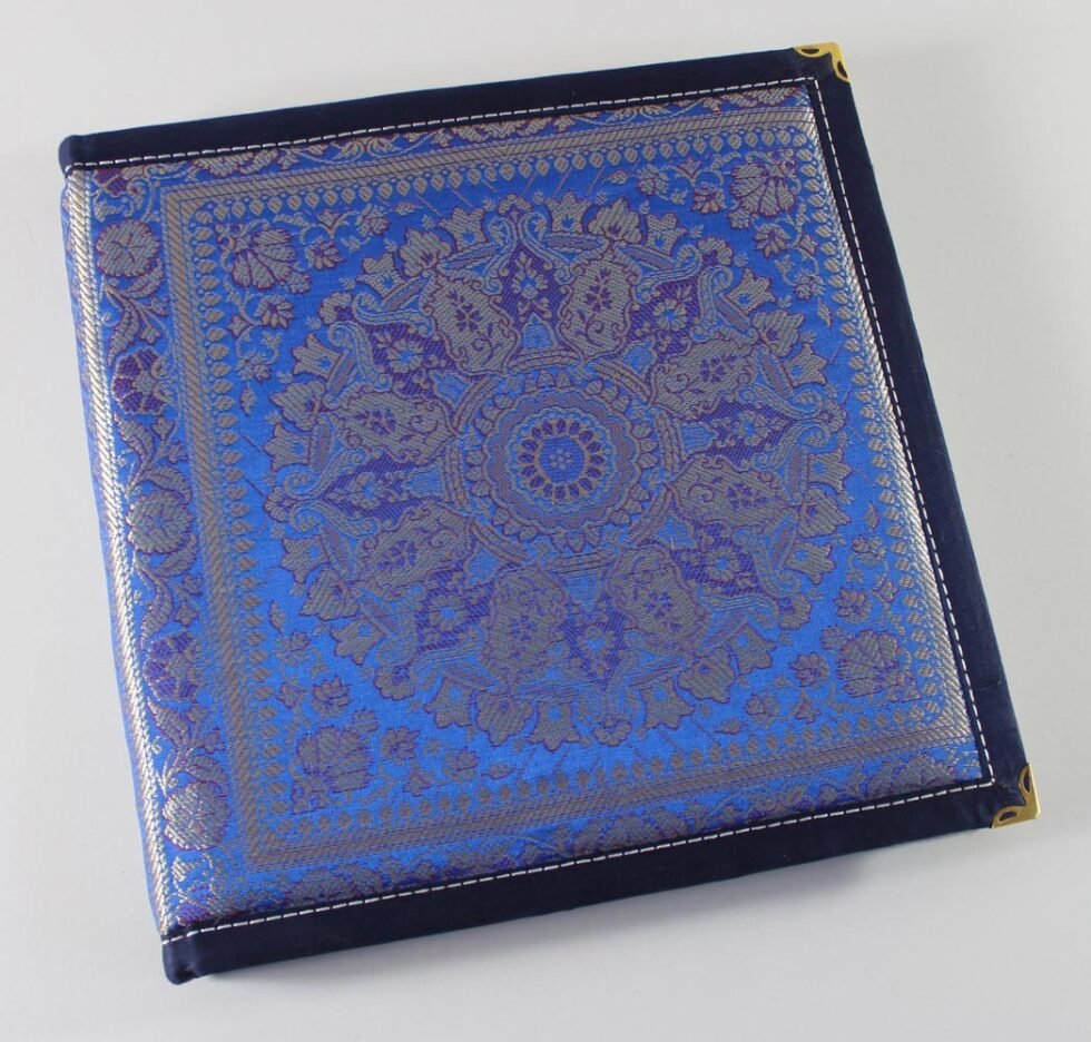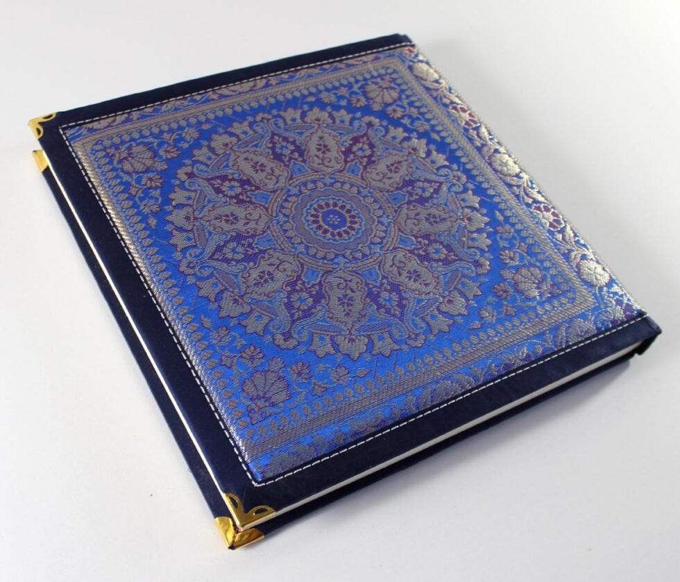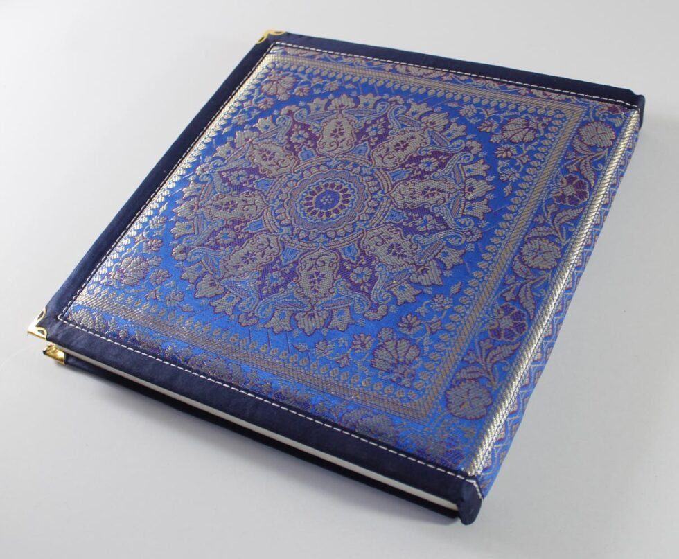 Royal silk-woven Indian notebook with brass corners and 96 handmade, bleed-proof pages—ideal for weddings, ceremonies, and gifts.