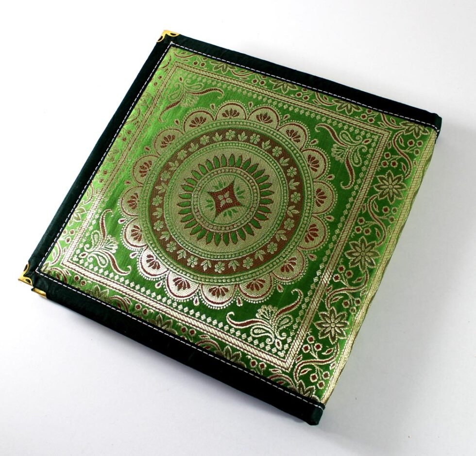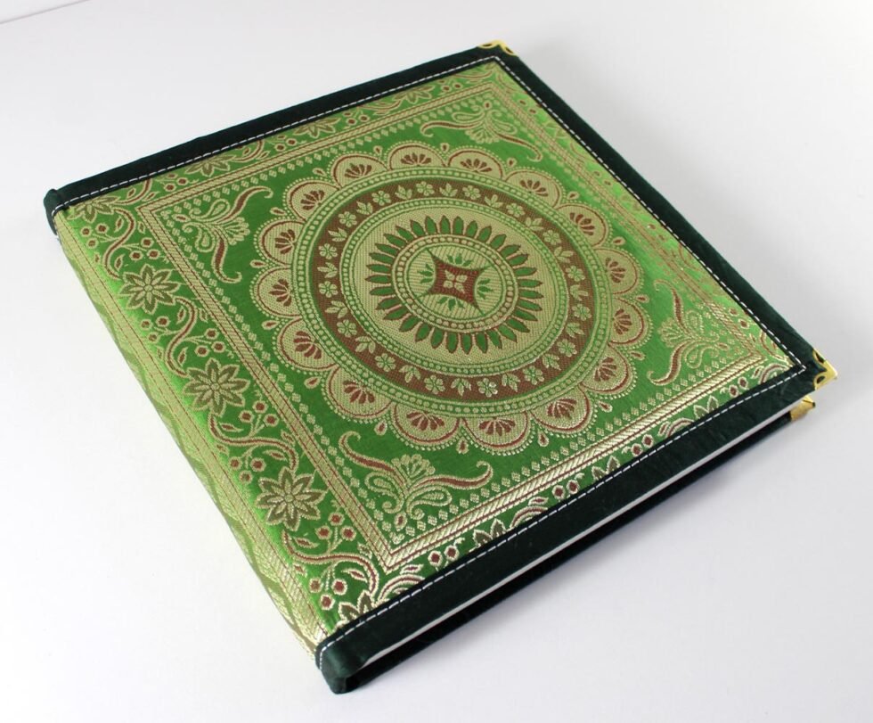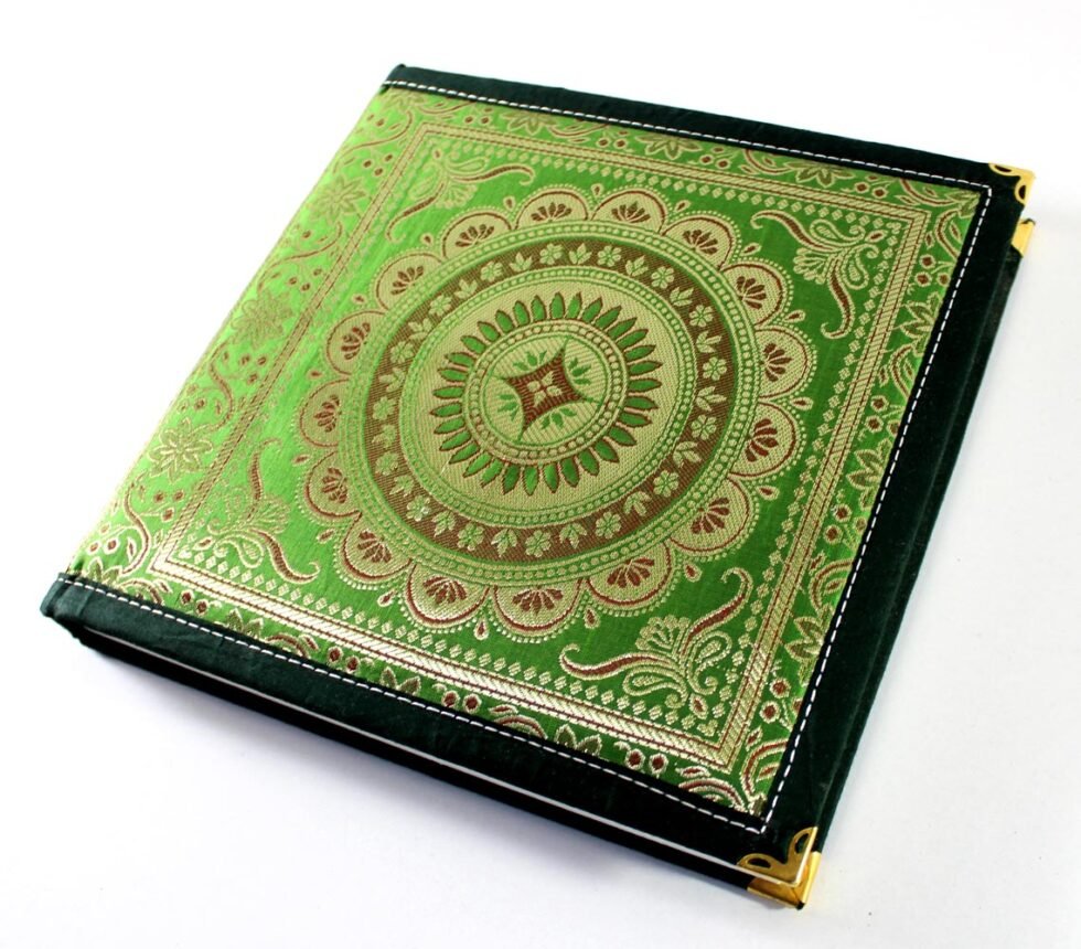 Notebook / journal cover with a class of richly decorative shuttle-woven fabric, made in coloured silks and with gold and silver threads. Corners of the journals reinforced with rich brass corners. Truly royal Indian piece of art as notebook for cereminial use or at weddings / functions / parties or as guest book. Inside is 72 sheets / 144 pages recycled cotton handmade cream colour paper. Never bleeds with ink pen or colours. Lovely gift or corporate present.
