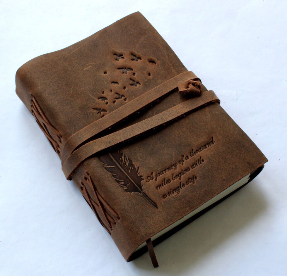 Made from premium buffalo leather, with a wonderful smell, its soft feeling and delicate, yet super tough. Rustic charm with decorative leather strings’ stitching on the spine adds antique magic to this lovely vintage journal. A leather book mark too is given. Front cover is embossed with the feather design beautifully done with the hot stamping. Draw, write and sketch to your heart’s content on the 120 sheets or 240 pages of recycled cotton handmade paper. Paper is wood free, acid free and does not bleed with the ink pen! A perfect present for men, women, students, travellers of all age!
