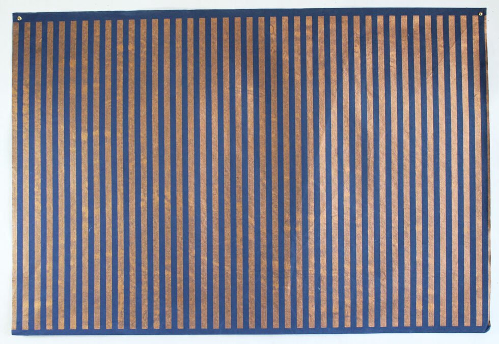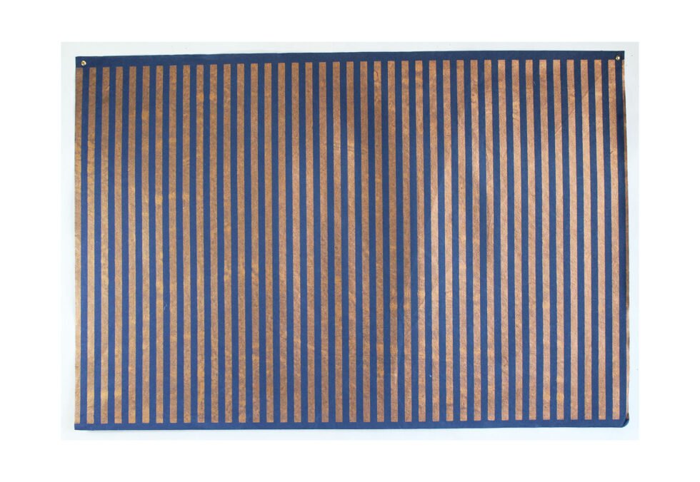 Copper metallic stripes printed on 100 GSM Handmade recycled cotton blue color paper. Wood fee, acid free handmade paper. A premium gift wrap for all kind of occasions rolled up on a paper tube. Can be shipped flat also, double folded or just flat. Can be supported by other packing accessories like bags, boxes, tissue papers, tags & labels – a wonderful packing range in environment friendly paper. Can definitely be customized in terms of size, color, logo & other details.