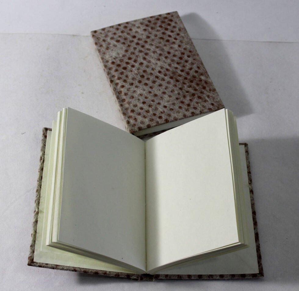 Solid cover notebook with lovely cream color handmade recycled cotton paper 48 sheets / 96 pages inside. Outside is the cardboard cover decorated with lace paper on front and a normal contrasting paper on its back giving it an exquisite look. Paper is acid free, wood free and does not bleed with the ink pen.