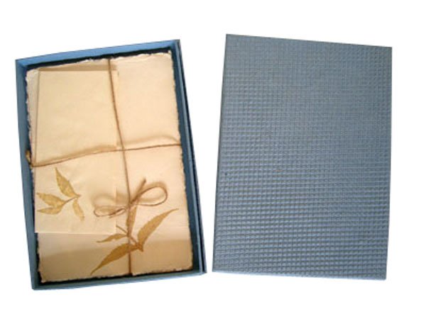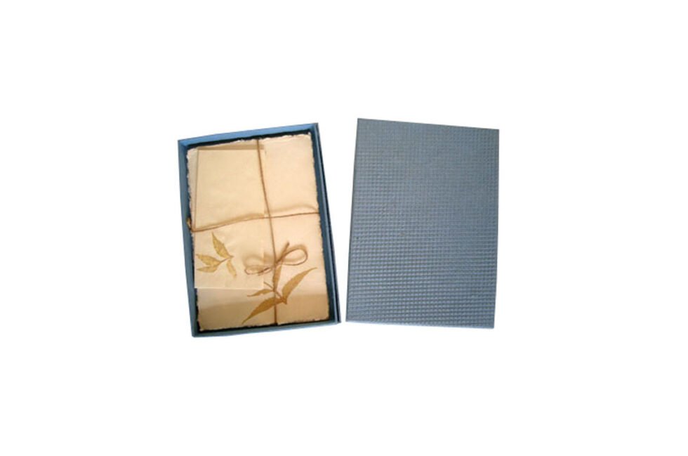 Once worn passionately is used in paper marking and letter sets. Recycled denim (jeans) rags paper. Have a great emotional value for all the groups of ages. Inside the denim paper letter set box – 10 deckle edge cotton paper letter heads with a leaf impression at the corner of each letter head, along with 5 matching envelopes with leaf impression too. The paper is smooth, wood free, acid free and never bleeds with the ink.