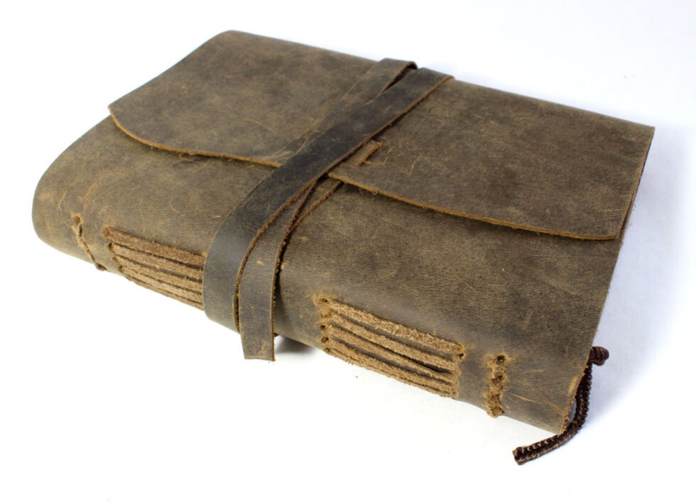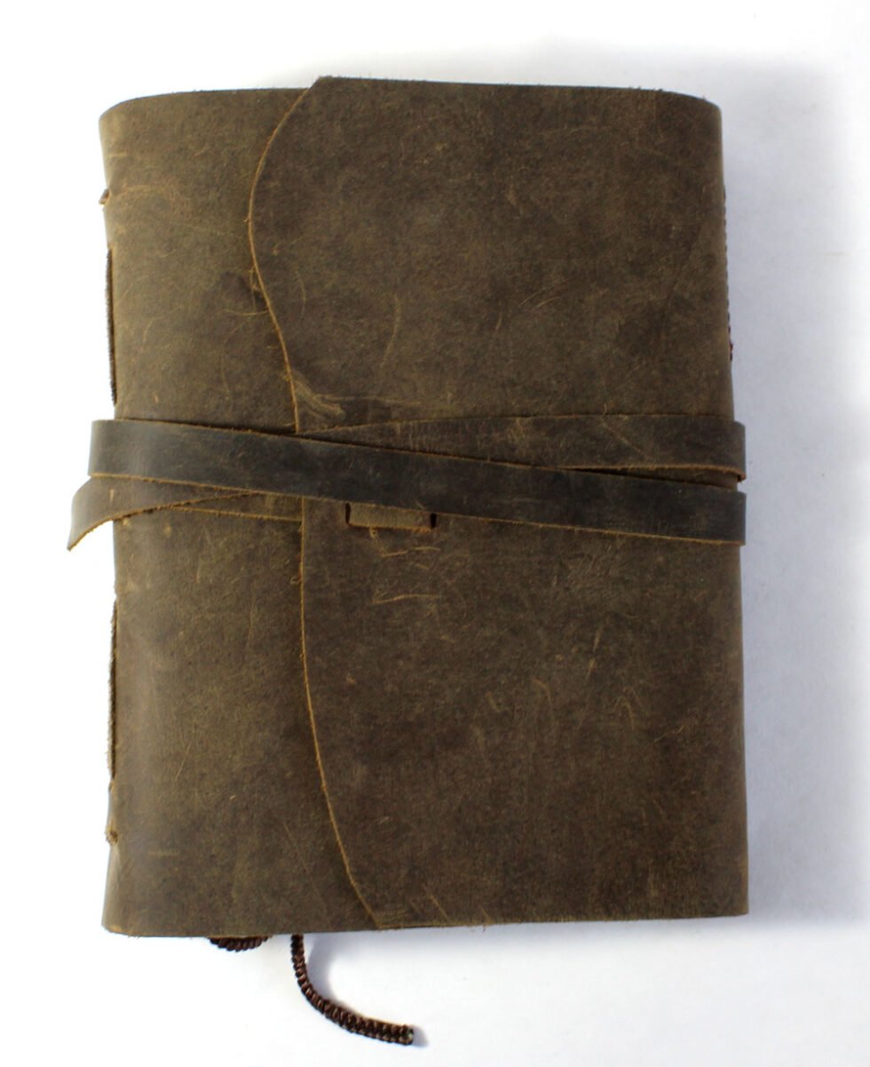 Genuine brown buffalo leather journal, fully leather-bound with 120 sheets (240 pages) of recycled cotton paper. Naturally distressed for a vintage look, featuring a printed map and travel poem inside. Rugged gypsy style with 3″ flap and strap closure — a unique travel gift!