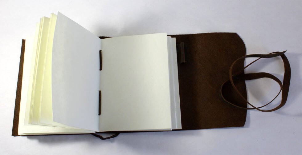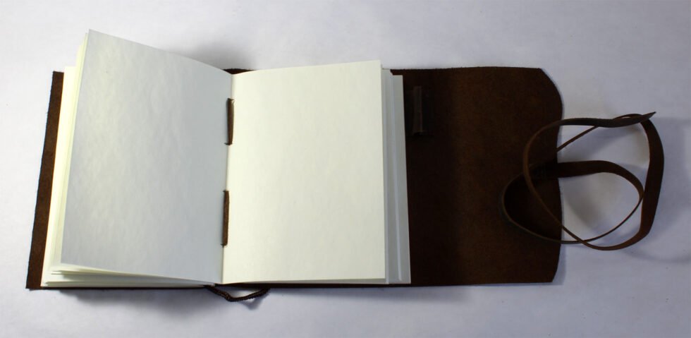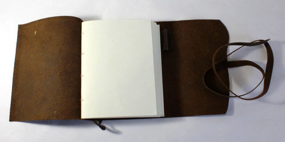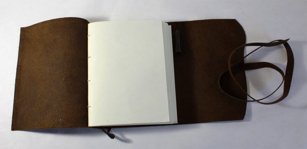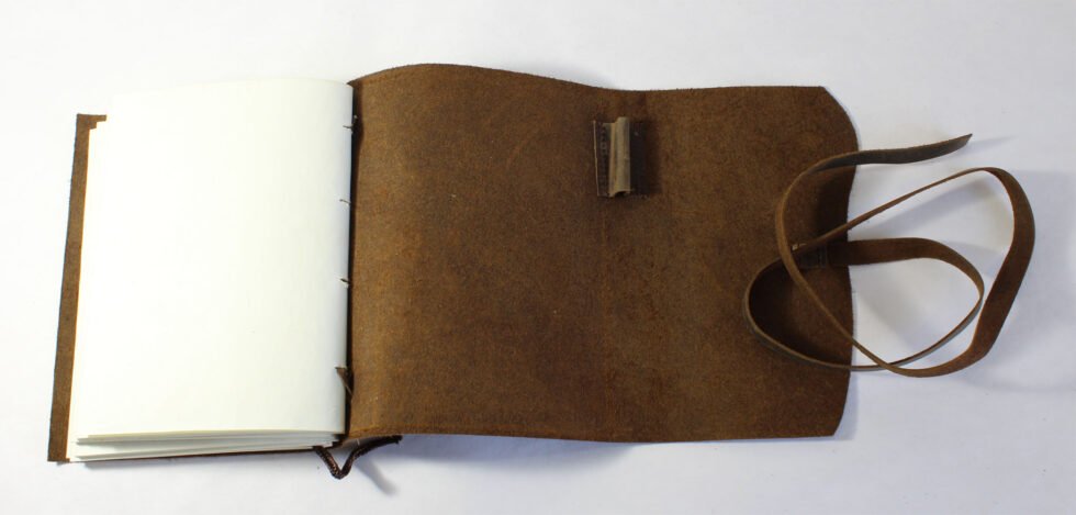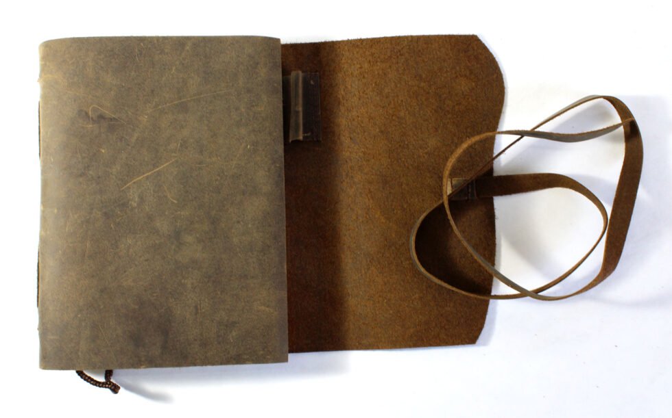 Journal made of leather & paper only as the binding strings are leather too! Soft and supple brown genuine buffalo leather journal with hard bound 120 sheets / 240 pages of recycled cotton handmade paper. Hand crafted journal with 100% natural leather. The leather is naturally distressed and tanned giving a vintage look with a coloured map and a travel poem printed inside the 2nd & 1st sheet of paper. A travel journal with rugged & gypsy look, exclusive gift! A 3″ closing flap protects the papers inside with the matching strap around it.