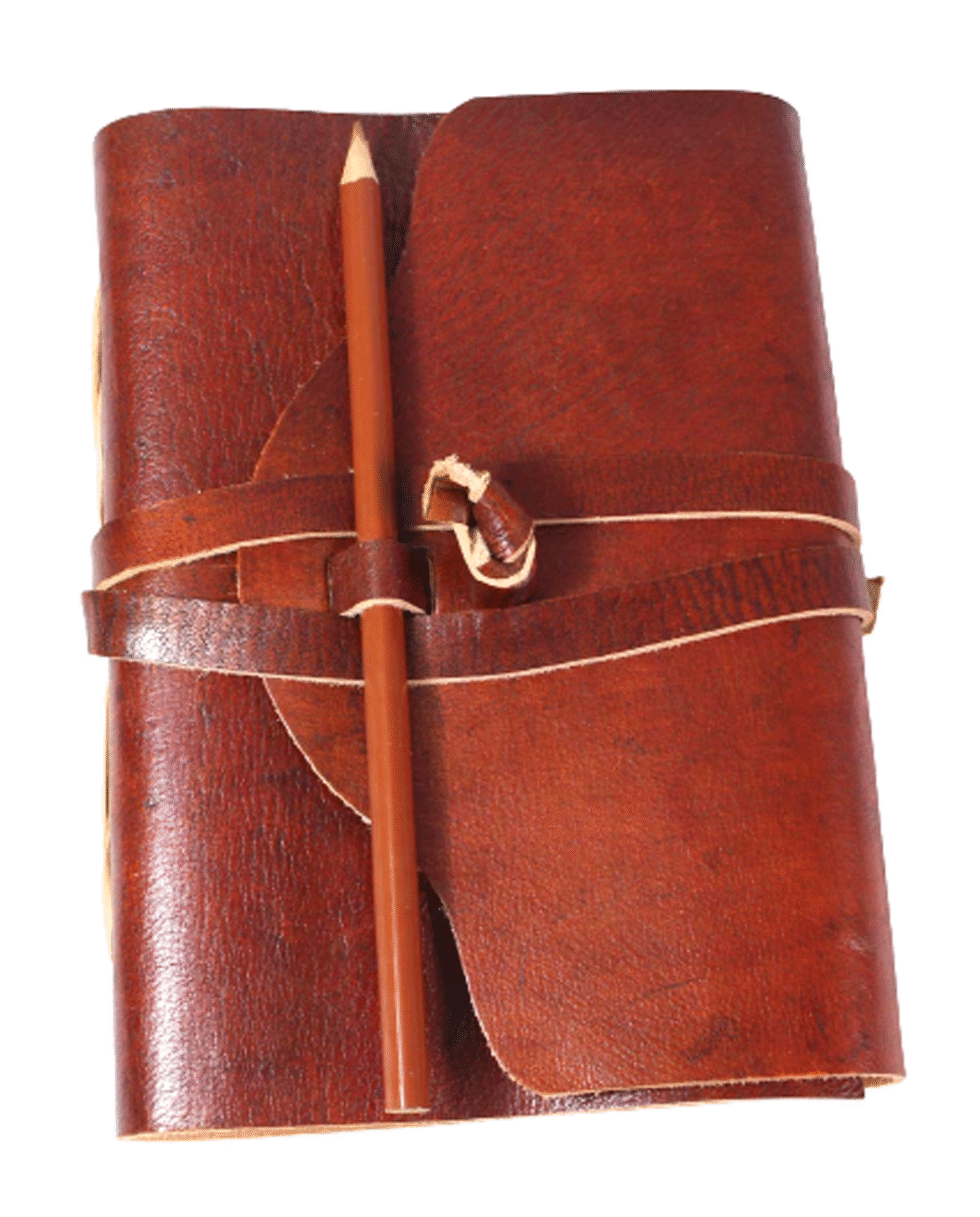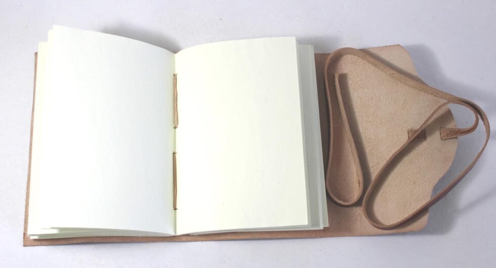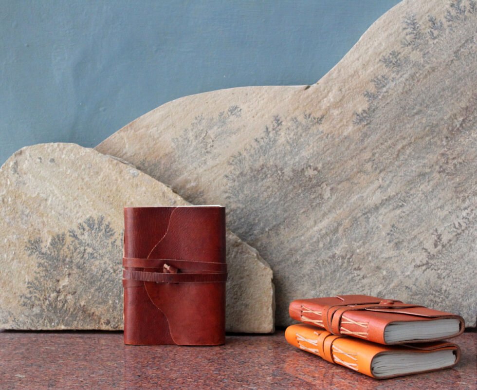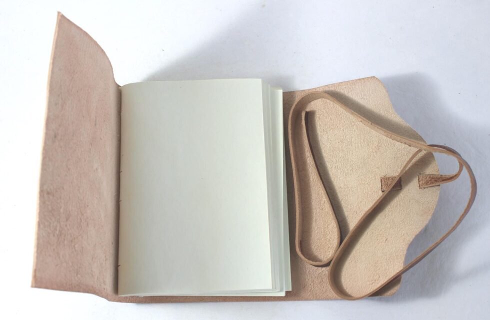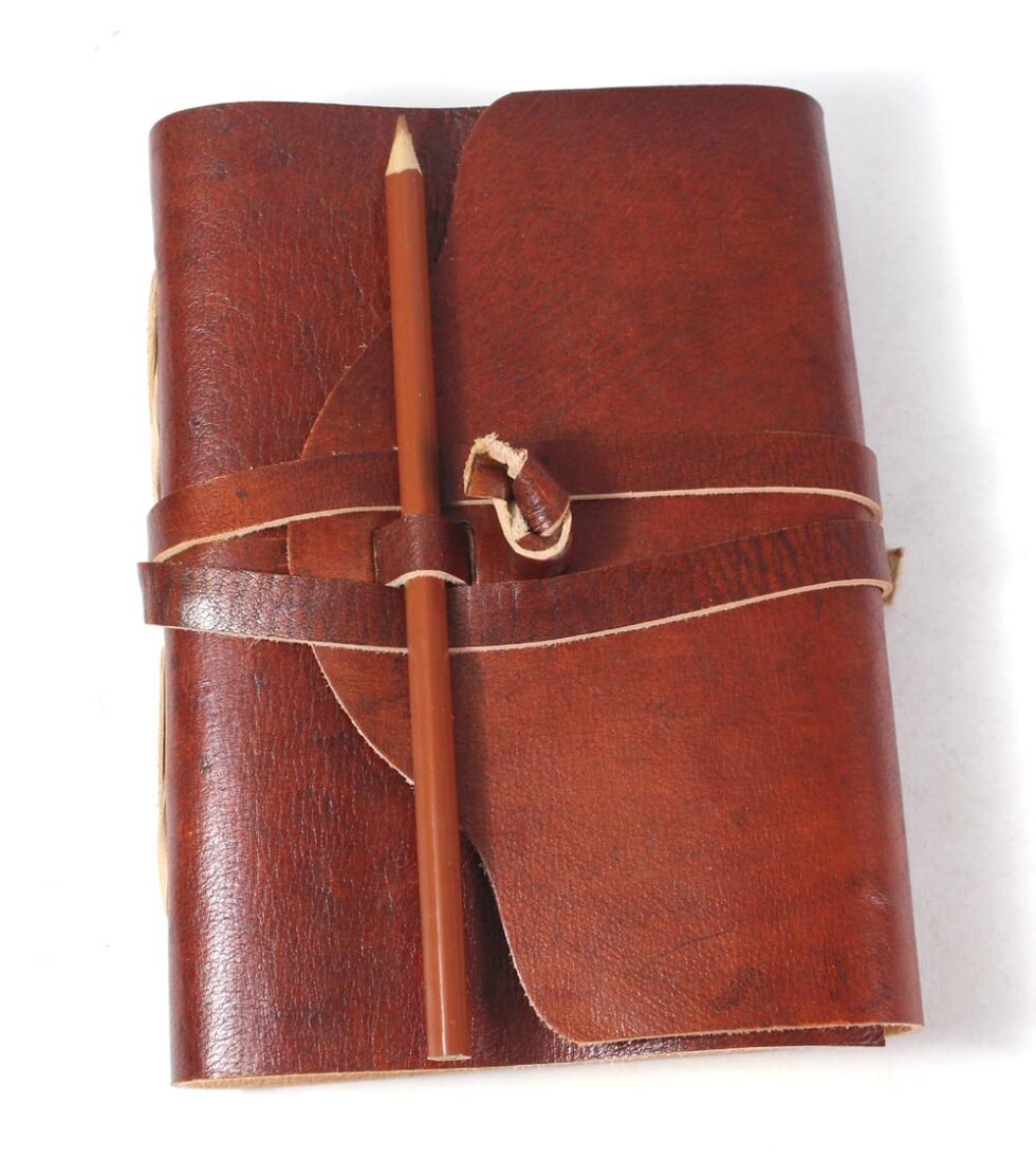 Ethnic style goat leather journal with 100 sheets / 200 pages of recycled cotton handmade paper. The gyspsy looking journal matches with the travel theme and serves a good purpose while writing on a vacation or trip…capturing all your moods and feelings inside it. The paper is smooth, absolutely wood free, acid free and never bleeds even with ink pen.