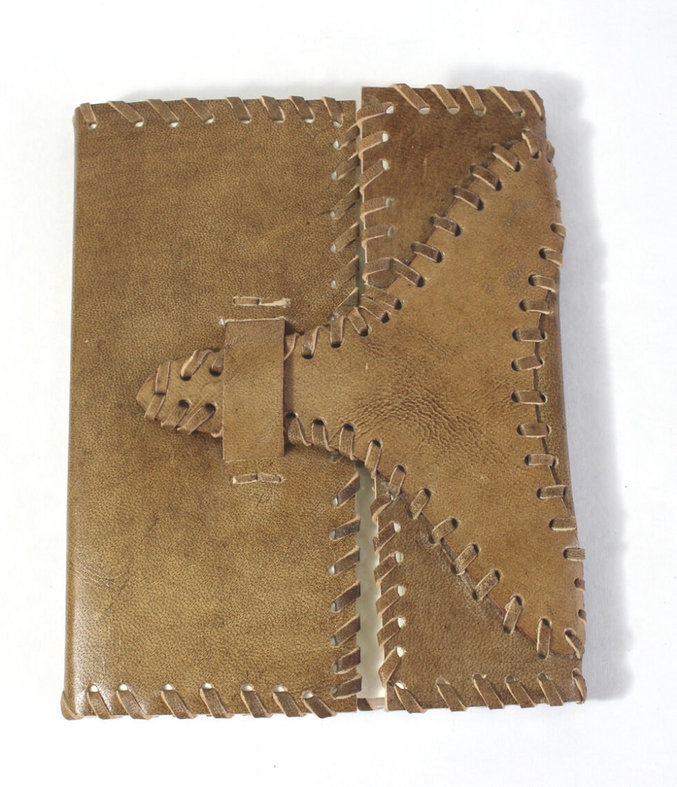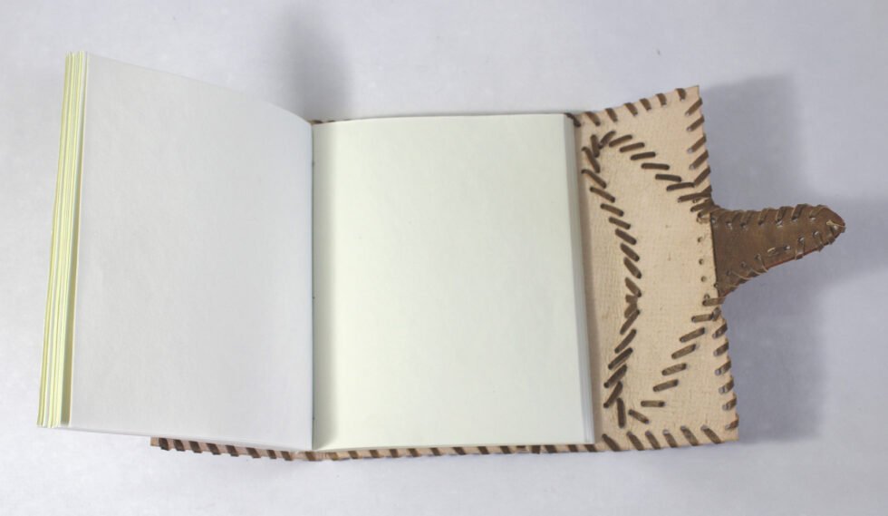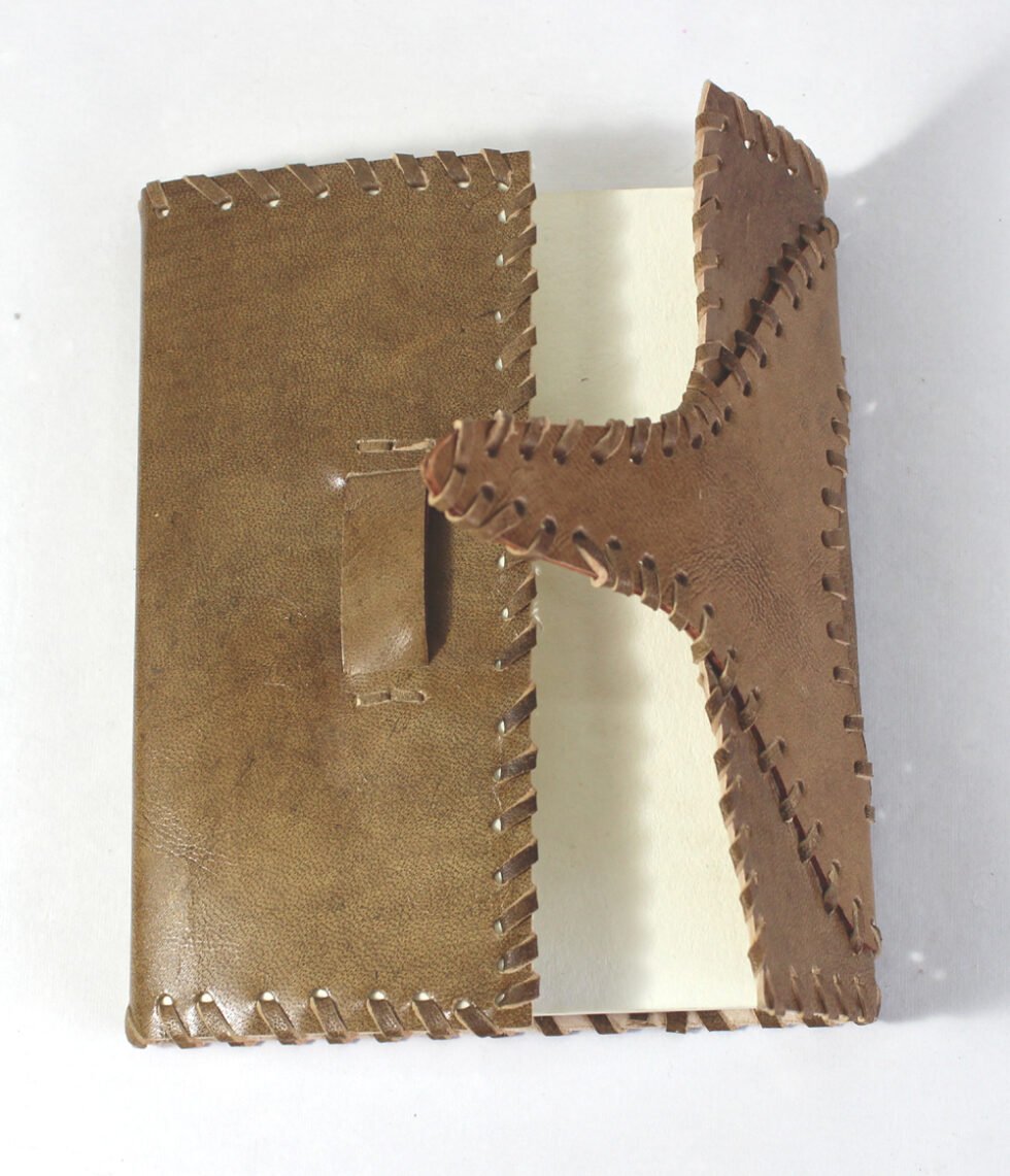 Ethnic style goat leather journal with 48 sheets / 96 pages of recycled cotton handmade paper. The gyspsy looking journal matches with the travel theme and serves a good purpose while writing on a vacation or trip…capturing all your moods and feelings inside it. The paper is smooth, absolutely wood free, acid free and never bleeds even with ink pen.