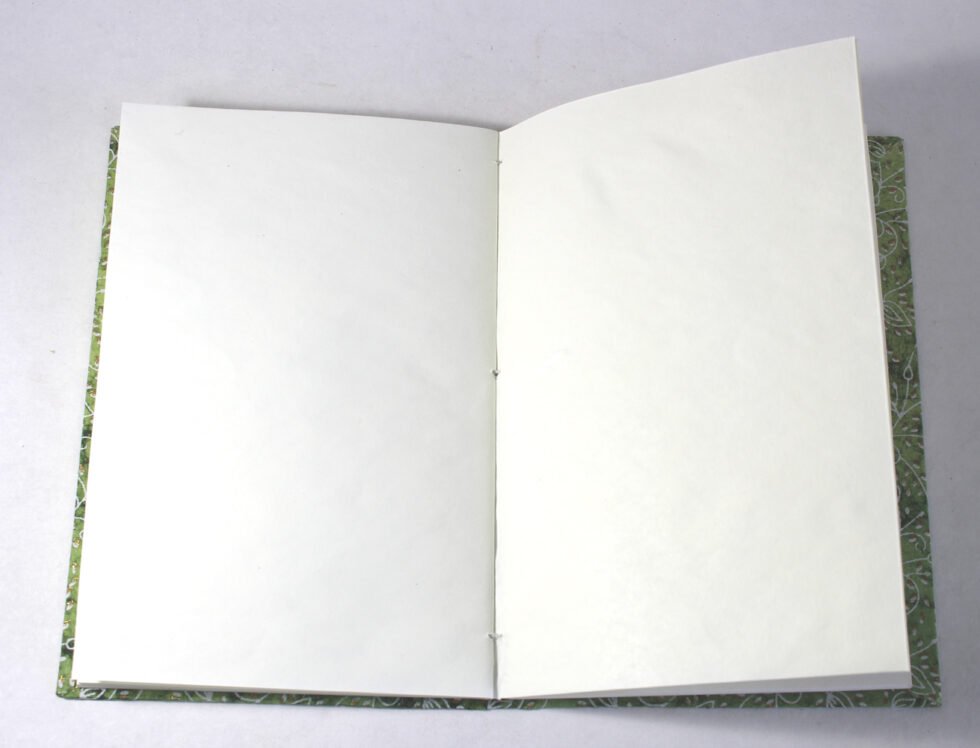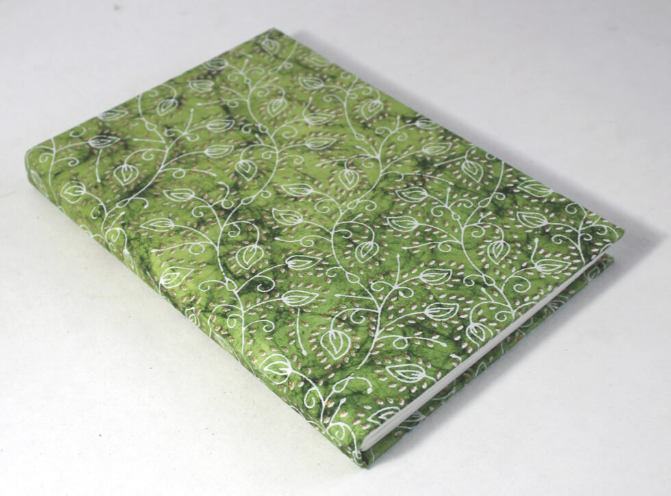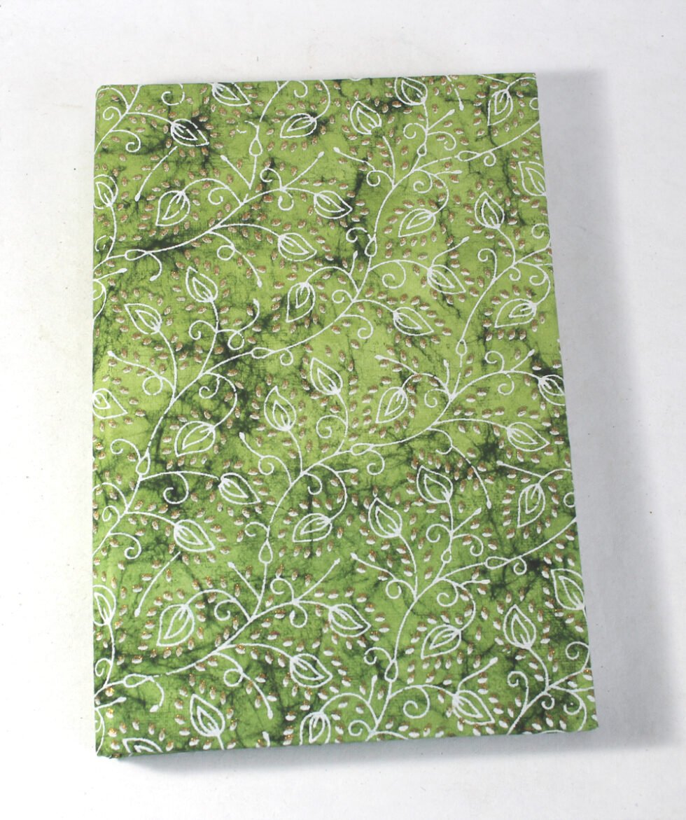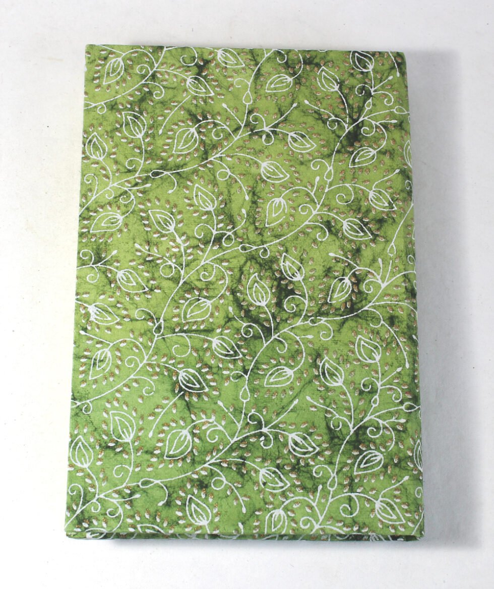 Mustard color with golden tinsels mottled inside the paper as cover. hard cover notebook with 48 sheets / 96 pages of handmade recycled cotton paper. Hand bound with specialist artisans while the paper is wood free, acid free and never bleeds while using ink pen. Wonderful green life style product – can be branded or customized and excellent teen for personal / corporate gift!