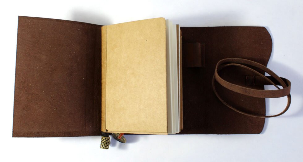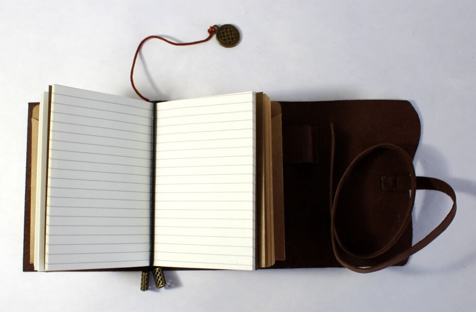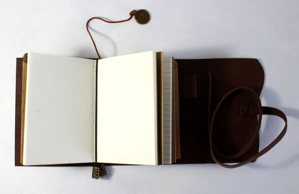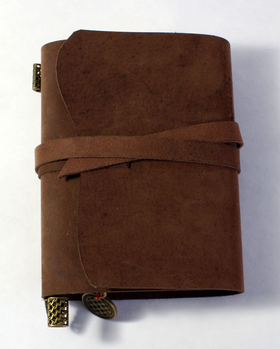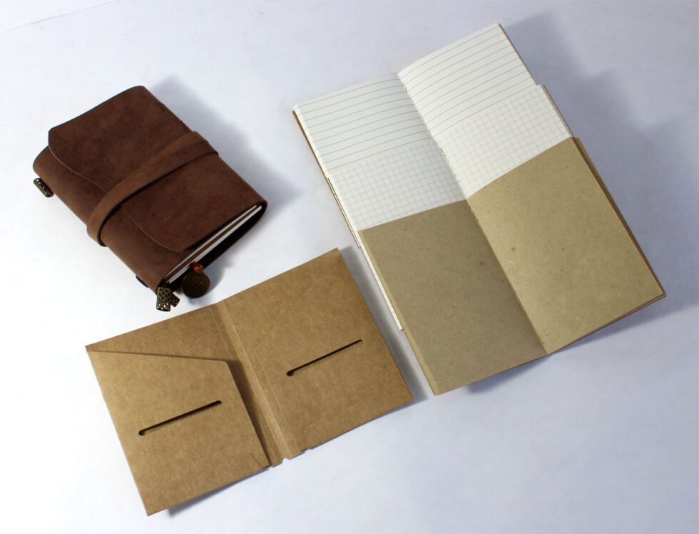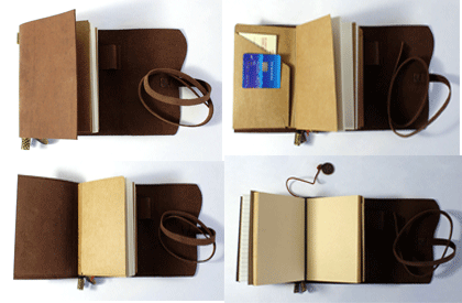 Exclusively designed pocket leather journal with hidden pen loop and paper inserts bound with elastic bands. Cover with genuine leather with supple brown shade – soft and rich, bound to stay for a life time! Totally refillable, with 3 paper packs which can be printed like dots / lines / grids / plain or light brown Kraft paper, each 30 sheets / 60 pages. Thick and sturdy Kraft folders on the front and back for accommodating documents and credit cards. Including Midori style pocket sized refill inserts, we supply all accessories as shown here. Brass beads and accessories make it truly vintage!
