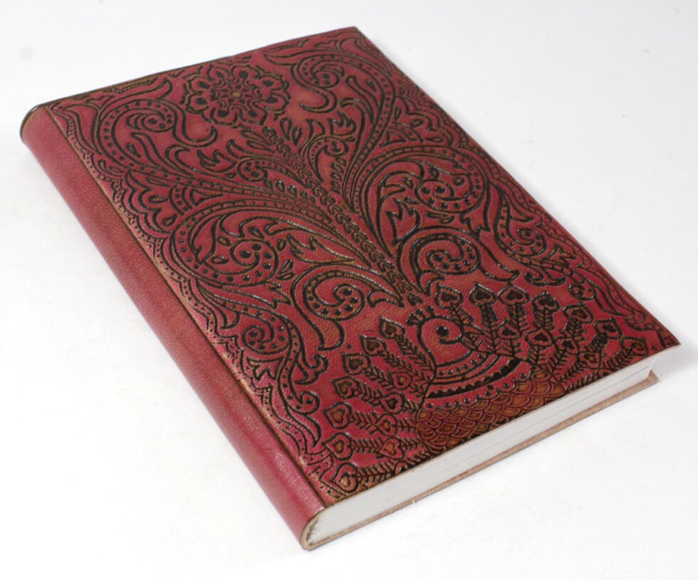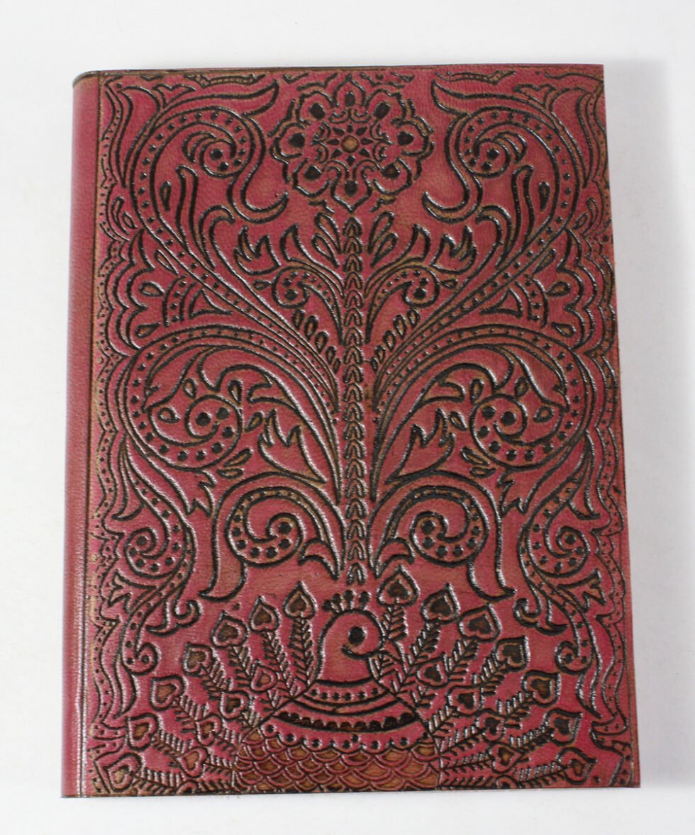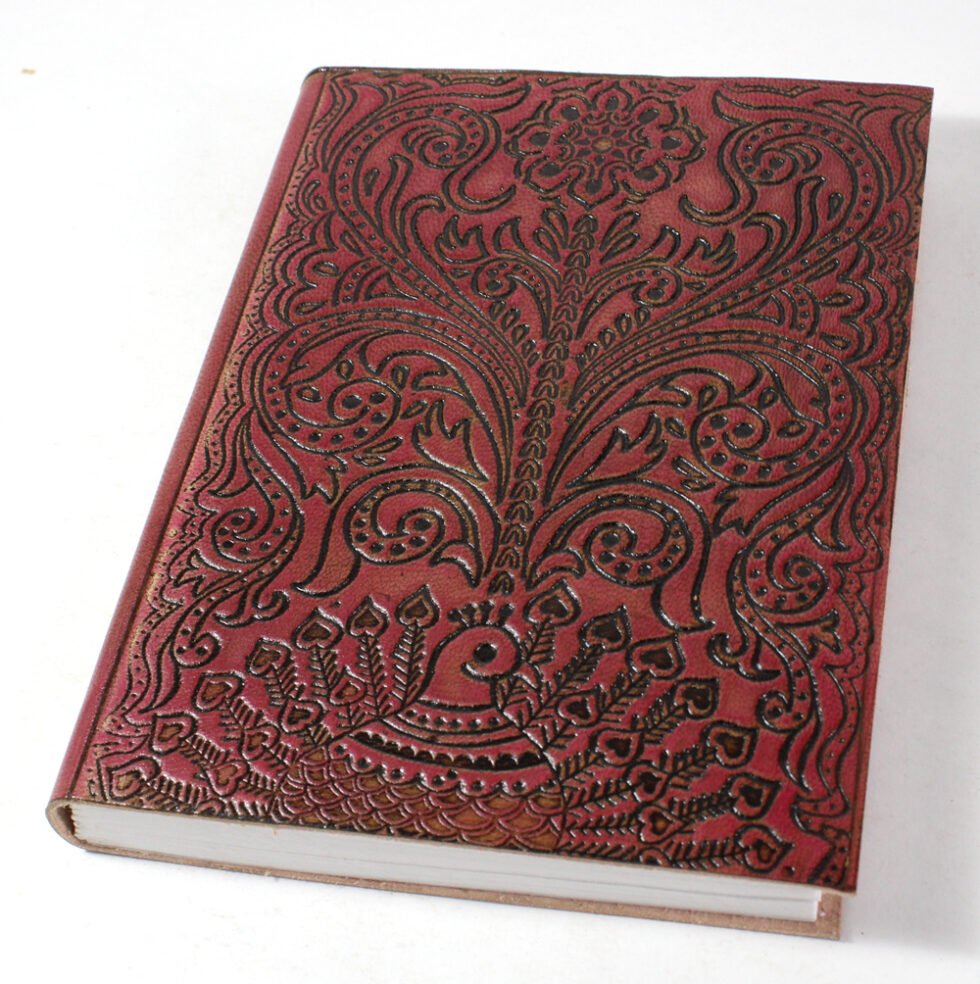 Finest quality of goat TC leather with an debossed design all over the leather cover. Later on the leather is water color dyed by expert artisans in a way that debossed design looks like ‘carved’ ones in antique fashion! The abrasion effect of leather cover makes the journal very exclusive! Inside is 72 cotton recycled paper sheets (144 pages) which is acid free, wood free and handmade. Never bleeds with ink pen!