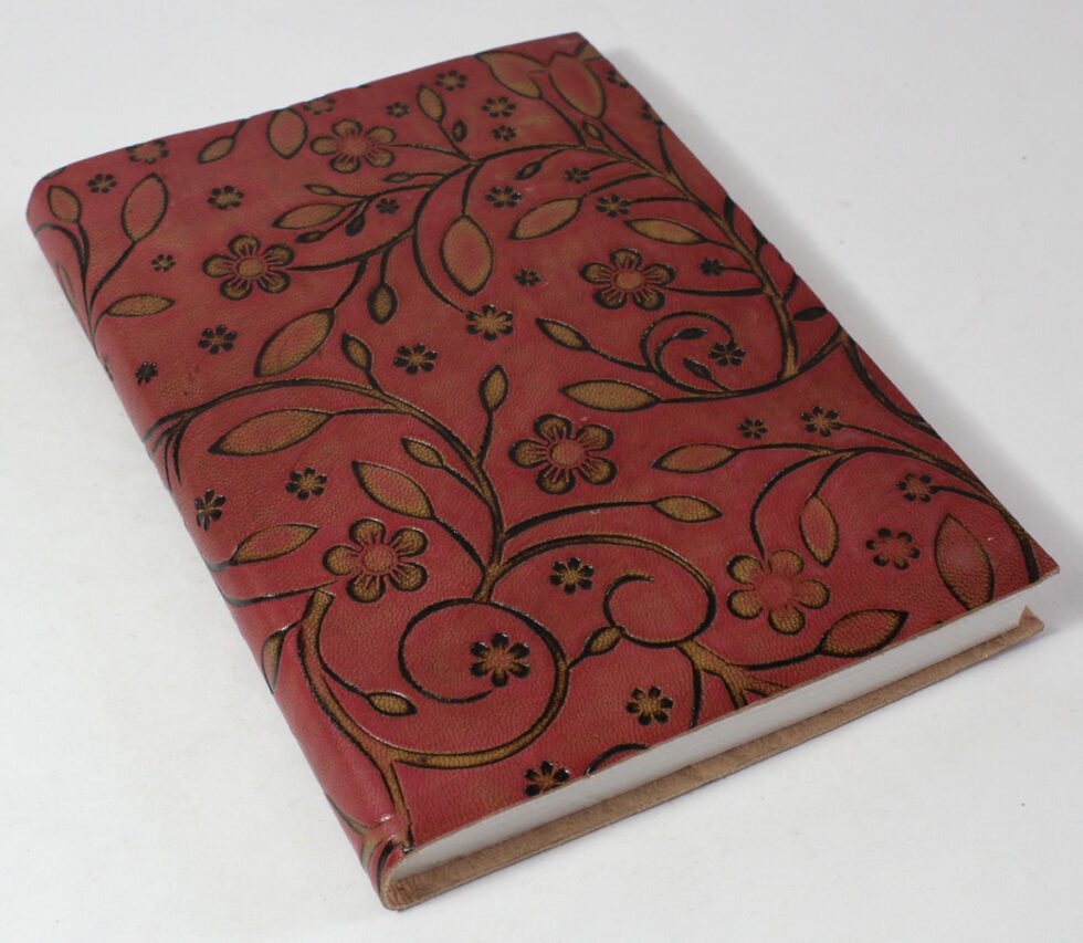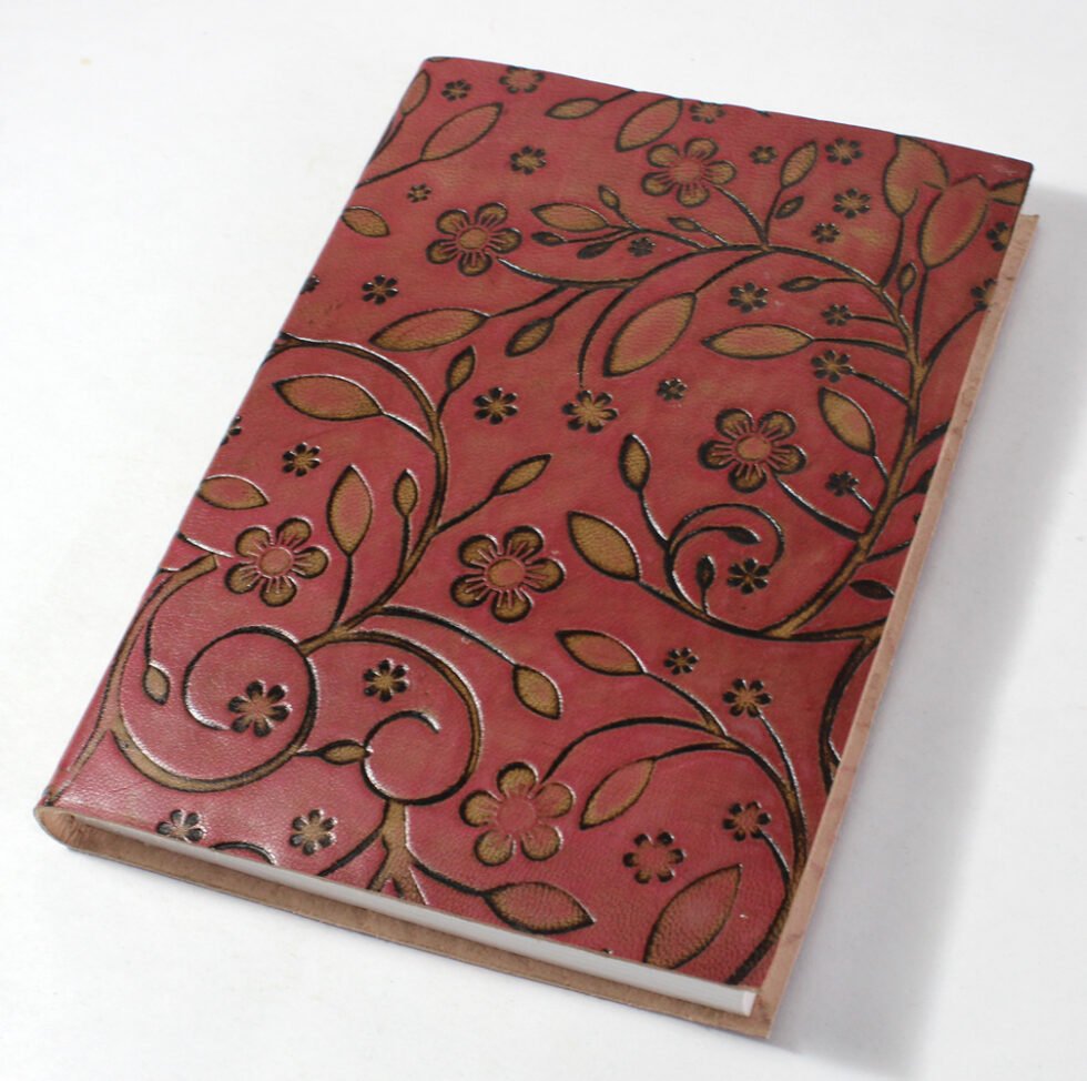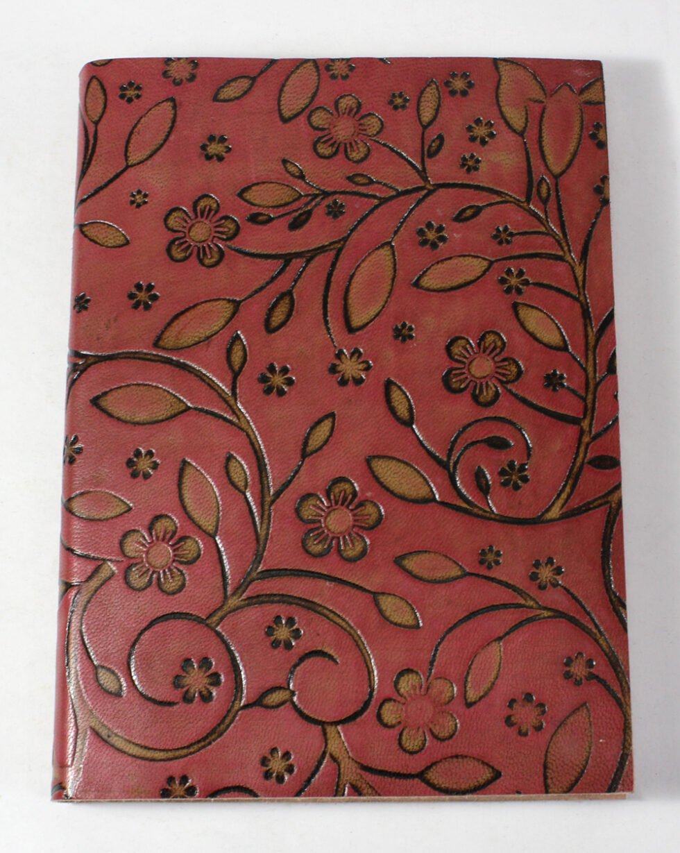 Finest quality of goat TC leather with an debossed design all over the leather cover. Later on the leather is water color dyed by expert artisans in a way that debossed design looks like ‘carved’ ones in antique fashion! The abrasion effect of leather cover makes the journal very exclusive! Inside is 72 cotton recycled paper sheets (144 pages) which is acid free, wood free and handmade. Never bleeds with ink pen!