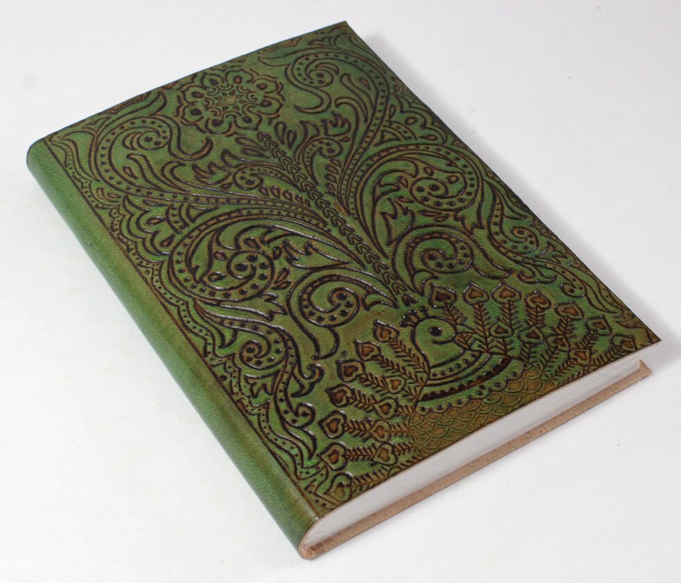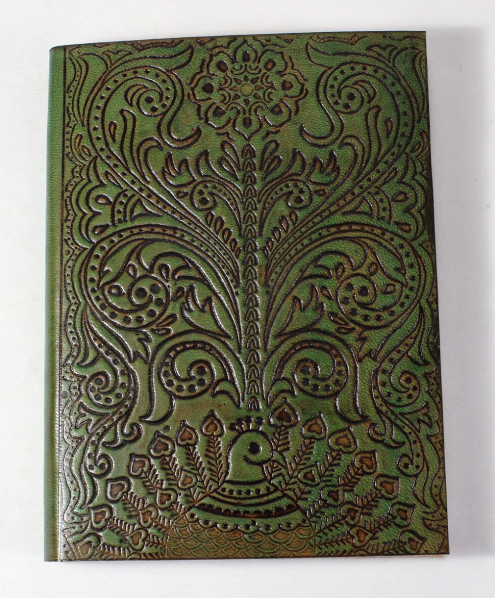 Finest quality of goat TC leather with an debossed design all over the leather cover. Later on the leather is water color dyed by expert artisans in a way that debossed design looks like ‘carved’ ones in antique fashion! The abrasion effect of leather cover makes the journal very exclusive! Inside is 72 cotton recycled paper sheets (144 pages) which is acid free, wood free and handmade. Never bleeds with ink pen!