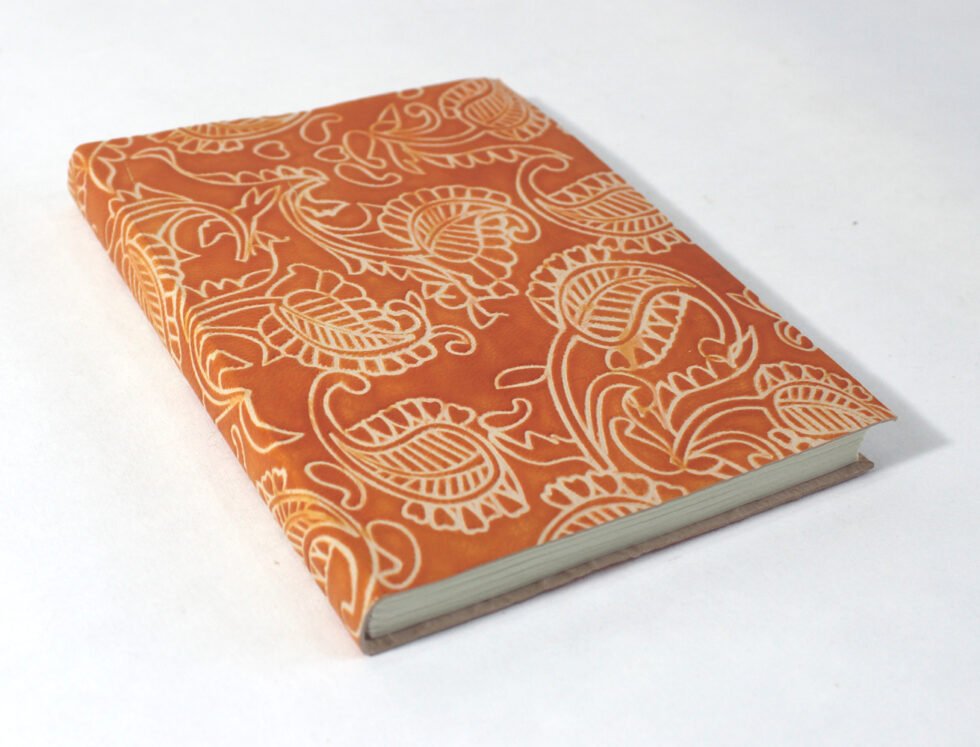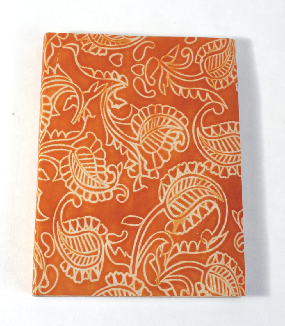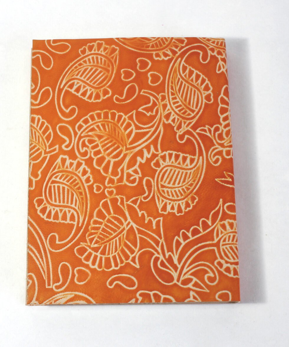 Finest quality of goat TC leather with an debossed design all over the leather cover. Later on the leather is water color dyed by expert artisans in a way that debossed design looks like ‘carved’ ones! The abrasion effect of leather cover makes the journal very exclusive! Inside is 48 cotton recycled paper sheets (96 pages) which is acid free, wood free and handmade. Never bleeds with ink pen!