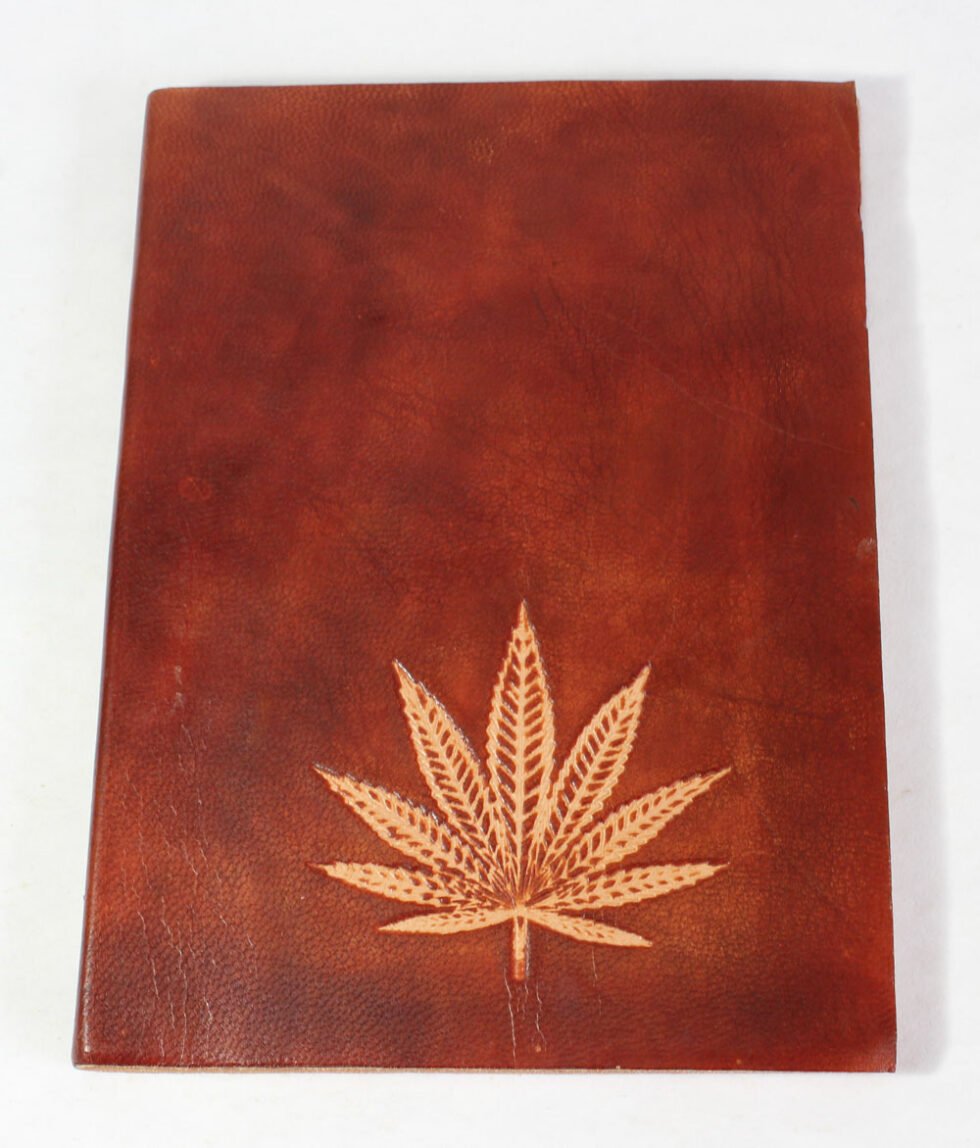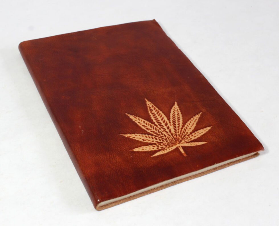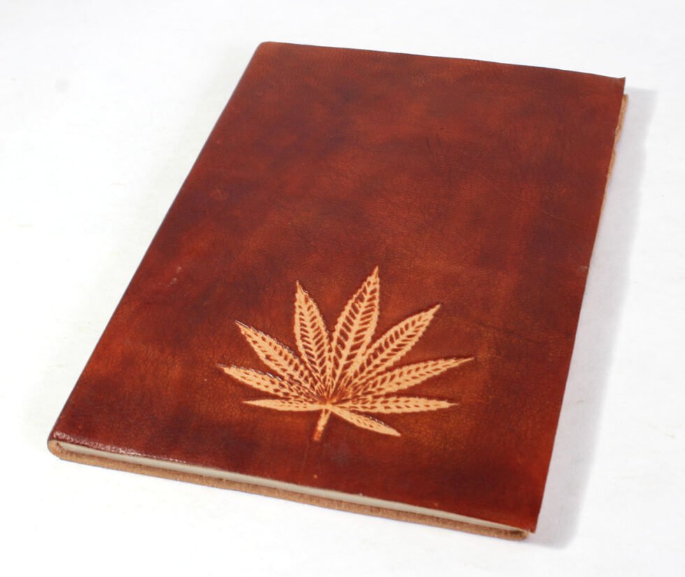 Finest quality of goat TC leather with an debossed hemp leaf. Later on the leather is water color dyed by expert artisans in a way that debossed leaf looks like ‘carved’ leaf! The abrasion effect of leather cover makes the journal very exclusive! Inside is 48 cotton recycled paper sheets (96 pages) which is acid free, wood free and handmade. Never bleeds with ink pen!