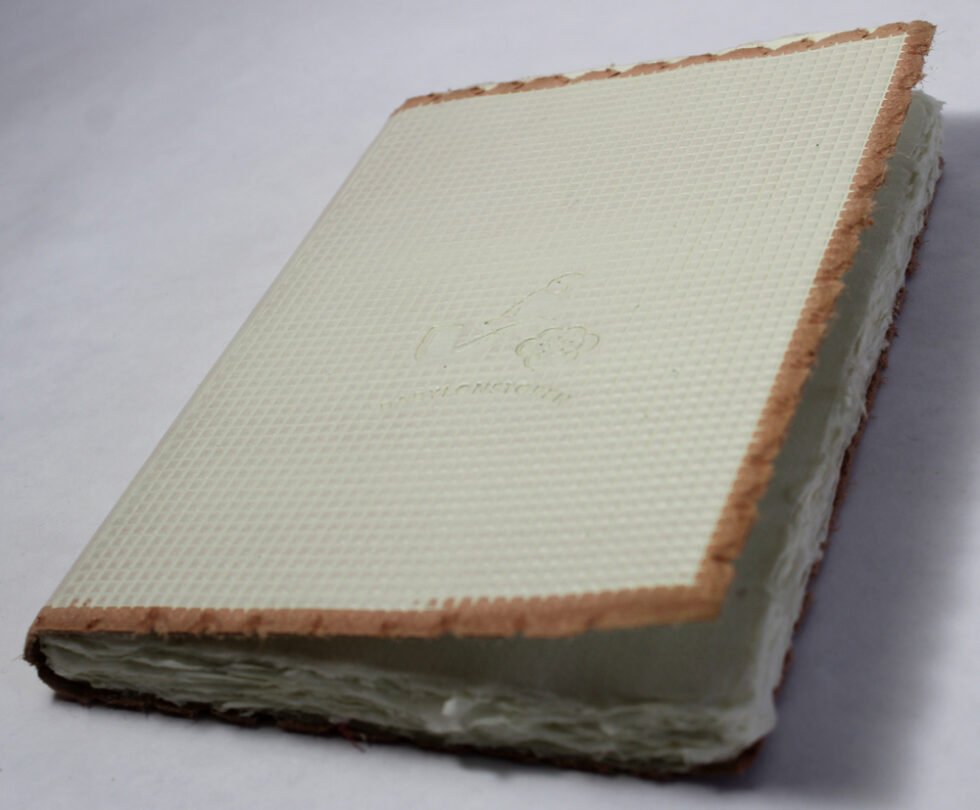 Finest quality of goat TC leather with an embossed design all over the leather cover in a form of hessian fabric. Later on the leather is pigment dyed by expert artisans. The edges of the journals are made ‘look’ natural. Inside is 72 cotton recycled paper sheets (144 pages) which is acid free, wood free and handmade. Never bleeds with the ink pen!